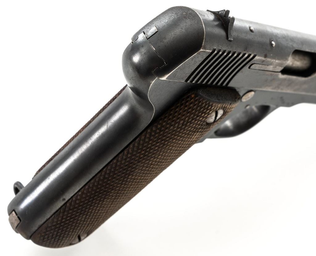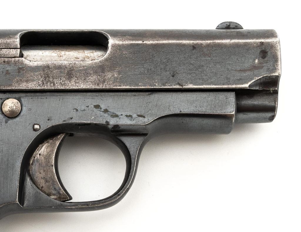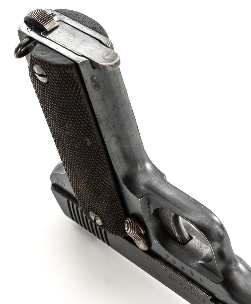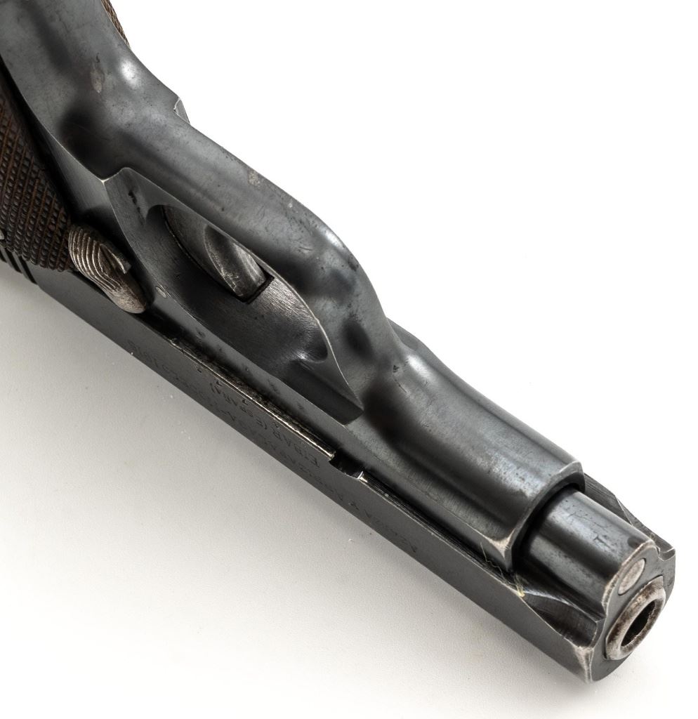 French Military Marked Spanish Model 1916 Ruby Semi-Automatic Pistol, #24773, .32 ACP cal., 3.5" barrel, blued finish, checkered hardwood grips, blade front sight, fixed rear sight with "V"-notched groove, and fixed lanyard loop at left side of the frame. Includes one blued steel magazine, stamped "A.A" on the floorplate, with a "(sunburst symbol)" on the spine. Pistol is marked "AZANZA Y ARRIZABALAGA-MODELO 1916/EIBAR(ESPANA)" on left side of the slide. Marked "A.A" on left side of the frame. There are two French "(military stars)" stamped on the bottom of the frame. No visible import marks. Condition overall is good, retaining approx. 60% blue, showing general age and handling wear. Grips are very good, with handling marks, mainly to the left side. Action operates smoothly. Bore is bright with good, defined rifling. Est.: $250-$400. (C&R/PPT)