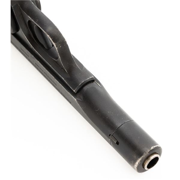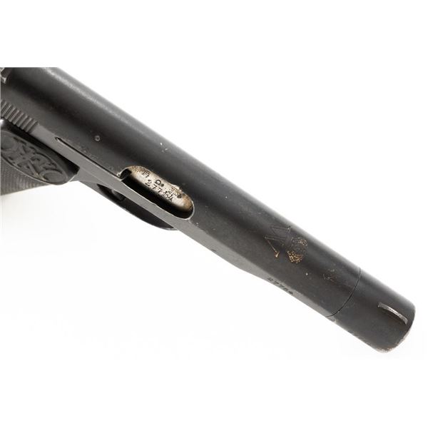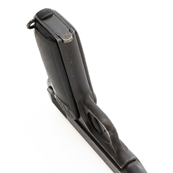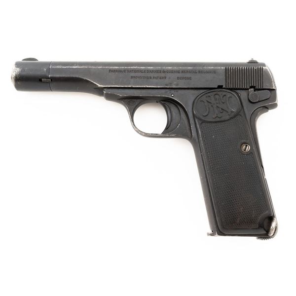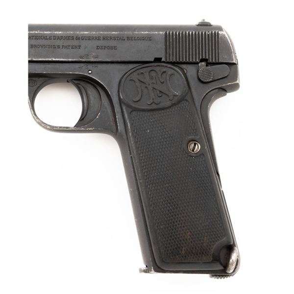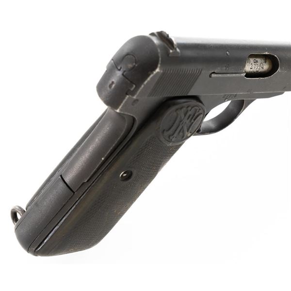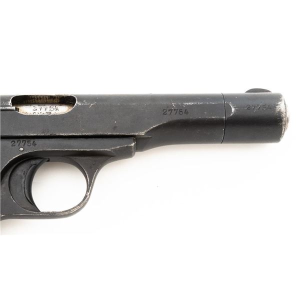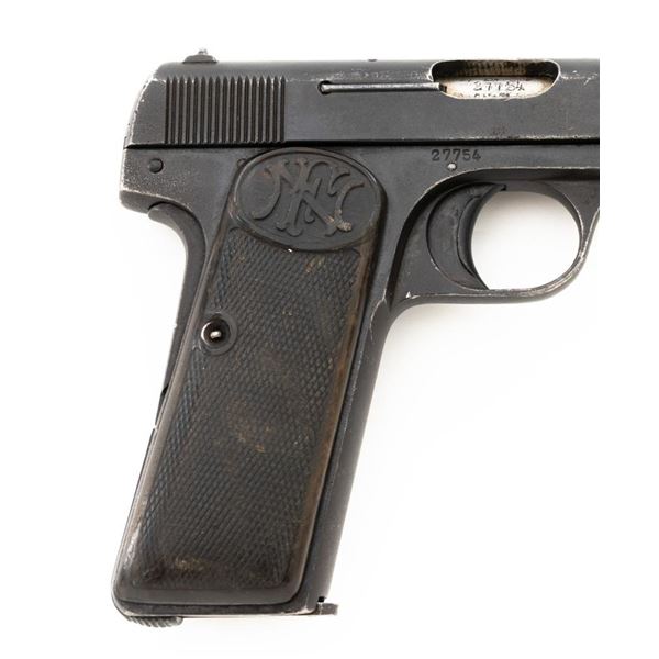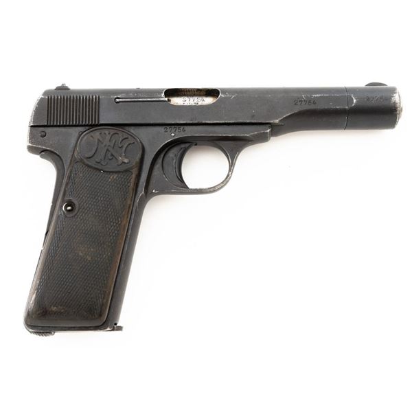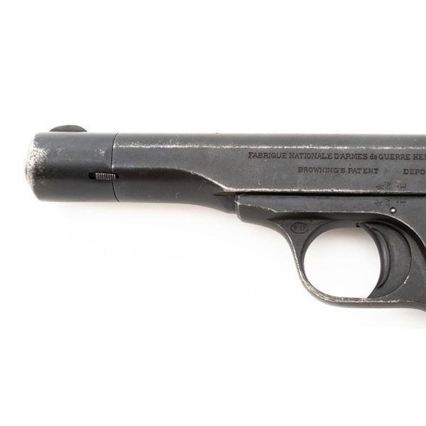 Browning/FN Model 1922 Dutch Contract Semi-Auto Pistol, #27754, .380 ACP cal., 4.5" barrel, blue finish, checkered composite two-piece FN monogram grips, lanyard loop, with one 9-round blued steel magazine. Magazine is numbered but does not match the pistol. Numbers on the pistol itself are matching. Factory markings are clear, with numerous Belgian proofs and a large "(crown)/W" for Queen Wilhelmina on top of the slide. No visible import markings. Pistol is in very good overall condition, retaining approx. 80%-85% thinning finish, with wear at the muzzle, holster wear along the slide and frame, and some areas of light surface erosion. Straps have drifted to a dark, even patina. Grips are in very good condition, with areas of flattening of the checkering detail, and handling marks. Action is crisp. Bore is good with scattered spots of erosion, rifling is clearly defined. These pistols were standard issue for the Dutch Army during WWII and part of approx 60,000 pistols purchased by the Dutch during the 1920s and 30s. Est.: $400-$600. (C&R)
