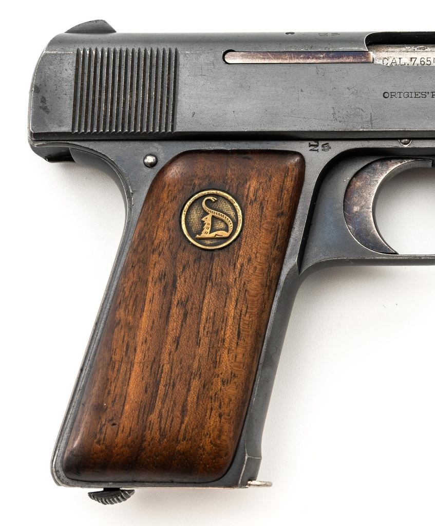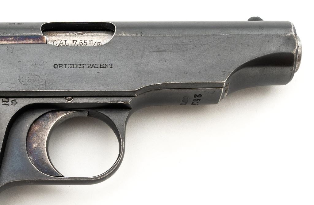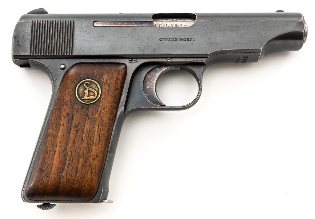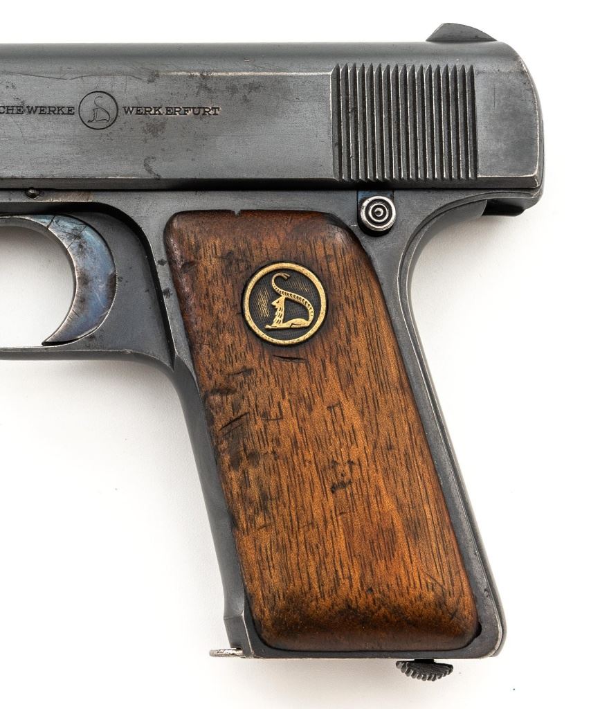Deutsche Werke Ortgies Semi-Automatic Pistol, #251584, .32 ACP cal., 3.5" barrel, blued finish, smooth hardwood grips with round brass inserts depicting the "Crouched Cat" Deutsche Werke logo on each side, blade front sight, and fixed rear sight with "U"-notched groove. Includes one bright steel magazine with factory logo and "CAL.7,65". Left side of the slide is marked "DEUTSCHE WERKE/(logo)/WERK ERFURT" and the right side "ORTGIESPATENT". Barrel at the ejection port is stamped "CAL.7,65 mm". There are "(crown)N" stamps on the frame, slide, and barrel. Marked "GERMANY" on the frame. Condition overall is good, retaining 70%-75% blue, showing handling marks and dark toning to the slide; scattered spots of patina to the frame, slide, and trigger. Right side grip shows moderate age and handling wear, with more blemishes and a chip to the left grip. Slide operates smoothly but the pistol does not appear functional and the safety button will not engage or release. Bright bore rates very good, with clearly defined rifling. Est.: $150-$300. (C&R/PPT)