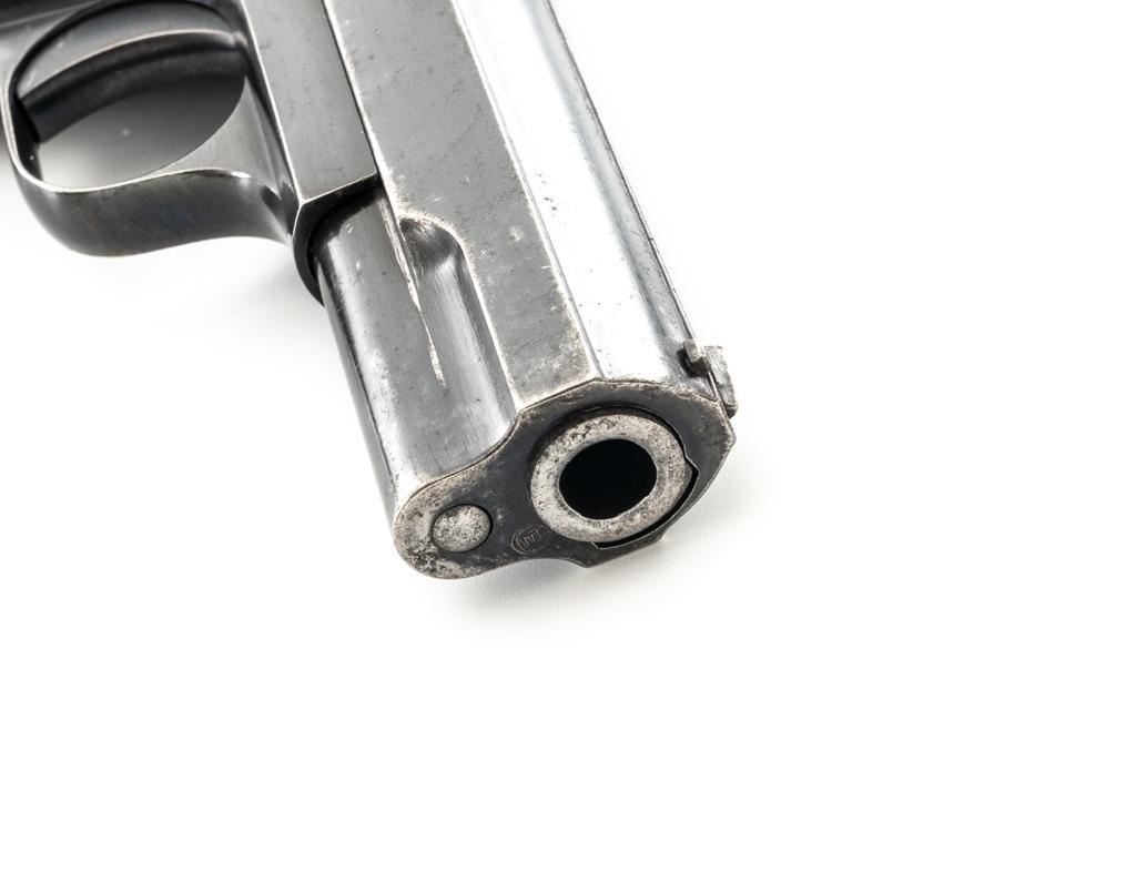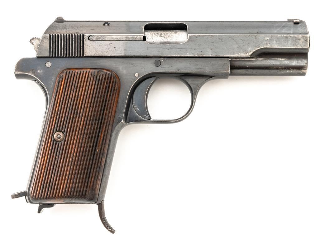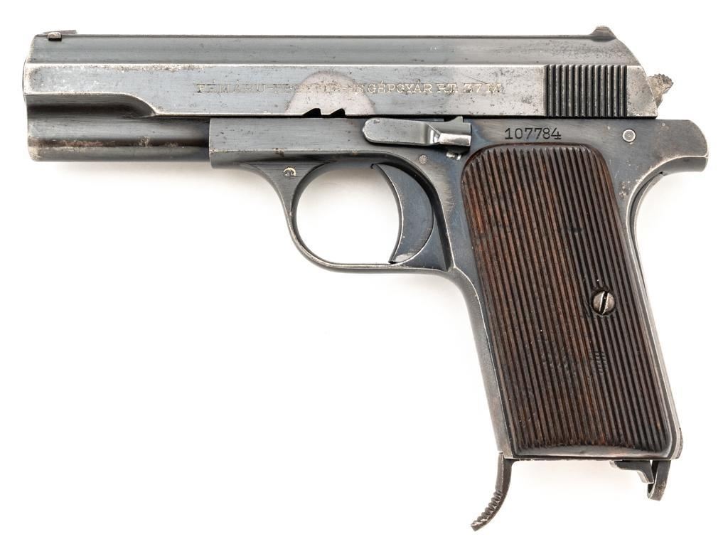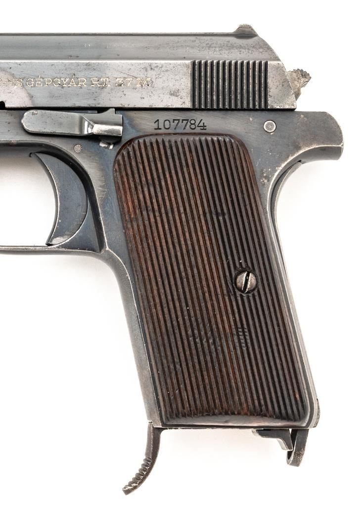 Hungarian Femaru 37M Semi-Automatic Pistol, #107784, .380 ACP cal., 3.93" barrel, blued finish, hardwood grips with vertical grooves, dovetailed inverted-"V" front sight, fixed rear sight with "V"-notched groove, and swiveling lanyard loop. Inc.udes one blued steel magazine with finger rest, marked "37M" on the floorplate. Left side of the slide is marked "FEMARU-FEGYVER-ES GEPGYAR R.T.37M.", with a "(St Stephens crown)" acceptance mark at left side of the trigger guard. No visible import marks. Condition overall is very good, retaining approx. 80% blue, showing areas of light edge wear, fine pitting, and a brown toned area to left side of the slide. There is fine pitting and patina to the grip straps. Grips are good, showing age and handling wear, with a more noticeable dent to the bottom of the right grip. Action operates smoothly. Bore rates good with darkening in the grooves and well-defined rifling. Est.: $400-$600. (C&R/PPT)