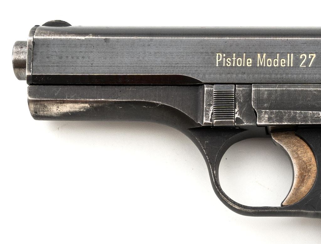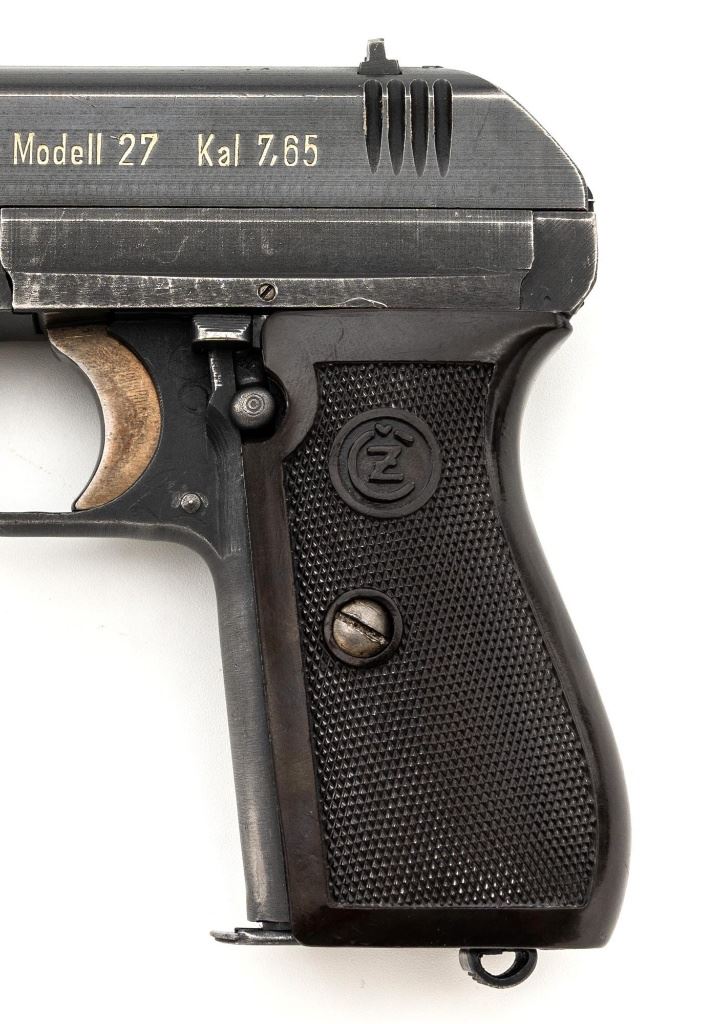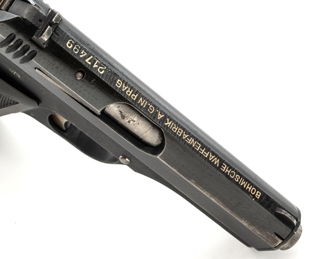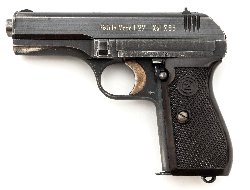 German Occupation Czech CZ 27 Semi-Automatic Pistol, #217499, .32 ACP cal., 3.9" barrel, blued slide with phosphate frame, straw colored small parts, checkered dark red plastic one piece grip embossed with "CZ" logos on both sides, blade front sight, and fixed rear sight with "V"-notched groove. Includes one phosphate finished magazine, marked "P.Mod.27" on the floorplate. Magazine with a shallow dent to the floorplate. Top of the slide is marked "BOHMISCHE WAFFENFABRIK A.G.IN PRAG" with "Pistole Modell 27 Kal 7,65" on the left side. Right side of the frame is stamped with an "(eagle)/WaA 76" Waffenamt. There is a "(eagle/swastika)" Nazi firing proof on the barrel at the ejection port. No visible import marks. Condition overall is fine, retaining approx. 85%-90% blue, showing some areas of thinning, edgewear, and handling marks to the frame and slide. Extractor has patina to the forward edge, hammer and trigger show toning. Grip with scattered light scratches and handling marks. Action operates smoothly. Bore is bright with very good rifling. Est.: $350-$550. (C&R/PPT)