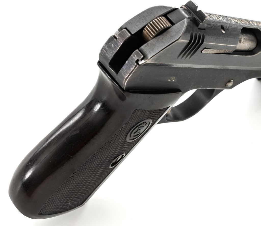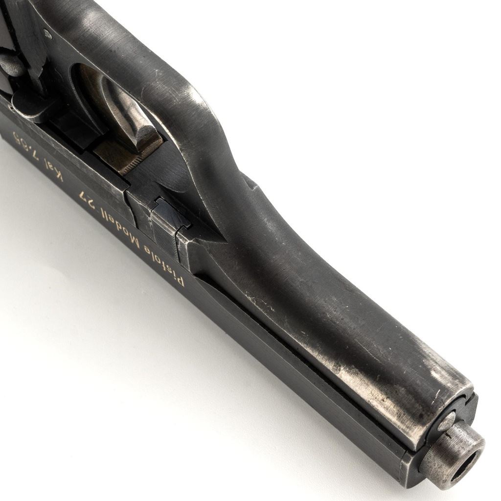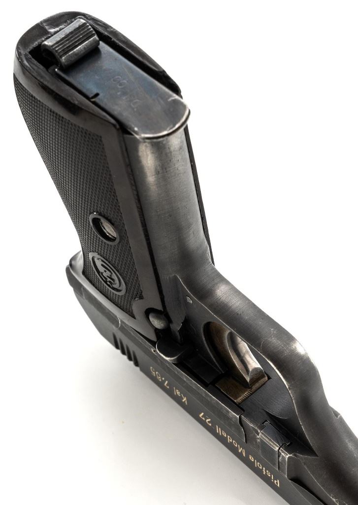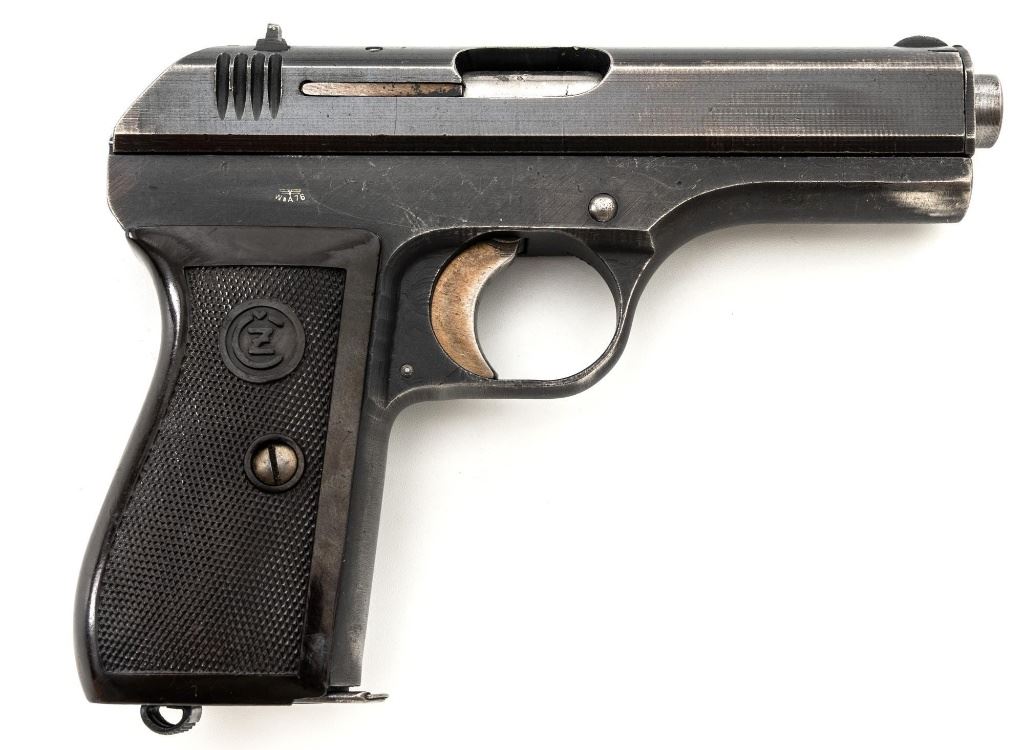German Occupation Czech CZ 27 Semi-Automatic Pistol, #217499, .32 ACP cal., 3.9" barrel, blued slide with phosphate frame, straw colored small parts, checkered dark red plastic one piece grip embossed with "CZ" logos on both sides, blade front sight, and fixed rear sight with "V"-notched groove. Includes one phosphate finished magazine, marked "P.Mod.27" on the floorplate. Magazine with a shallow dent to the floorplate. Top of the slide is marked "BOHMISCHE WAFFENFABRIK A.G.IN PRAG" with "Pistole Modell 27 Kal 7,65" on the left side. Right side of the frame is stamped with an "(eagle)/WaA 76" Waffenamt. There is a "(eagle/swastika)" Nazi firing proof on the barrel at the ejection port. No visible import marks. Condition overall is fine, retaining approx. 85%-90% blue, showing some areas of thinning, edgewear, and handling marks to the frame and slide. Extractor has patina to the forward edge, hammer and trigger show toning. Grip with scattered light scratches and handling marks. Action operates smoothly. Bore is bright with very good rifling. Est.: $350-$550. (C&R/PPT)