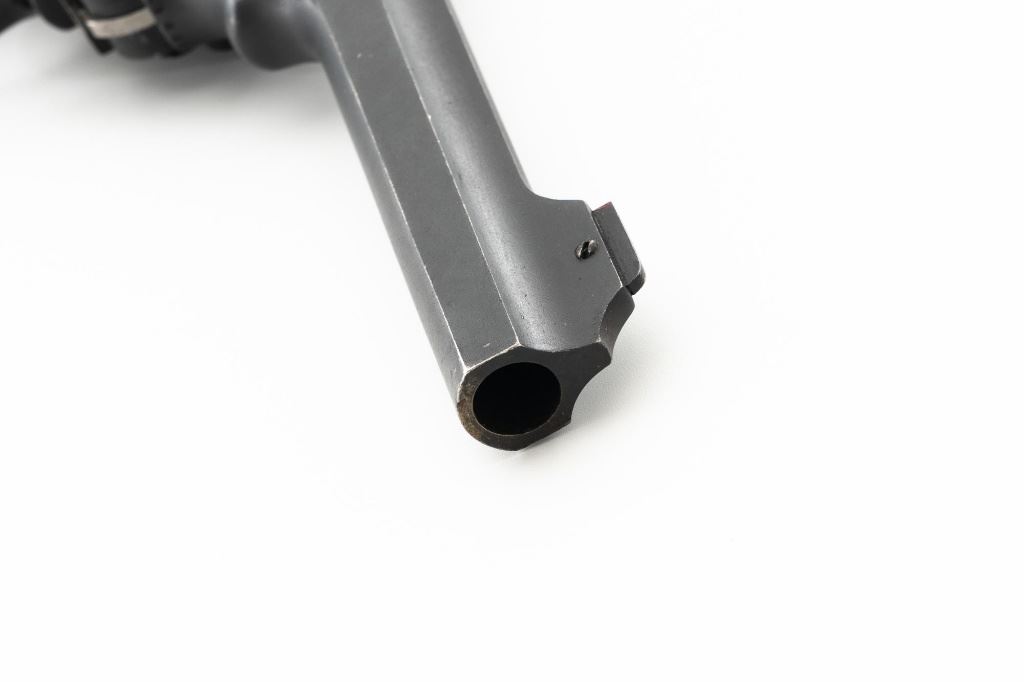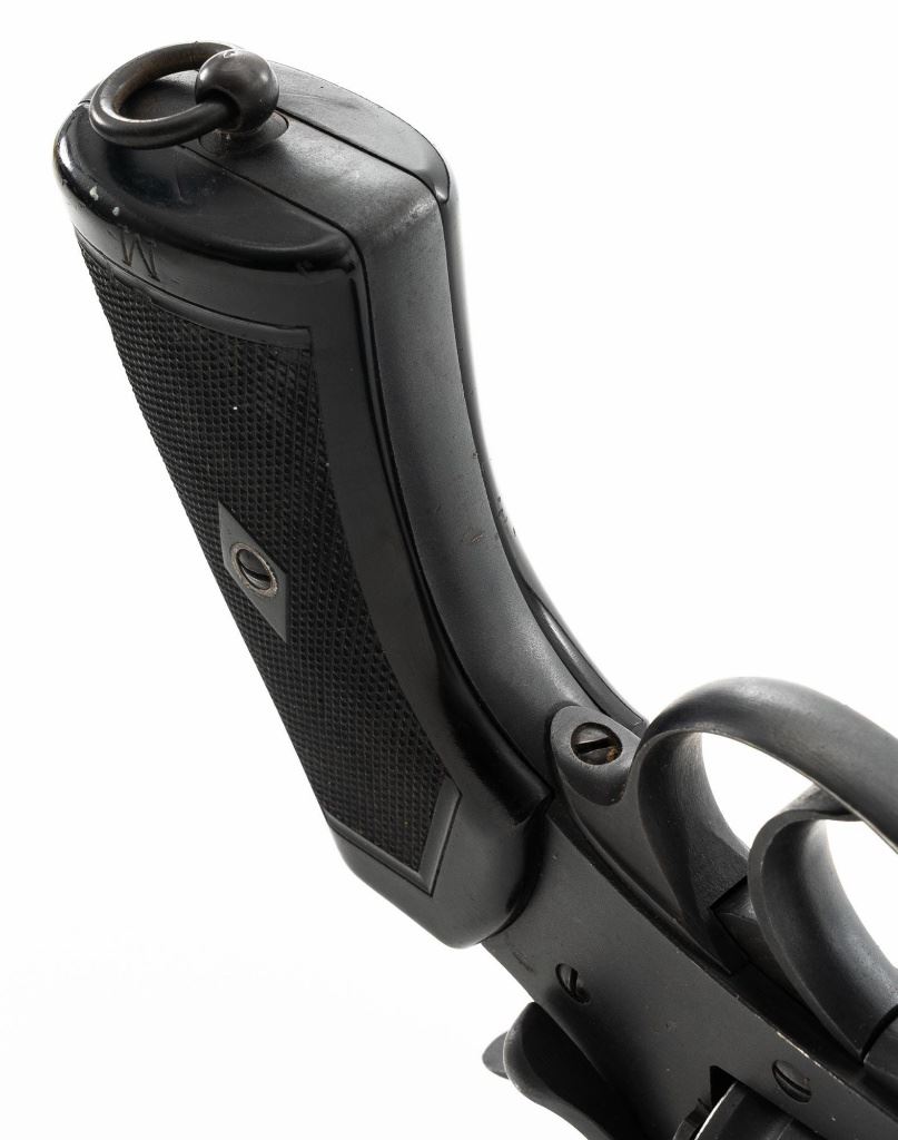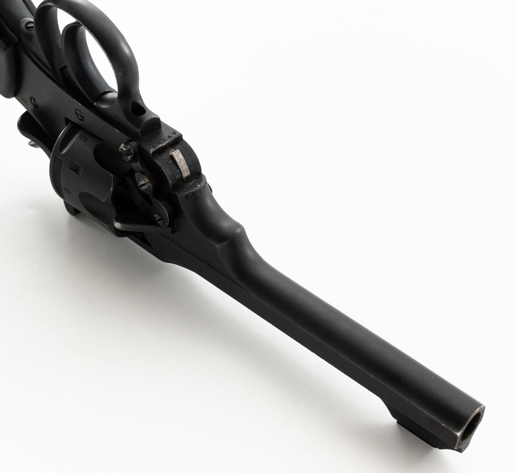 British Mk VI Enfield Double Action Revolver with Holster, #A7683, .45 ACP cal., 6" flat sided barrel, blued finish, black plastic grips marked with "M" on both sides, dovetailed blade front sight with added red paint, fixed rear sight with "U"-notched groove, and a swiveling lanyard ring. The commercial brown leather open top holster is marked "Winfield" on the rear. Holster is in good condition, with scuffs, age cracks, and some darkening to the leather. All stitching and fittings are present. Pistol was importer converted to .45 ACP cal. by machining off the rear of the cylinder. Right side of the frame is marked "ENFIELD/MK(crown)VI/1926". Marked "26(in service)/(firing proof)/(broad arrow)/(Enfield inspection stamp)" on left side of the barrel strap. Pistol was in Australian service and is stamped with "(broad arrow)D" property stamps on left side of the barrel and frame. Rack number "5/131" is stamped on the rear grip strap. Matching numbers on frame and barrel; cylinder does not match. No visible import marks. Condition overall is fine, retaining over 95% reblued finish, with light wear around the muzzle. Grips are fair, showing handling marks and wear to the checkering. action locks up, cycles, and ejects smoothly. Bore is bright with very good rifling. Chambers are clean and bright. Est.: $500-$700. (C&R/PPT)