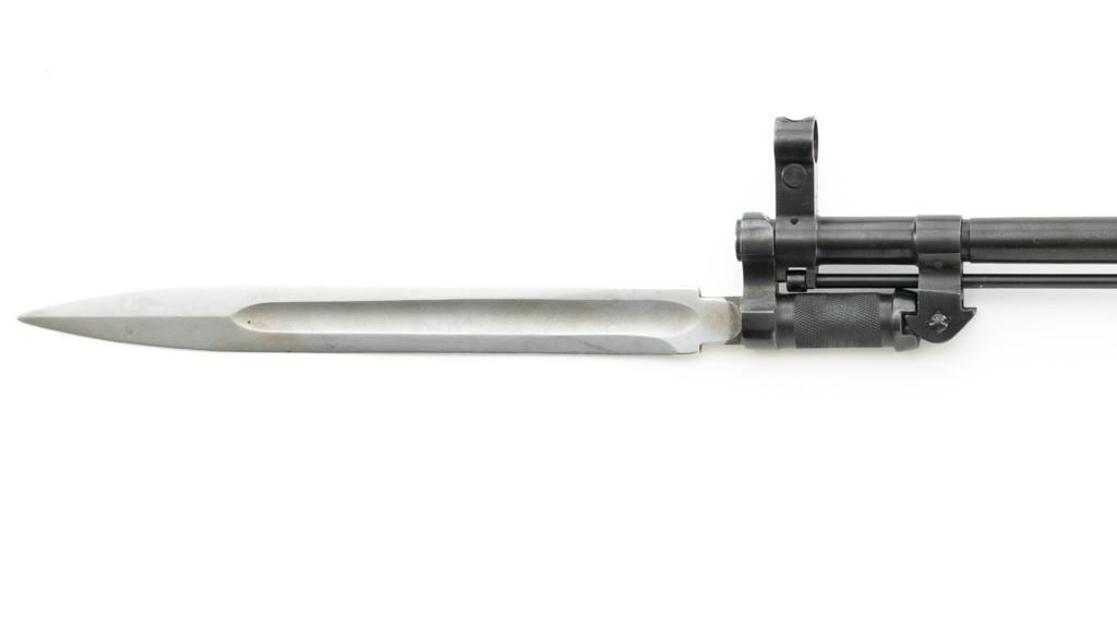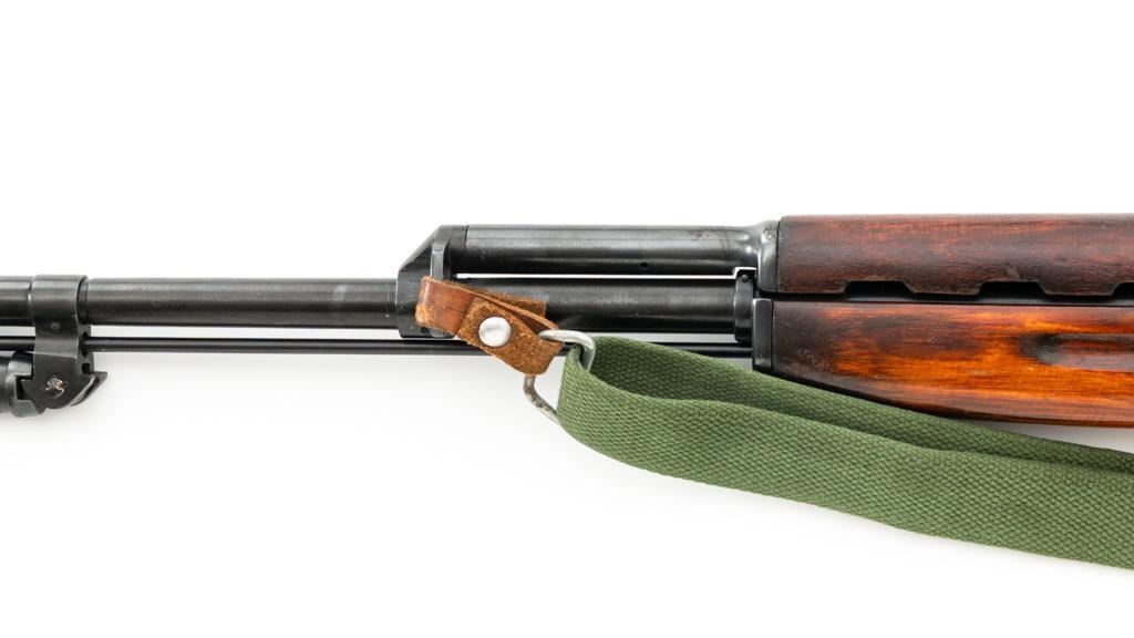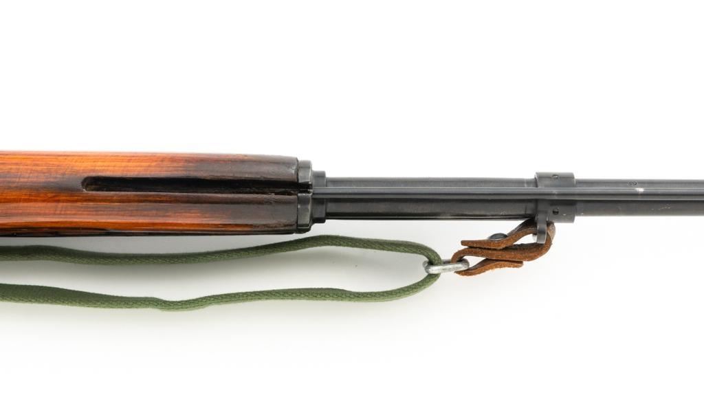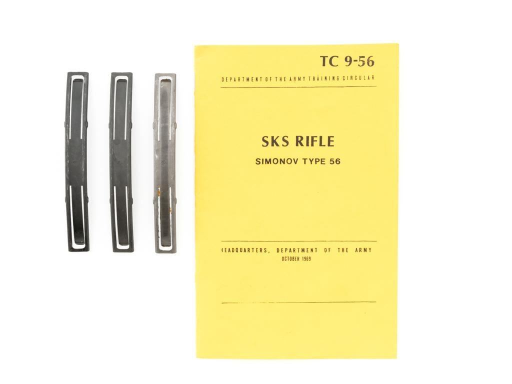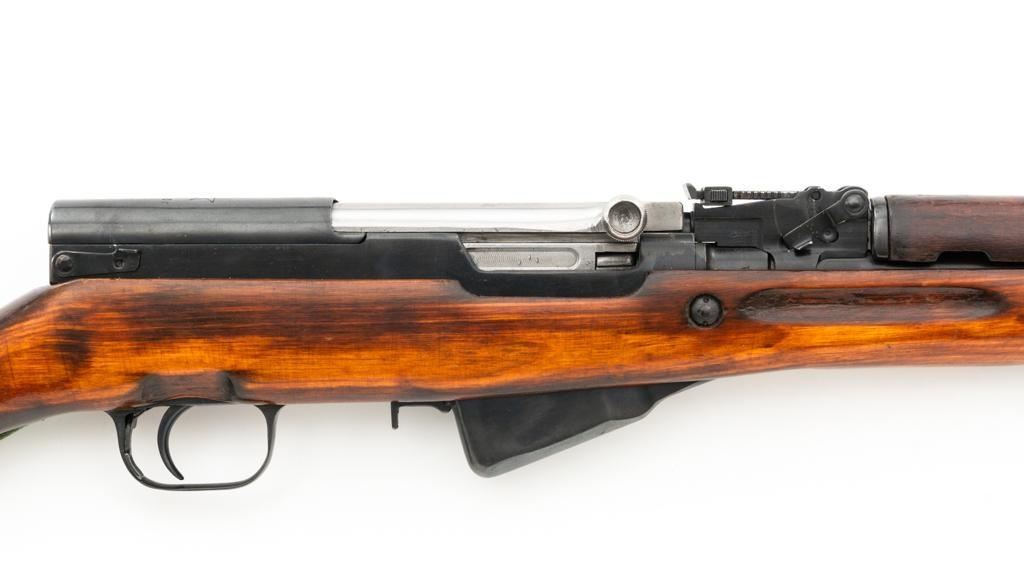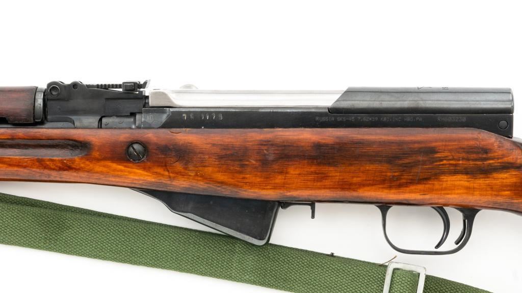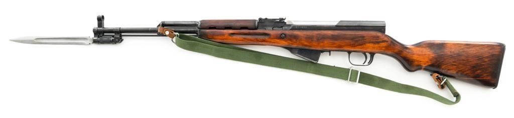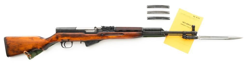 Soviet SKS Semi-Automatic Carbine with Folding Bayonet and Accessories, #RH603230, 7.62x39mm cal., 20.5" barrel, blued finish, hardwood stock and handguard, hooded post front sight, and adjustable tangent rear sight with "U"-notched groove, graduated to 1000 meters. Bolt and bolt carrier have a bright finish. Fitted with an original folding bayonet, in fine condition. Includes a steel cleaning rod, cleaning kit, Chinese green cotton sling, three (3) stripper clips, and a copy of the U.S. Army Training Circular "SKS RIFLE/SIMONOV TYPE 56". Condition of the accessories ranges from very good to excellent. Marked with Tula Arsenal makers mark over "1950r" on top of the receiver cover. Visible matching numbers. Importer information and serial number on left side of the receiver. Condition is fine overall, retaining approx. 92%-94% blue, with thinning and toning to the receiver cover and magazine. Wood is very good, with moderate handling marks, some flaking to the varnish finish on the forend. Buttstock toe is spliced. Action operates smoothly. Bore is bright with well-defined rifling. Est.: $700-$900. (C&R)