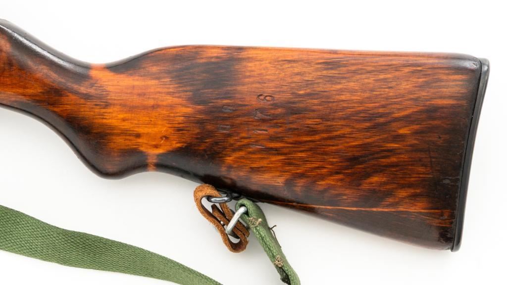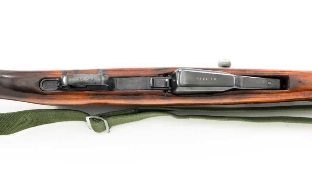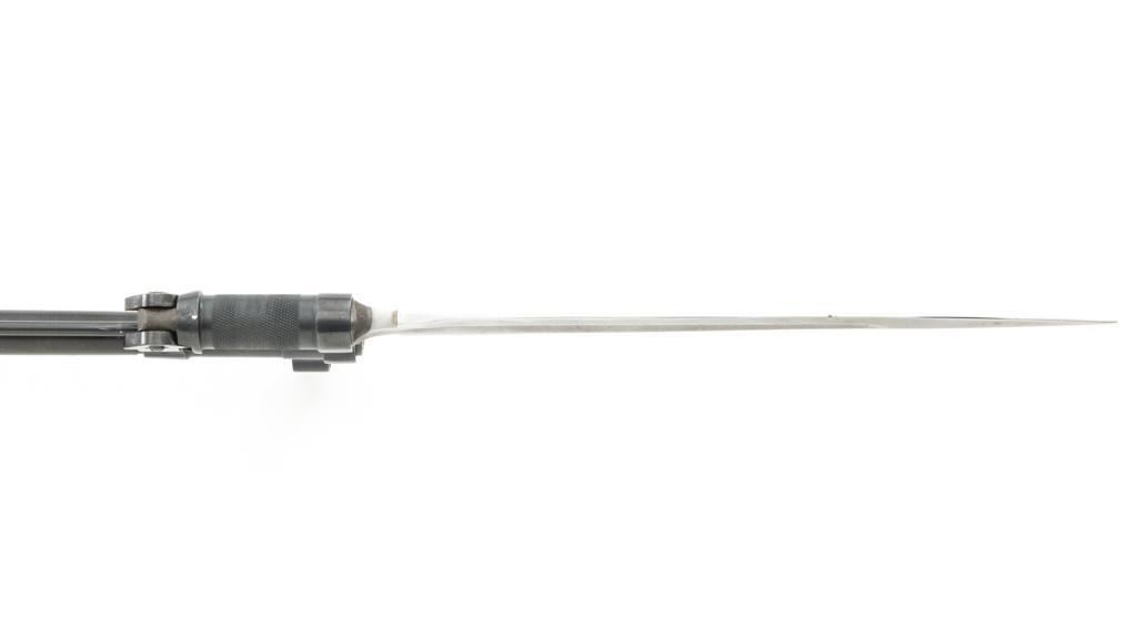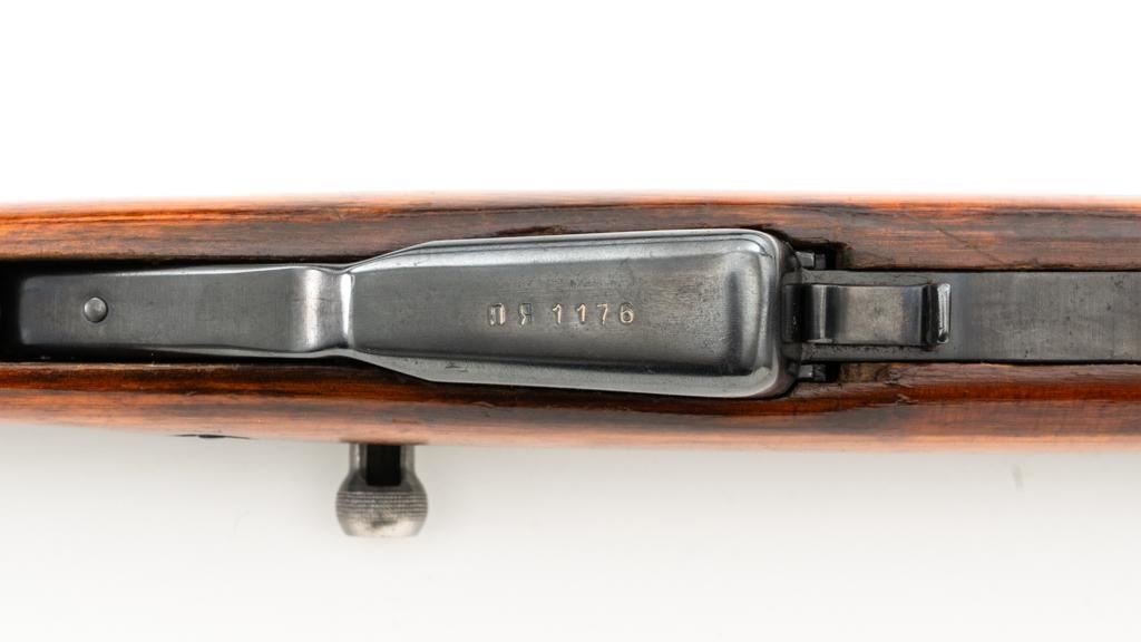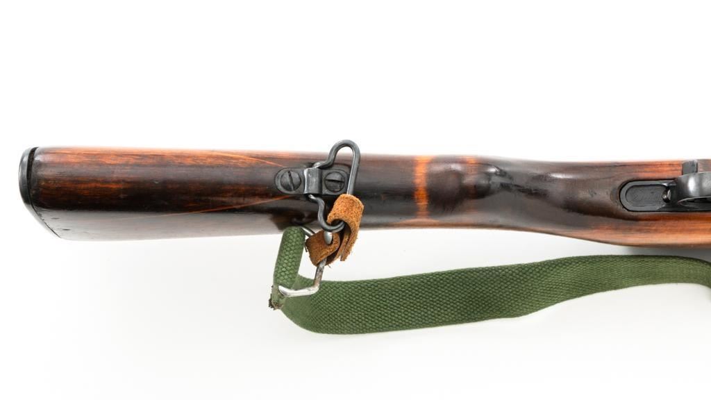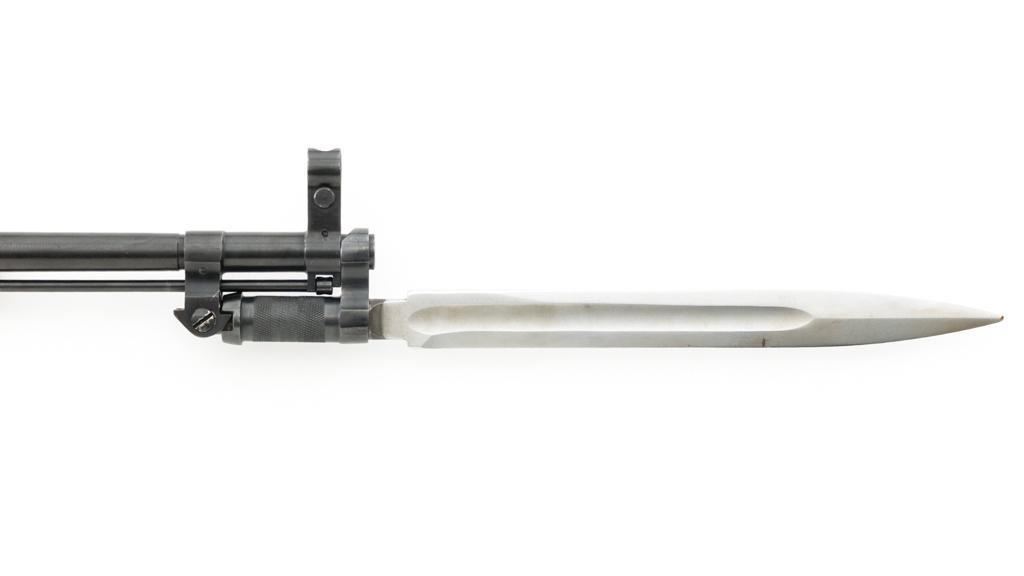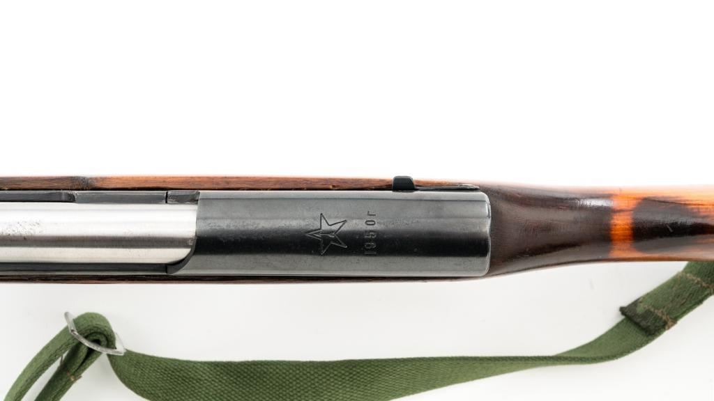 Soviet SKS Semi-Automatic Carbine with Folding Bayonet and Accessories, #RH603230, 7.62x39mm cal., 20.5" barrel, blued finish, hardwood stock and handguard, hooded post front sight, and adjustable tangent rear sight with "U"-notched groove, graduated to 1000 meters. Bolt and bolt carrier have a bright finish. Fitted with an original folding bayonet, in fine condition. Includes a steel cleaning rod, cleaning kit, Chinese green cotton sling, three (3) stripper clips, and a copy of the U.S. Army Training Circular "SKS RIFLE/SIMONOV TYPE 56". Condition of the accessories ranges from very good to excellent. Marked with Tula Arsenal makers mark over "1950r" on top of the receiver cover. Visible matching numbers. Importer information and serial number on left side of the receiver. Condition is fine overall, retaining approx. 92%-94% blue, with thinning and toning to the receiver cover and magazine. Wood is very good, with moderate handling marks, some flaking to the varnish finish on the forend. Buttstock toe is spliced. Action operates smoothly. Bore is bright with well-defined rifling. Est.: $700-$900. (C&R)