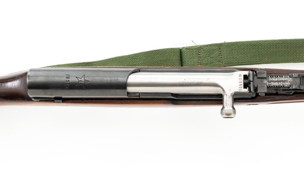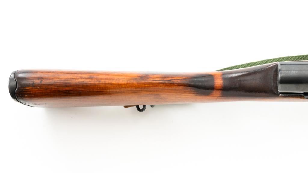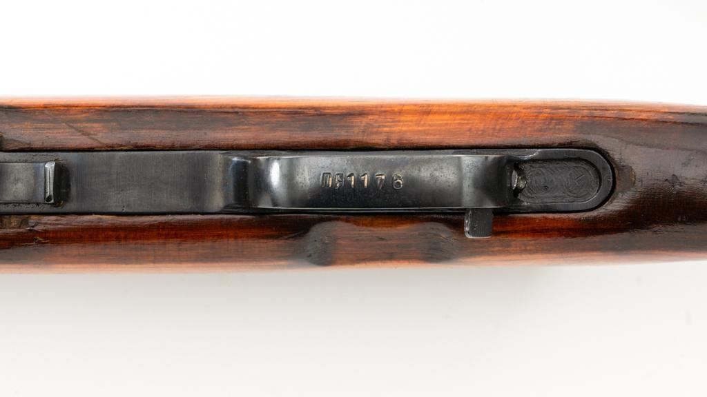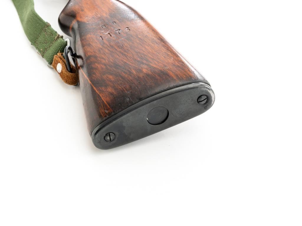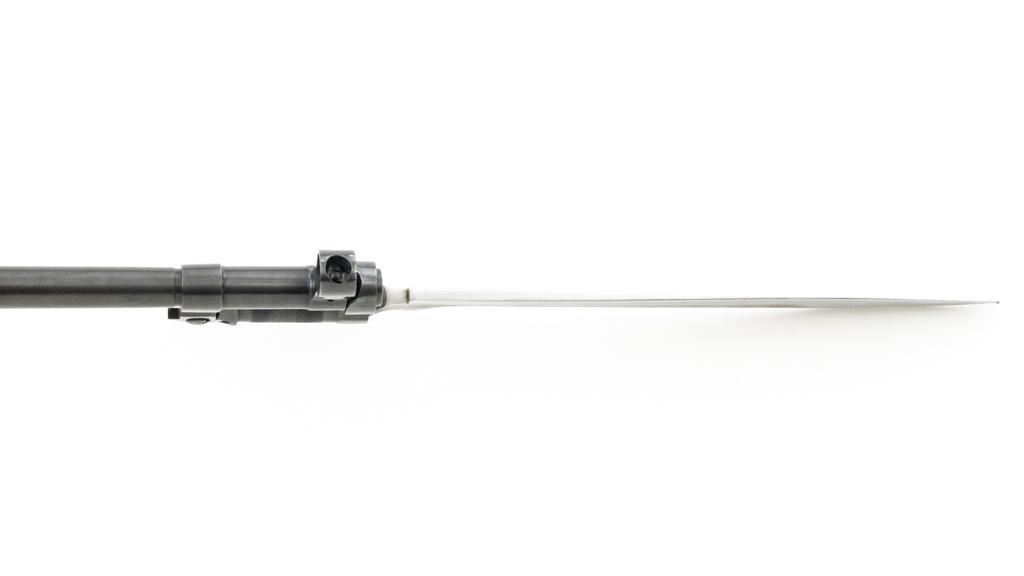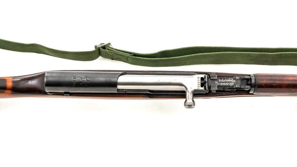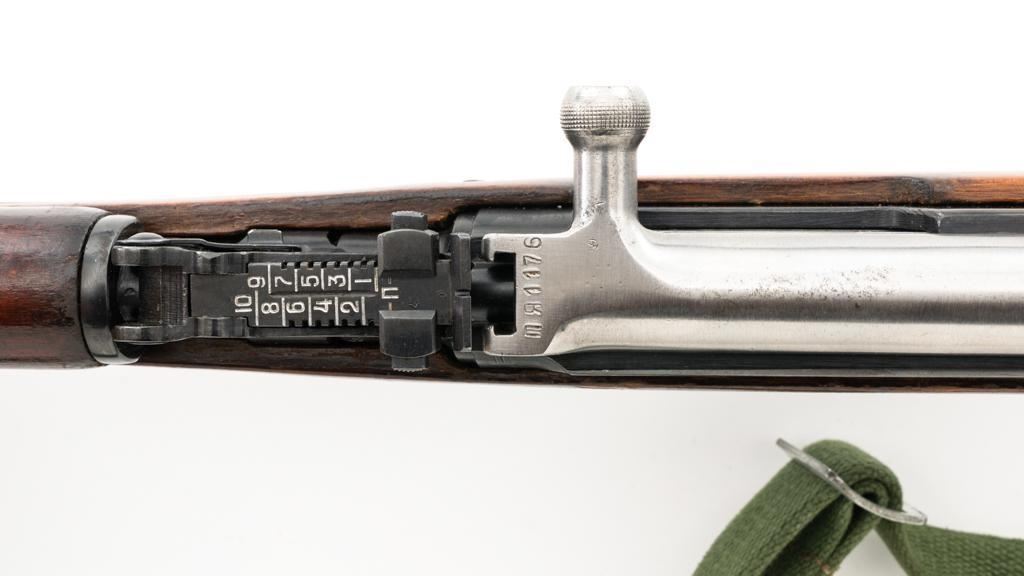 Soviet SKS Semi-Automatic Carbine with Folding Bayonet and Accessories, #RH603230, 7.62x39mm cal., 20.5" barrel, blued finish, hardwood stock and handguard, hooded post front sight, and adjustable tangent rear sight with "U"-notched groove, graduated to 1000 meters. Bolt and bolt carrier have a bright finish. Fitted with an original folding bayonet, in fine condition. Includes a steel cleaning rod, cleaning kit, Chinese green cotton sling, three (3) stripper clips, and a copy of the U.S. Army Training Circular "SKS RIFLE/SIMONOV TYPE 56". Condition of the accessories ranges from very good to excellent. Marked with Tula Arsenal makers mark over "1950r" on top of the receiver cover. Visible matching numbers. Importer information and serial number on left side of the receiver. Condition is fine overall, retaining approx. 92%-94% blue, with thinning and toning to the receiver cover and magazine. Wood is very good, with moderate handling marks, some flaking to the varnish finish on the forend. Buttstock toe is spliced. Action operates smoothly. Bore is bright with well-defined rifling. Est.: $700-$900. (C&R)