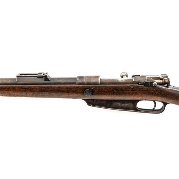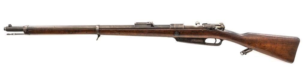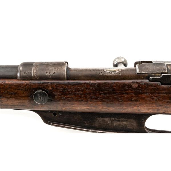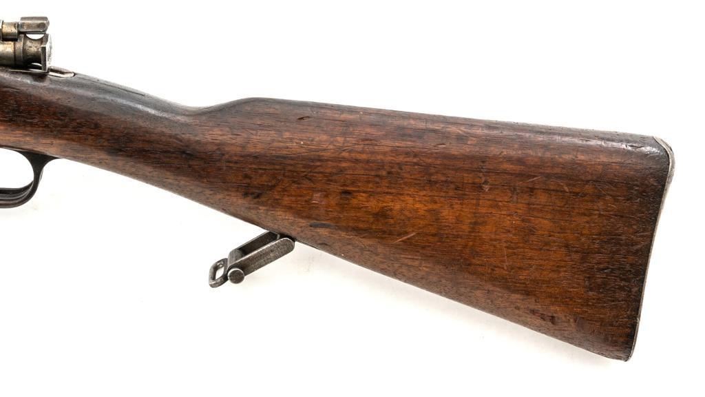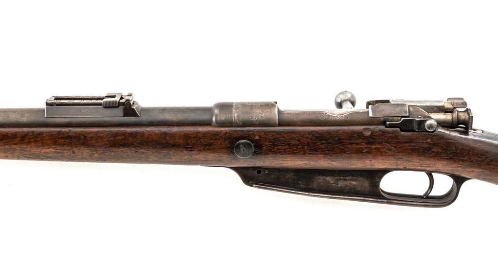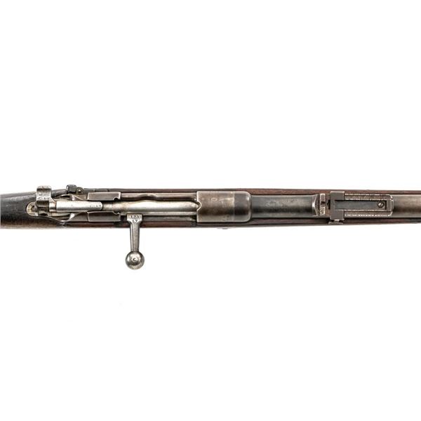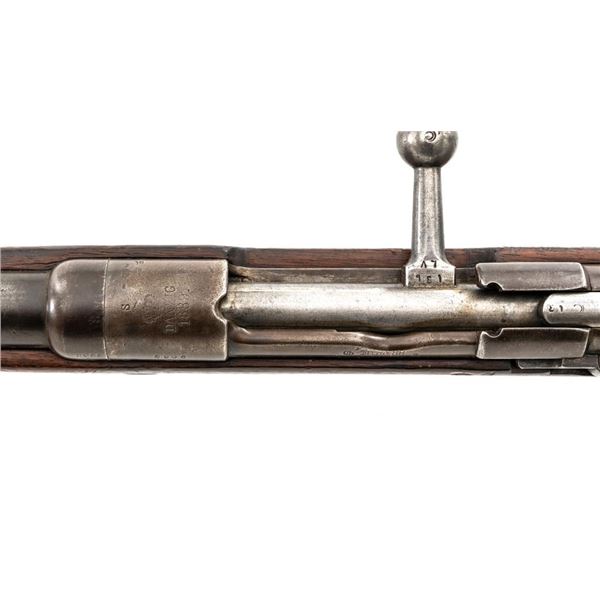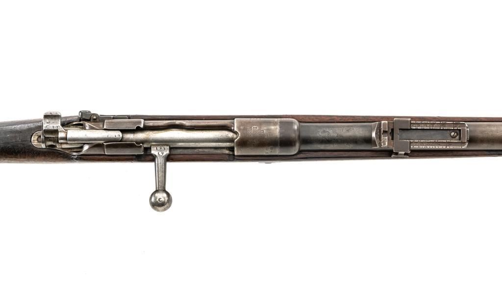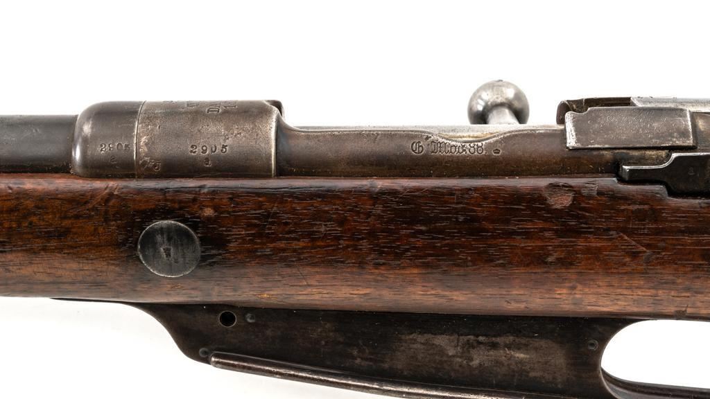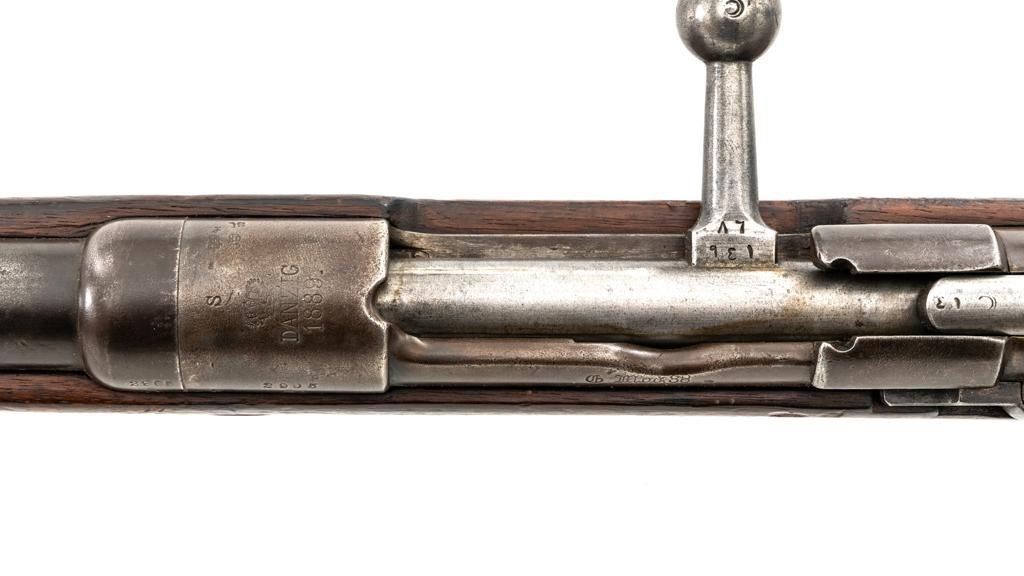 Turkish Issue GEW 88 Bolt Action Rifle, #2905a, 8x57mm cal., 29.25" barrel, blued finish, hardwood stock, dovetailed inverted-"V" front sight, adjustable folding leaf rear sight with "V"-notched groove, graduated in Turkish characters. Includes steel cleaning rod. Top of the receiver ring is marked "S/(Crown)/DANZIG/1889". Left side of the receiver rail is marked "G Mod.88." Matching number on the barrel. Other numbered parts do not match. There are faint crowned inspection stamps on right side of the buttstock. Condition overall is good, with the metal toned to a brown color showing wear to the barrel bands and magazine. Bolt assembly is mostly bright, with spots of patina. Wood is good, with two 1.5" cracks behind the receiver tang, general dents and handling marks to the darkened finish. Action operates smoothly. Bore with a dark ring in the upper third of the barrel, and poor to fair rifling. Est.: $250-$400. (Antique)