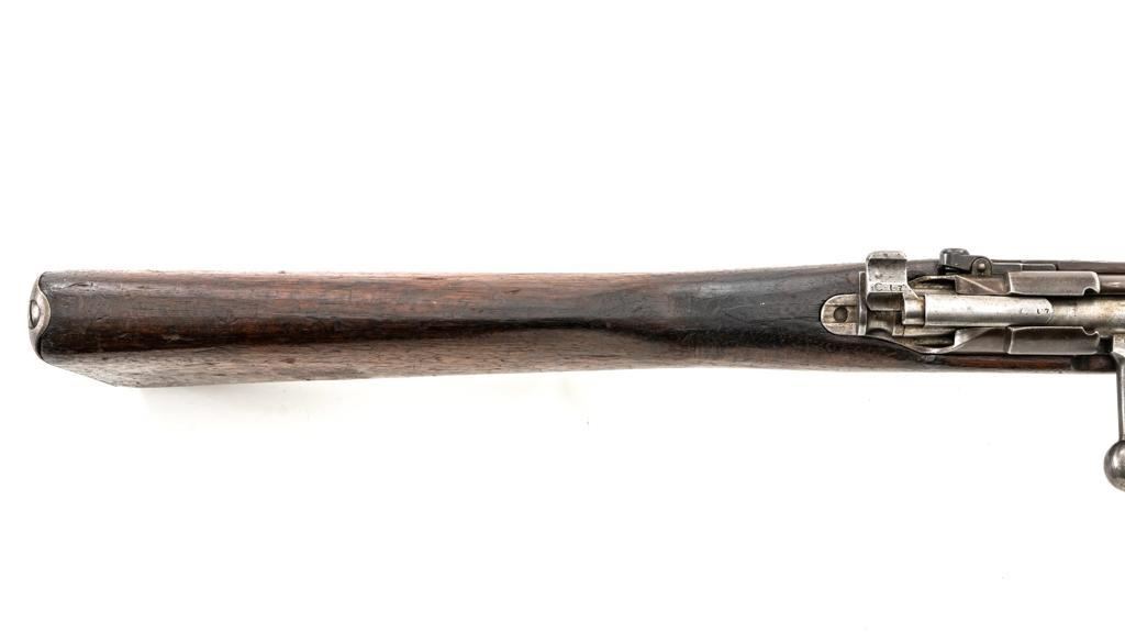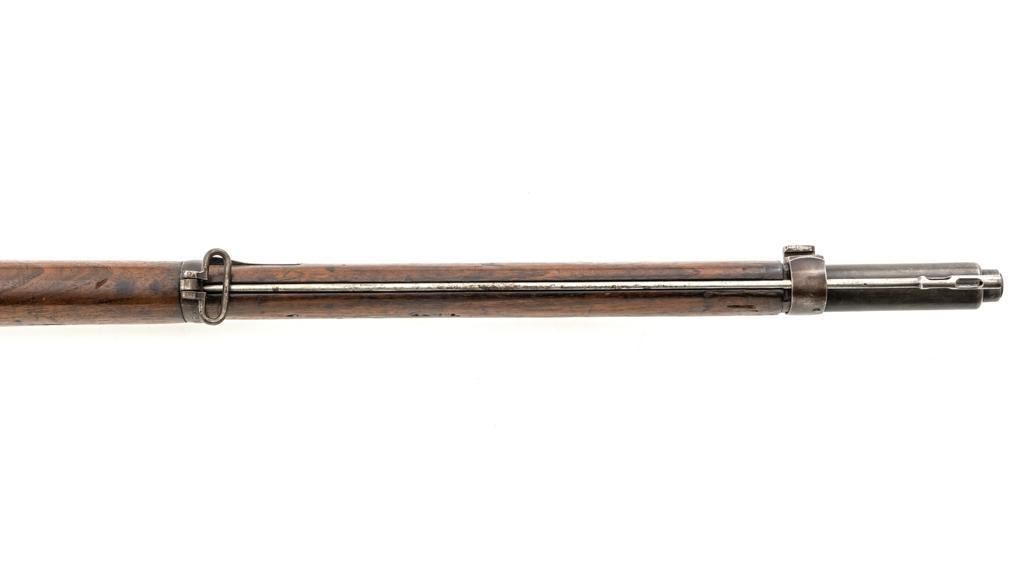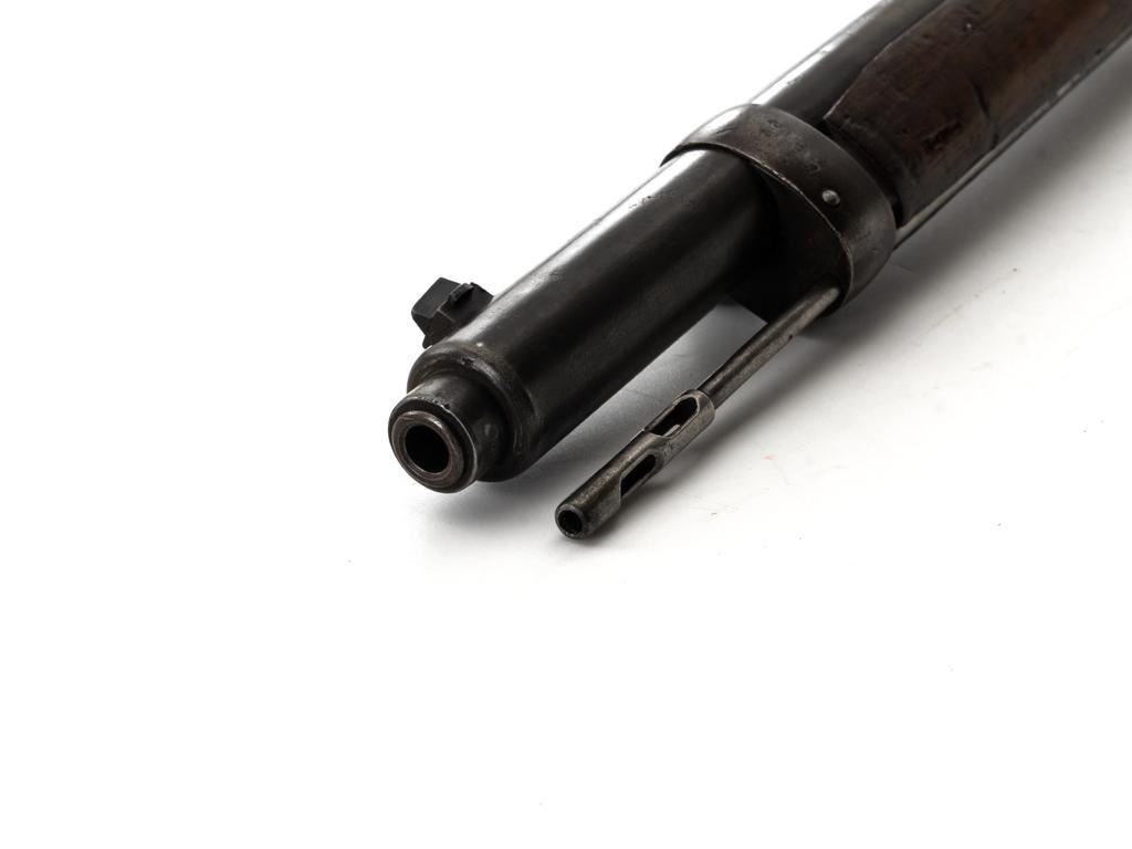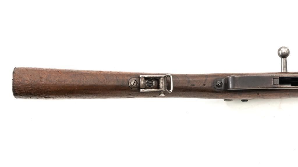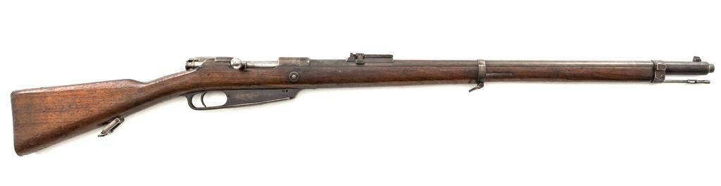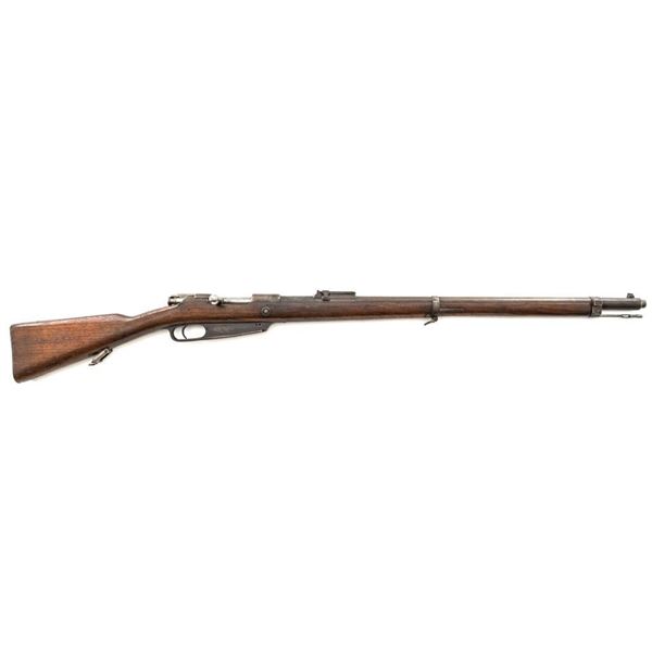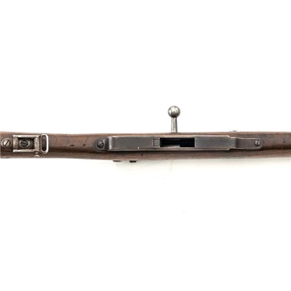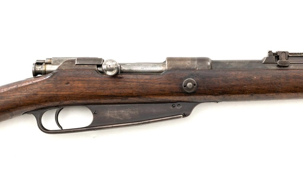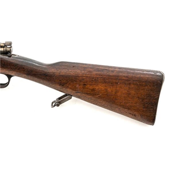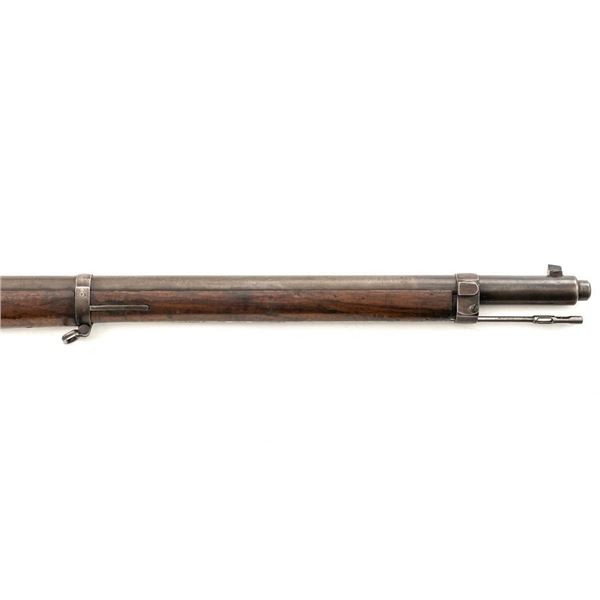 Turkish Issue GEW 88 Bolt Action Rifle, #2905a, 8x57mm cal., 29.25" barrel, blued finish, hardwood stock, dovetailed inverted-"V" front sight, adjustable folding leaf rear sight with "V"-notched groove, graduated in Turkish characters. Includes steel cleaning rod. Top of the receiver ring is marked "S/(Crown)/DANZIG/1889". Left side of the receiver rail is marked "G Mod.88." Matching number on the barrel. Other numbered parts do not match. There are faint crowned inspection stamps on right side of the buttstock. Condition overall is good, with the metal toned to a brown color showing wear to the barrel bands and magazine. Bolt assembly is mostly bright, with spots of patina. Wood is good, with two 1.5" cracks behind the receiver tang, general dents and handling marks to the darkened finish. Action operates smoothly. Bore with a dark ring in the upper third of the barrel, and poor to fair rifling. Est.: $250-$400. (Antique)