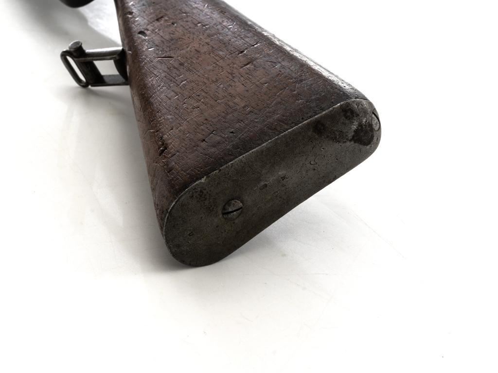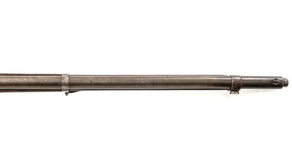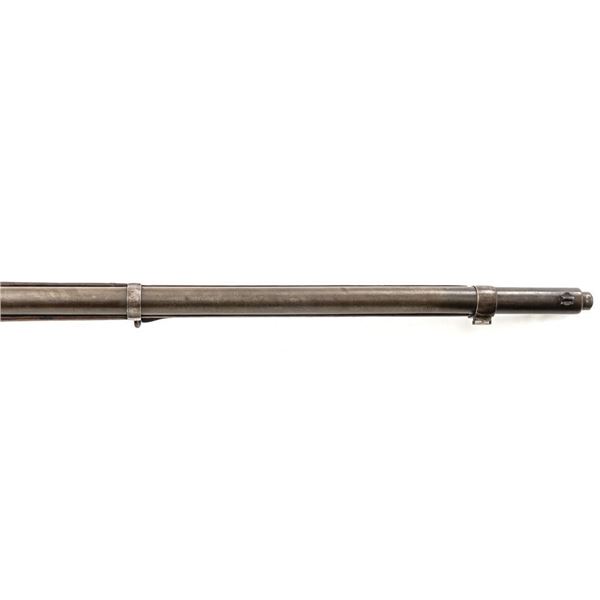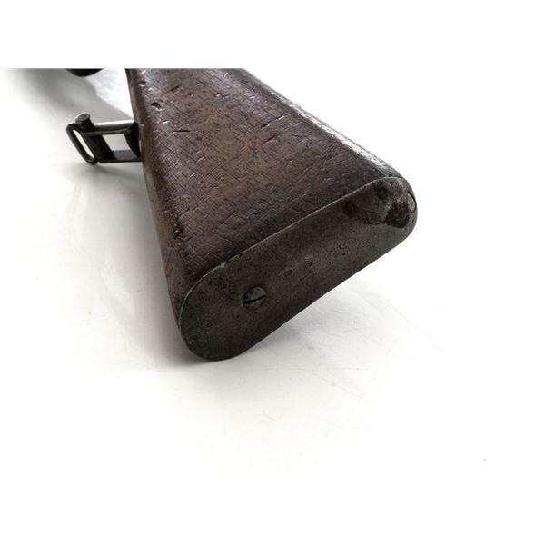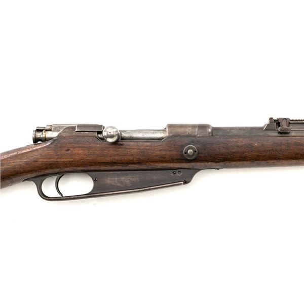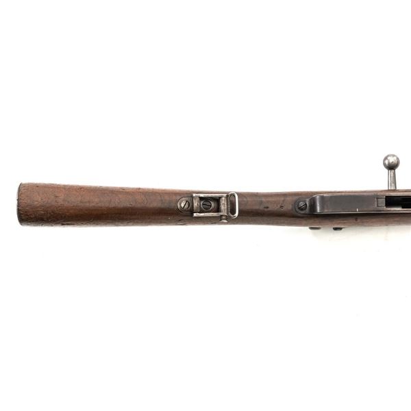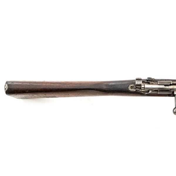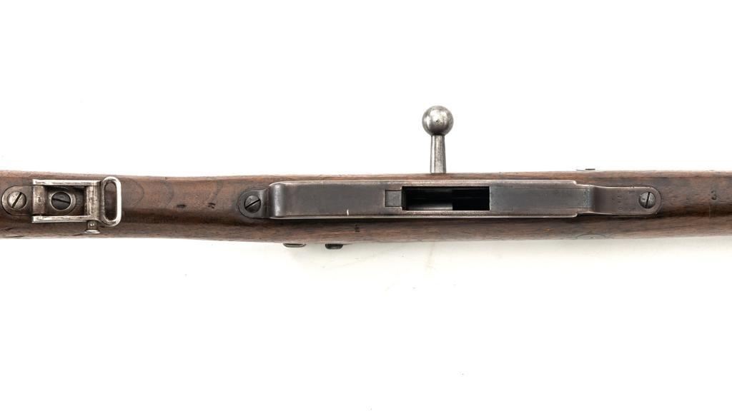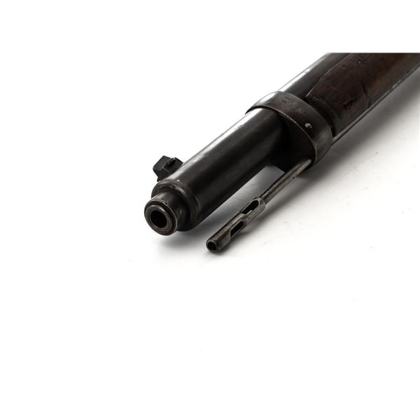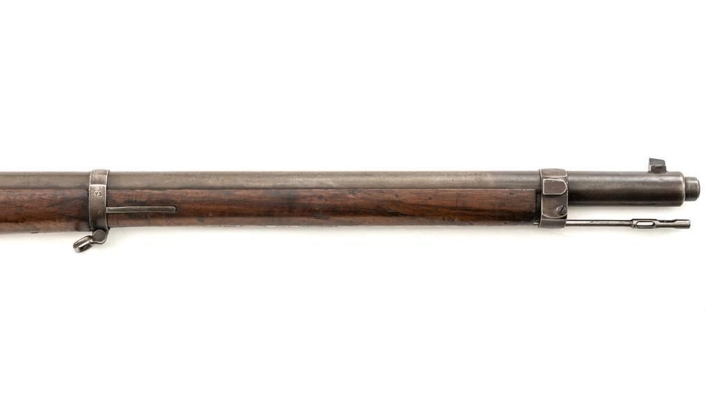 Turkish Issue GEW 88 Bolt Action Rifle, #2905a, 8x57mm cal., 29.25" barrel, blued finish, hardwood stock, dovetailed inverted-"V" front sight, adjustable folding leaf rear sight with "V"-notched groove, graduated in Turkish characters. Includes steel cleaning rod. Top of the receiver ring is marked "S/(Crown)/DANZIG/1889". Left side of the receiver rail is marked "G Mod.88." Matching number on the barrel. Other numbered parts do not match. There are faint crowned inspection stamps on right side of the buttstock. Condition overall is good, with the metal toned to a brown color showing wear to the barrel bands and magazine. Bolt assembly is mostly bright, with spots of patina. Wood is good, with two 1.5" cracks behind the receiver tang, general dents and handling marks to the darkened finish. Action operates smoothly. Bore with a dark ring in the upper third of the barrel, and poor to fair rifling. Est.: $250-$400. (Antique)