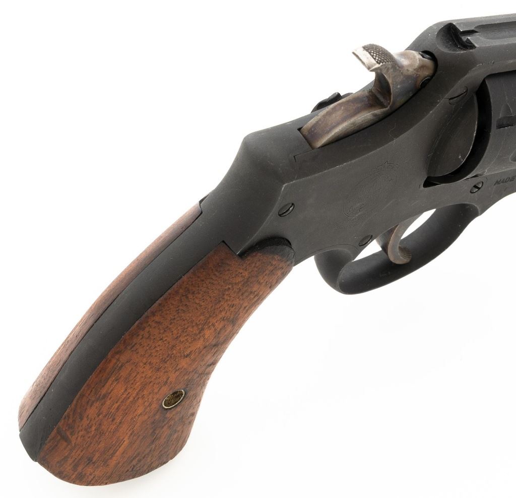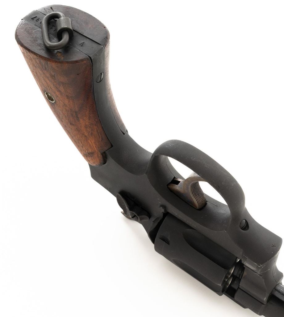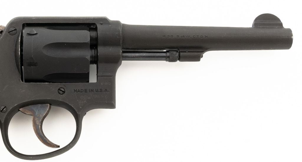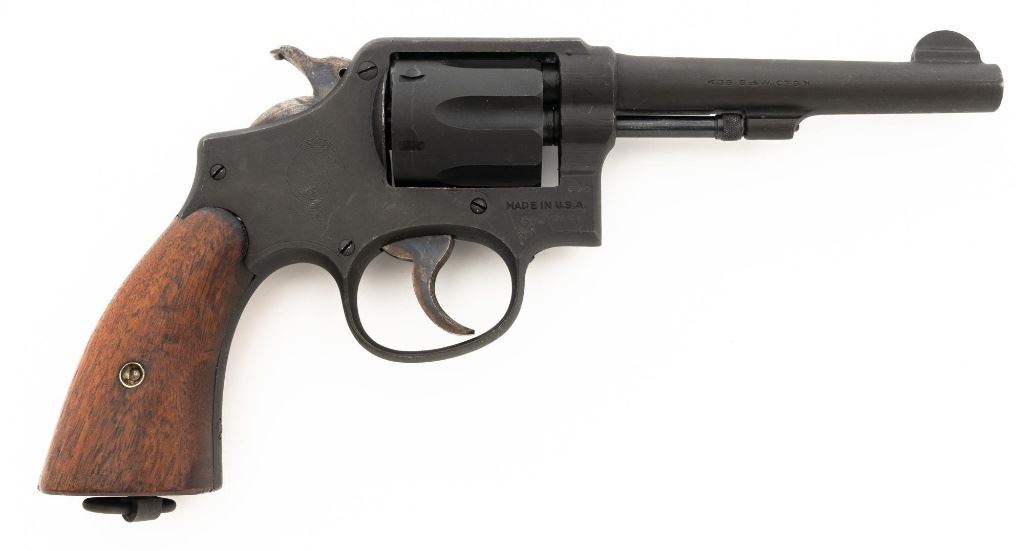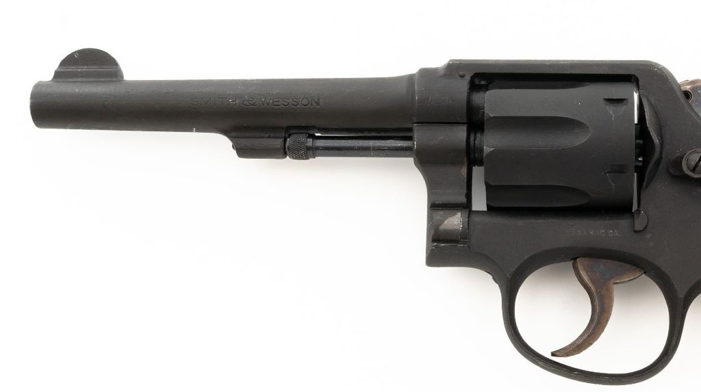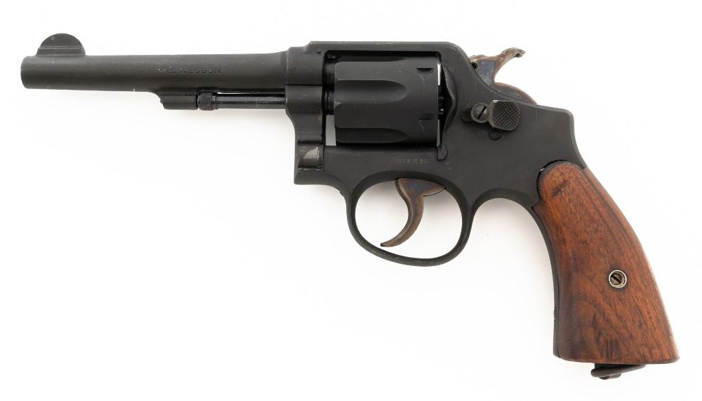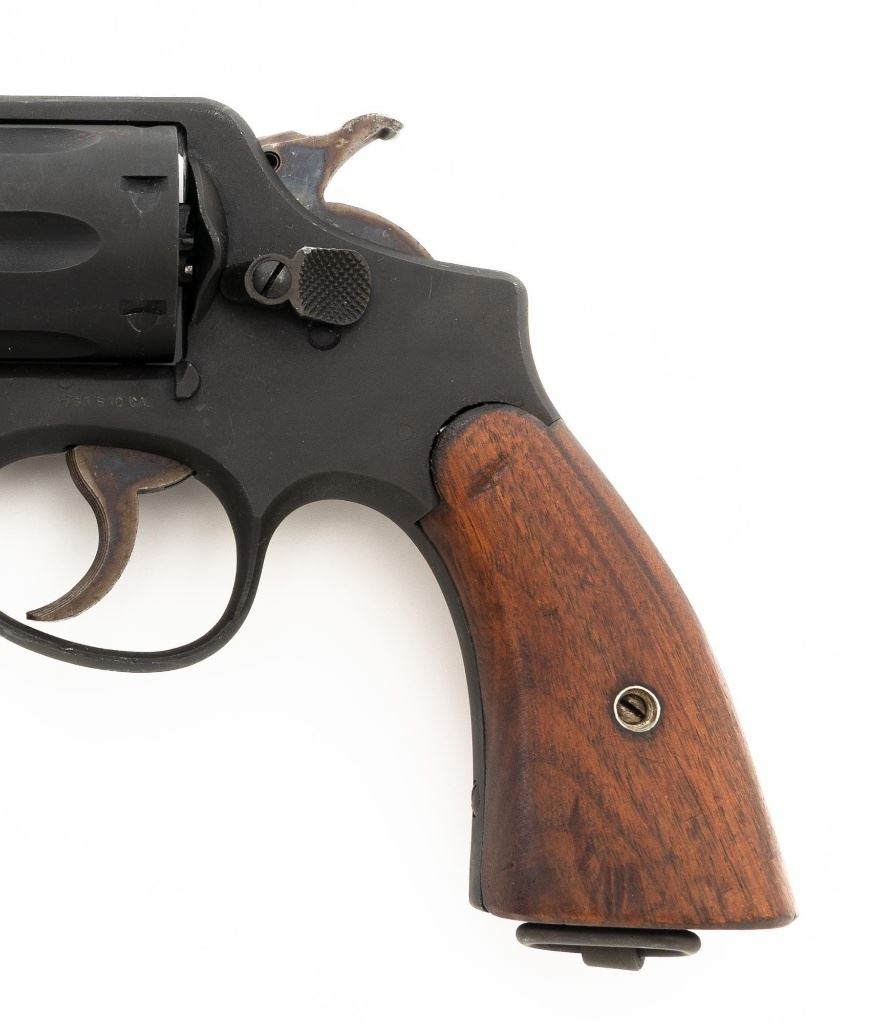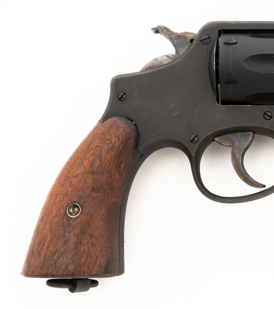 Australian Issued U.S. Property Marked Smith & Wesson Victory Model Double Action Revolver, #V415097,.38 S&W caliber, 5" barrel, parkerized finish with case hardened hammer and trigger, smooth walnut grips, blade front sight, fixed rear sight with square-notched groove, and swiveling lanyard loop. Top strap is marked "(flaming bomb) U.S.PROPERTY G.H.D." Right side of the frame is marked with Australian "D(broad arrow D"/FTR/MA 55/(broad arrow)" with Lithgow arsenal inspectors mark. Matching numbers on barrel and cylinder. Import marked on left side of the frame. Condition overall is very good+ as arsenal refinished, retaining approx. 92%-94% reparkerized finish, showing mostly light scratches. Hammer and trigger retain vivid case colors. Grips are very good with old handling marks. Action locks up, cycles, and extracts smoothly. Bore is bright with very good rifling and the chambers are clean and bright. Est.: $300-$500. (C&R/PPT)