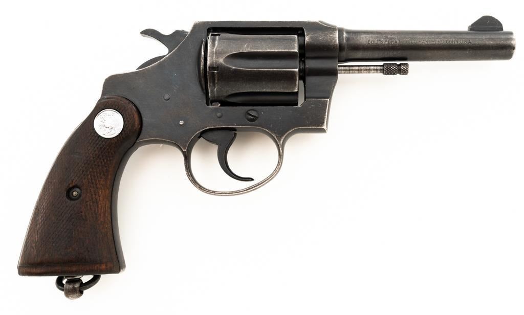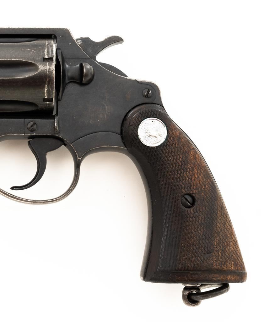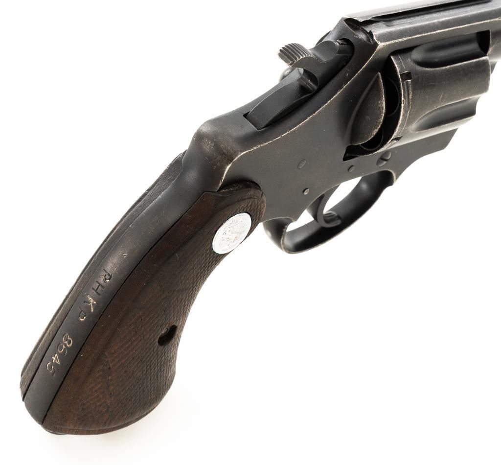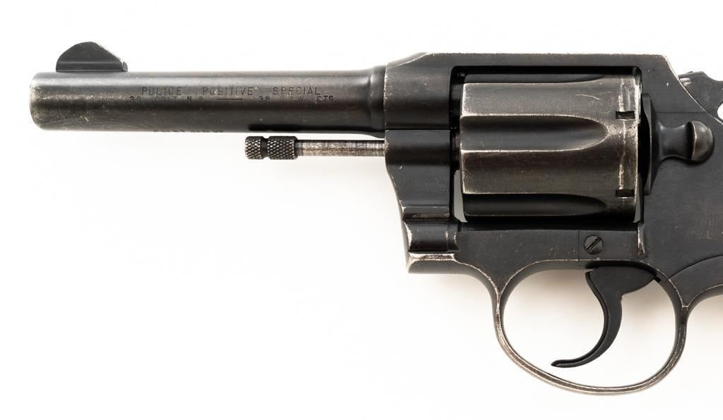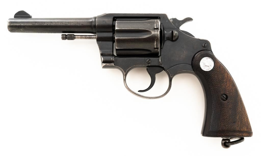 Royal Hong Kong Police Marked Colt Police Positive Special (3rd Issue) Double Action Revolver, #745794, .38 Colt N.P. cal., 4" barrel, blue finish, checkered walnut two-piece grips with Colt medallions, lanyard ring, serrated blade front and fixed square-notch rear sight. "(Rampant Colt)" marked at the left rear is only partially visible, with "RHKP 8645" along the backstrap. Import marked on the underside of the barrel. Mfgd1959. Revolver is in very good overall condition, with general holster wear that is consistent with service use, retaining approx. 85%-90% thinning finish. Frame shows edgewear and scattered spots of light corrosion, grip straps are toning dark. Trigger guard with small mars and wear around the edges. Grips are in very good condition with some smoothing of the checkering, showing minor impressions on the right panel. Action functions well and locks up securely. Bore is very good with mild erosion at the breech; rifling is strong. Est.: $500-$700. (C&R/PPT)