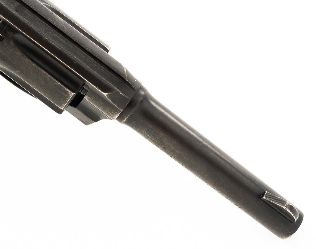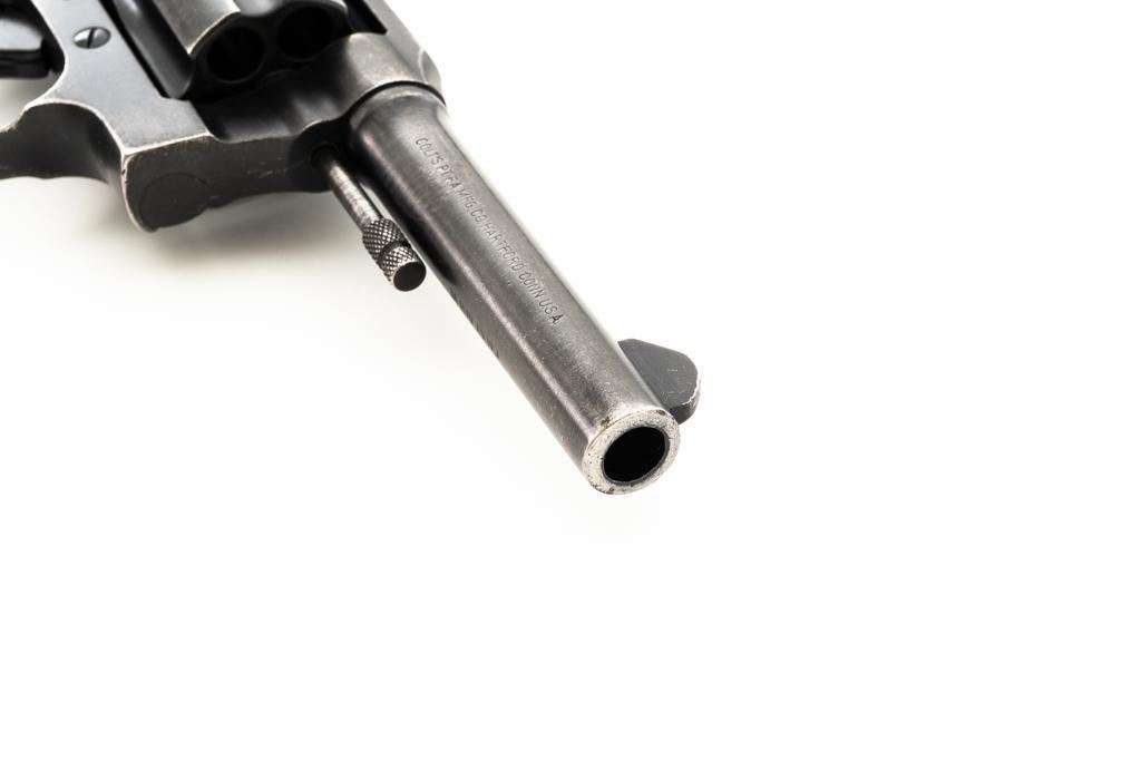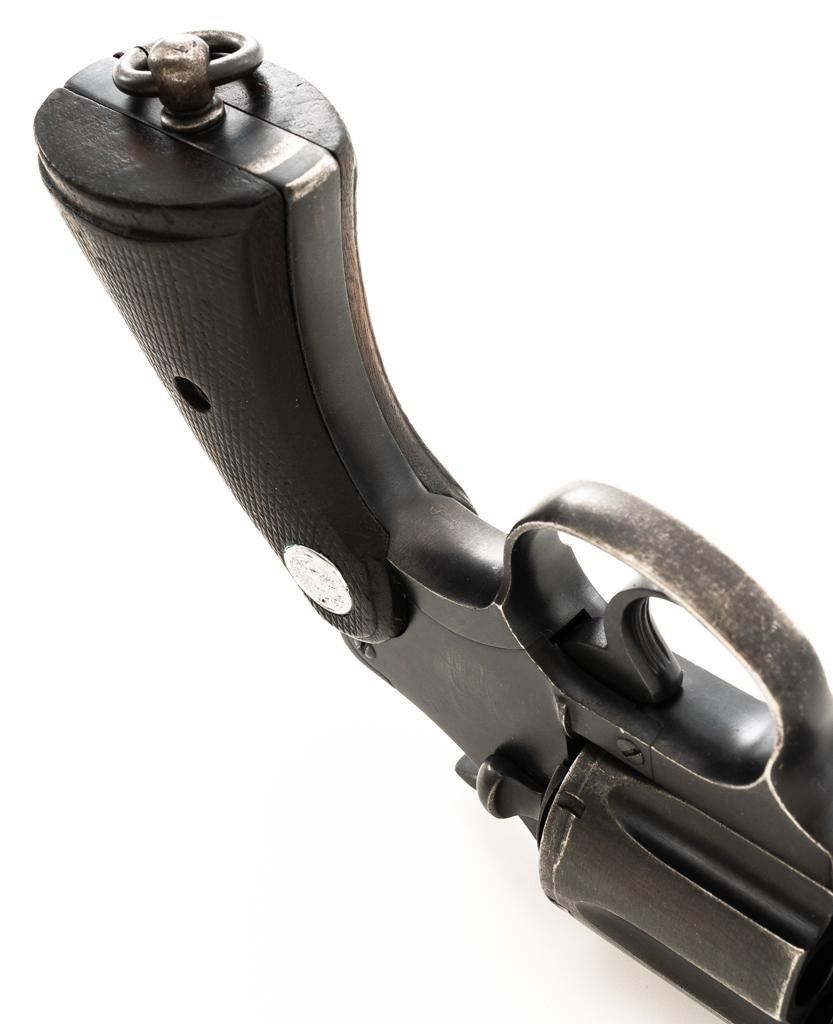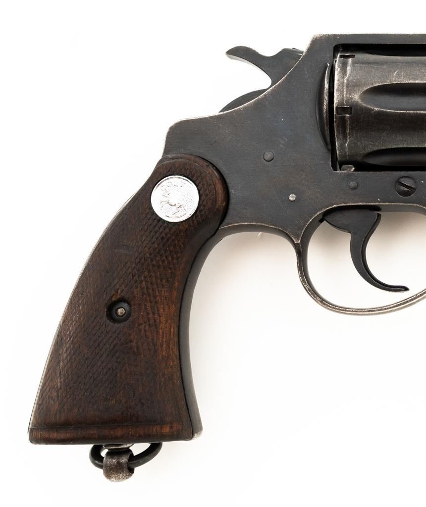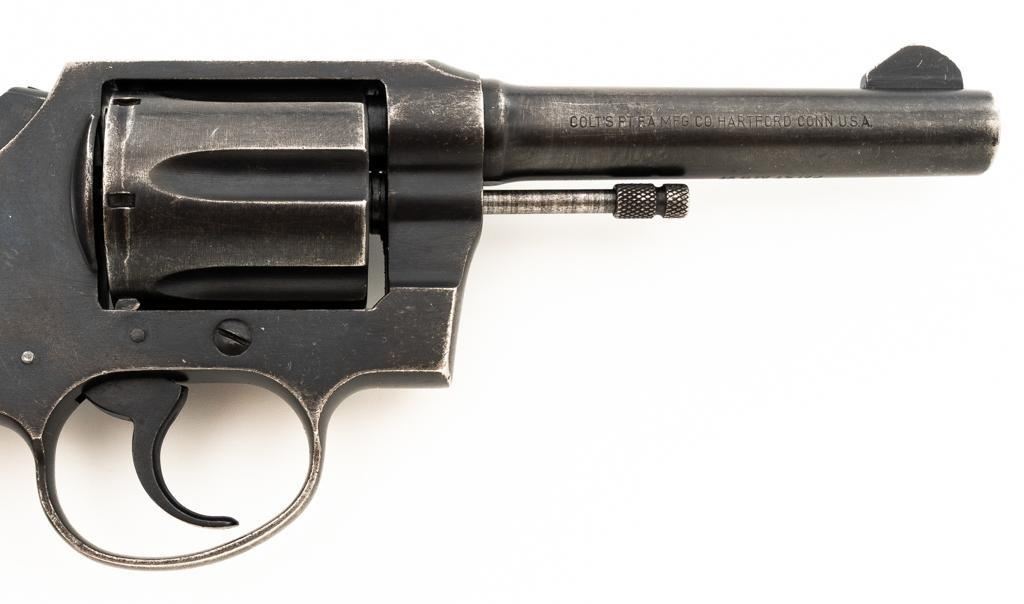 Royal Hong Kong Police Marked Colt Police Positive Special (3rd Issue) Double Action Revolver, #745794, .38 Colt N.P. cal., 4" barrel, blue finish, checkered walnut two-piece grips with Colt medallions, lanyard ring, serrated blade front and fixed square-notch rear sight. "(Rampant Colt)" marked at the left rear is only partially visible, with "RHKP 8645" along the backstrap. Import marked on the underside of the barrel. Mfgd1959. Revolver is in very good overall condition, with general holster wear that is consistent with service use, retaining approx. 85%-90% thinning finish. Frame shows edgewear and scattered spots of light corrosion, grip straps are toning dark. Trigger guard with small mars and wear around the edges. Grips are in very good condition with some smoothing of the checkering, showing minor impressions on the right panel. Action functions well and locks up securely. Bore is very good with mild erosion at the breech; rifling is strong. Est.: $500-$700. (C&R/PPT)