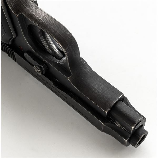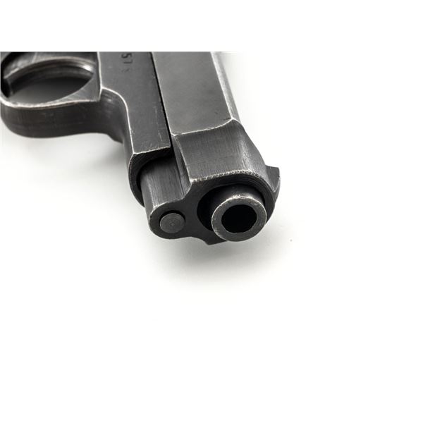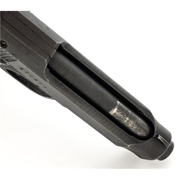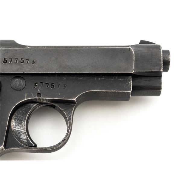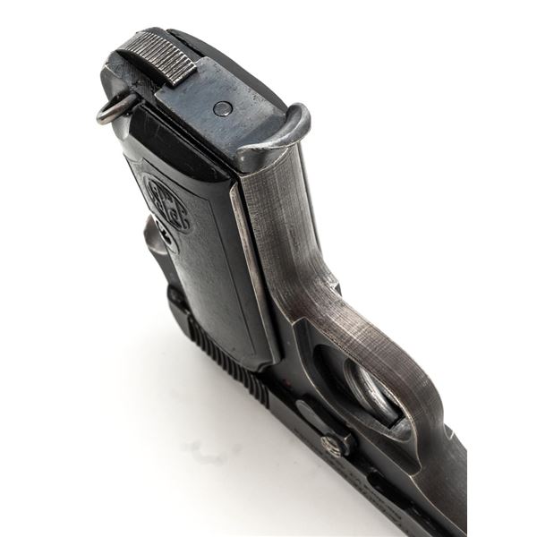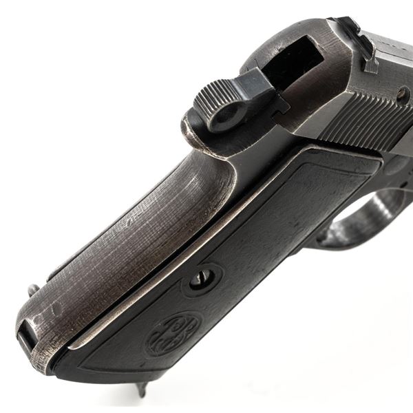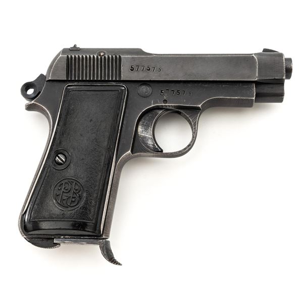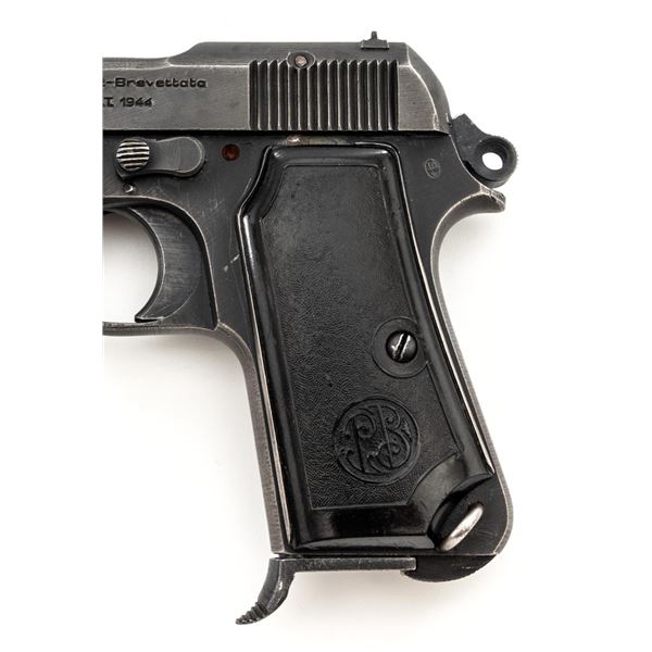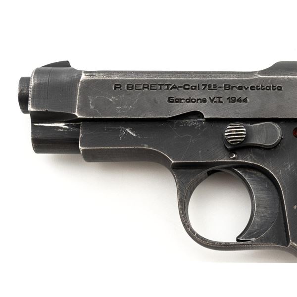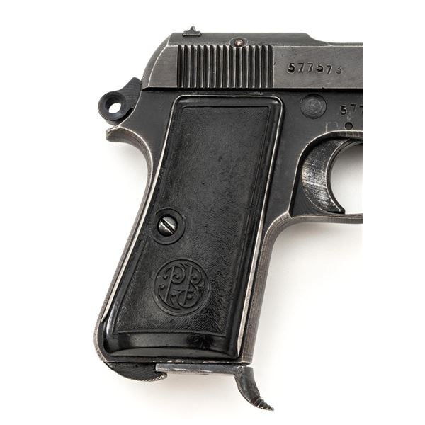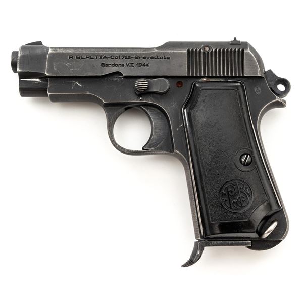 Beretta Model 1935 Semi-Automatic Pistol Marked "4UT", #577573, .32 ACP cal., 3.4" barrel, phosphate finish, textured black plastic grips embossed with "PB" logos on both sides, blade front sight, fixed rear sight with square-notched groove, and fixed lanyard loop on left side of the frame. Includes one blued steel magazine with finger extension, marked "Cal.765 BERETTA" on the spine. Pistol is marked "P.BERETTA-Cal 765-Brevettata/Gardone V.T.1944" on left side of the slide, with "4/UT" on left side of the frame. Matching numbers on frame and slide. No visible import marks. Condition overall is fine, retaining approx. 85%-90% blue, with edgewear and handling marks to the frame and slide. Grips with handling marks and light scratches to both sides. Action operates smoothly. Bright bore rates very good, with clearly defined rifling. Est.: $500-$700. (C&R/PPT)