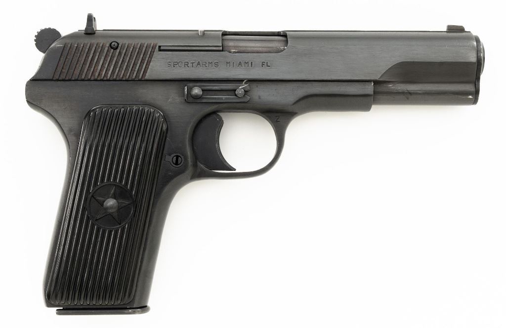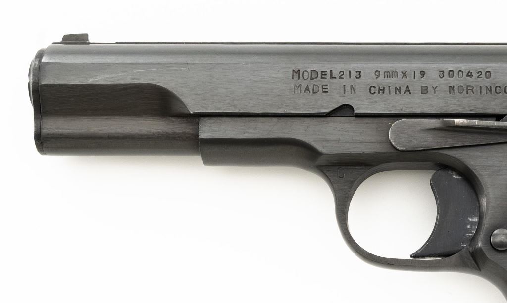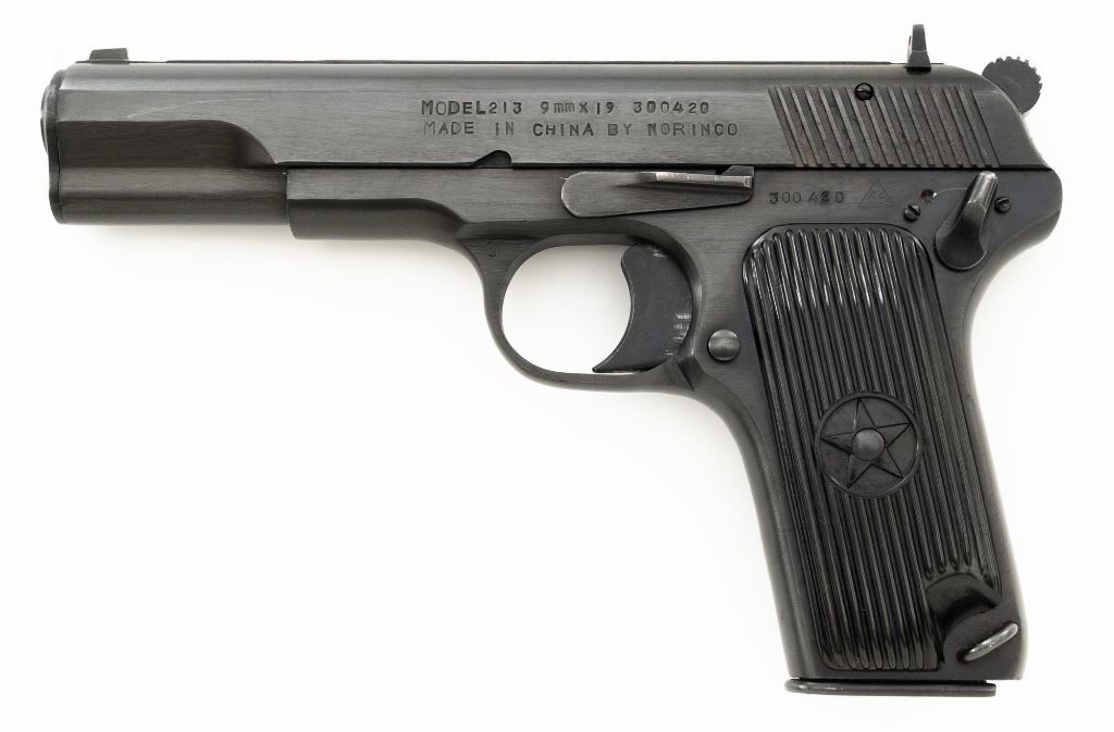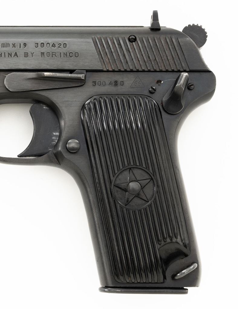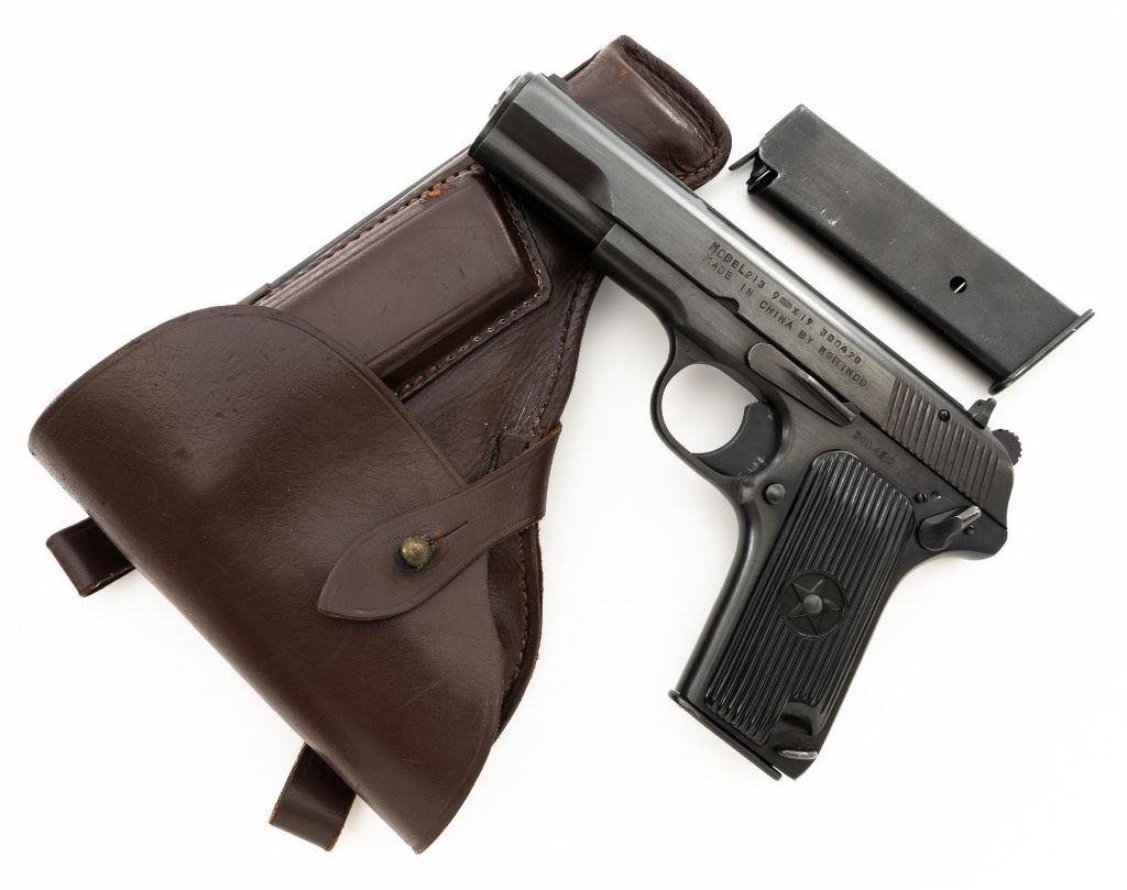 Chinese Norinco Model 213 Tokarev Semi-Automatic Pistol with Two (2) Magazines and Holster, #300420, 9mm cal., 4.6" barrel, blued finish, grooved black plastic "Star" grips, blade front sight, fixed rear sight with "U"-notched groove, and fixed lanyard loop at left side of the frame. One magazine with matching serial number, second magazine is numbered but does not match. Brown leather Soviet holster is unmarked and in very good condition, with light handling marks and impressions, all stitching and fittings are present. Includes steel cleaning rod. Pistol is marked "MODEL 213/9mmx19/300420/MADE IN CHINA BY NORINCO" on left side of the slide, with "(triangle)66" on left side of the frame. Matching numbers on frame and slide. Import marked on right side of the slide. Condition overall is excellent, retaining approx. 97% blue, showing only light wear. Grips with very light handling marks. Action operates smoothly. Bright bore rates excellent, with well-defined rifling. Est.: $250-$400. (C&R/PPT)