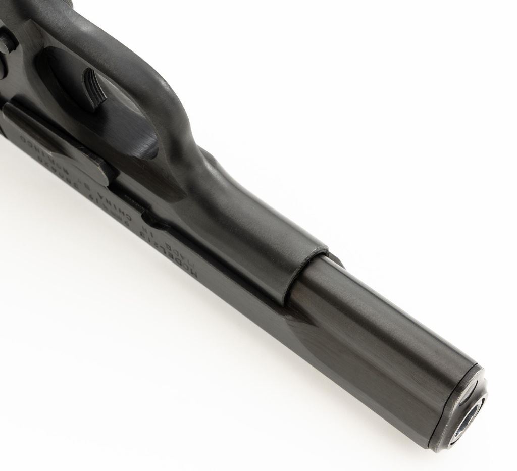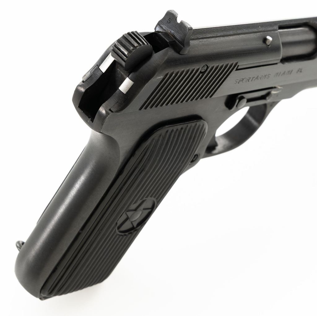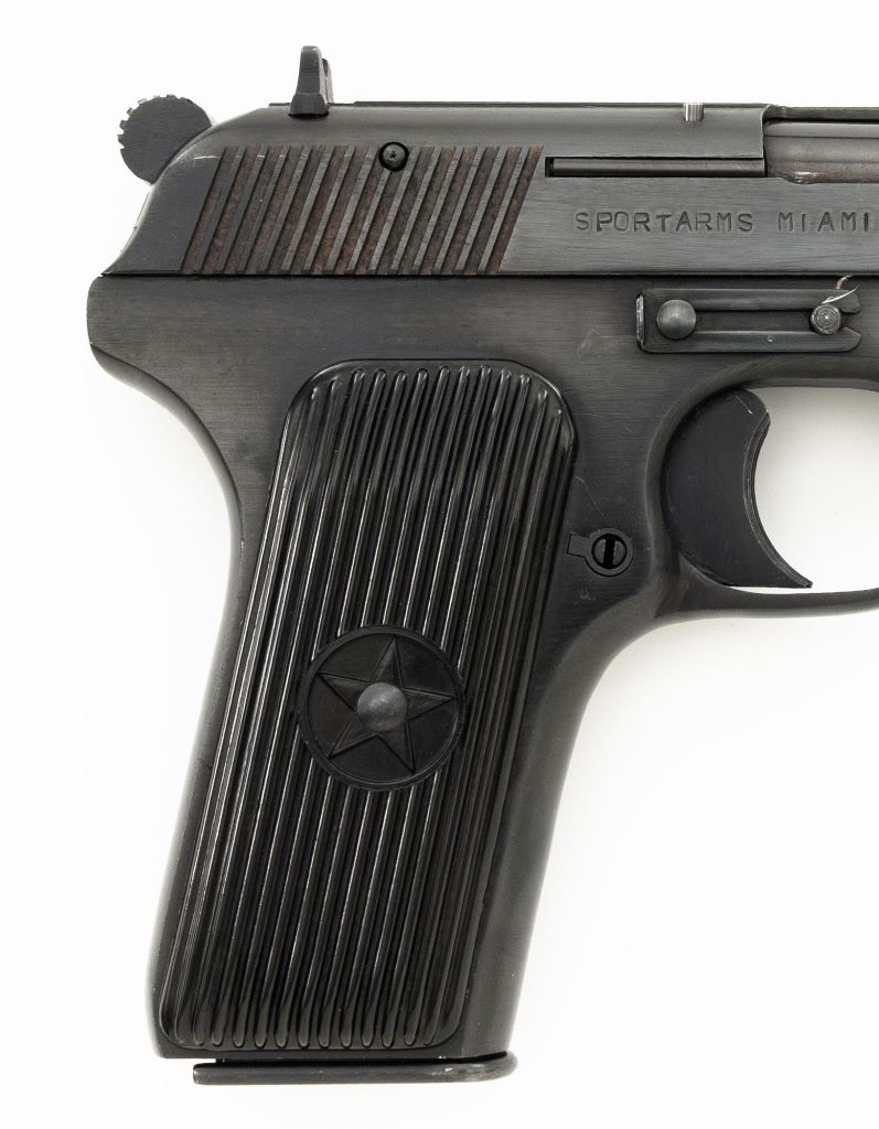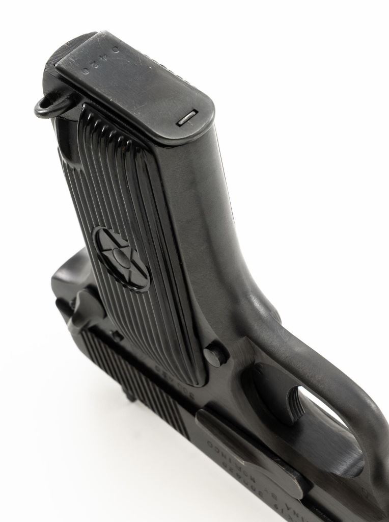 Chinese Norinco Model 213 Tokarev Semi-Automatic Pistol with Two (2) Magazines and Holster, #300420, 9mm cal., 4.6" barrel, blued finish, grooved black plastic "Star" grips, blade front sight, fixed rear sight with "U"-notched groove, and fixed lanyard loop at left side of the frame. One magazine with matching serial number, second magazine is numbered but does not match. Brown leather Soviet holster is unmarked and in very good condition, with light handling marks and impressions, all stitching and fittings are present. Includes steel cleaning rod. Pistol is marked "MODEL 213/9mmx19/300420/MADE IN CHINA BY NORINCO" on left side of the slide, with "(triangle)66" on left side of the frame. Matching numbers on frame and slide. Import marked on right side of the slide. Condition overall is excellent, retaining approx. 97% blue, showing only light wear. Grips with very light handling marks. Action operates smoothly. Bright bore rates excellent, with well-defined rifling. Est.: $250-$400. (C&R/PPT)