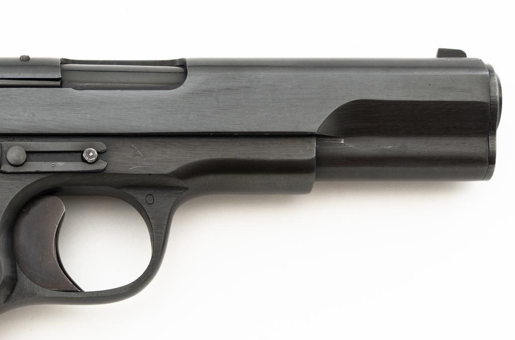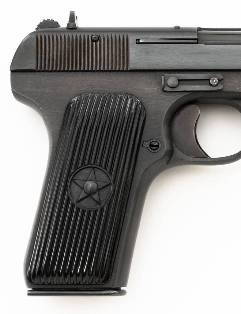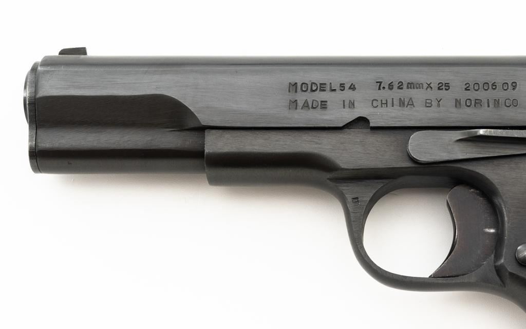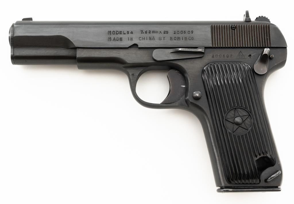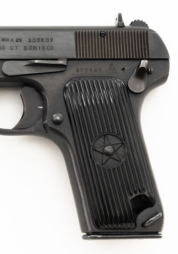Chinese Norinco Type 54 Tokarev Semi-Automatic Pistol, #200609, 7.62x25mm cal., 4.6" barrel, blued finish, grooved black plastic "Star" grips, blade front sight, fixed rear sight with "U"-notched groove, and fixed lanyard loop at left side of the frame. Includes one blued steel magazine with matching number stamped on the floorplate. Pistol is marked "MODEL 54/7.62x25/200609/MADE IN CHINA BY NORINCO" on left side of the slide. Left side of the frame marked "(triangle) 66". Matching numbers on frame and slide. Import marked on front grip strap. Condition overall is excellent, retaining approx. 97% blue. Grips are excellent. Action operates smoothly. Bright bore rates excellent, with well-defined rifling. Est.: $300-$400. (C&R/PPT)