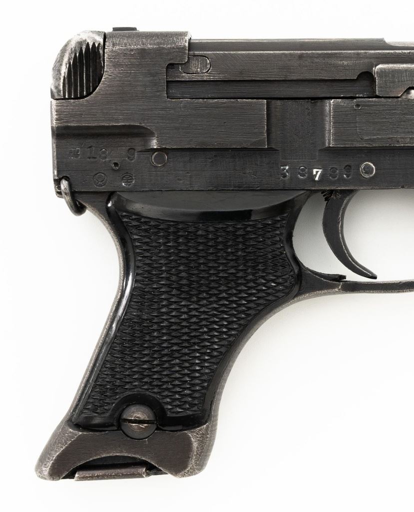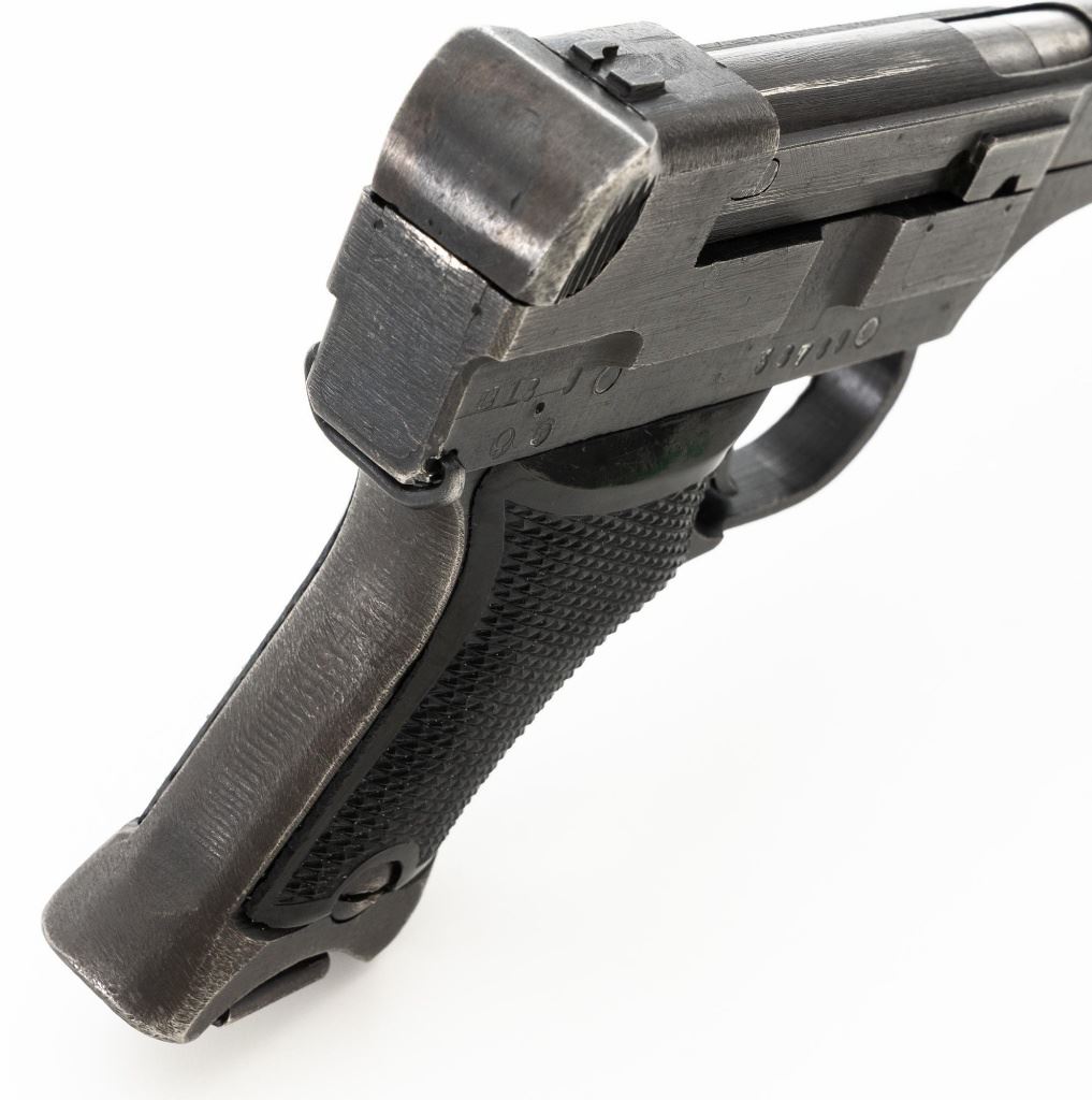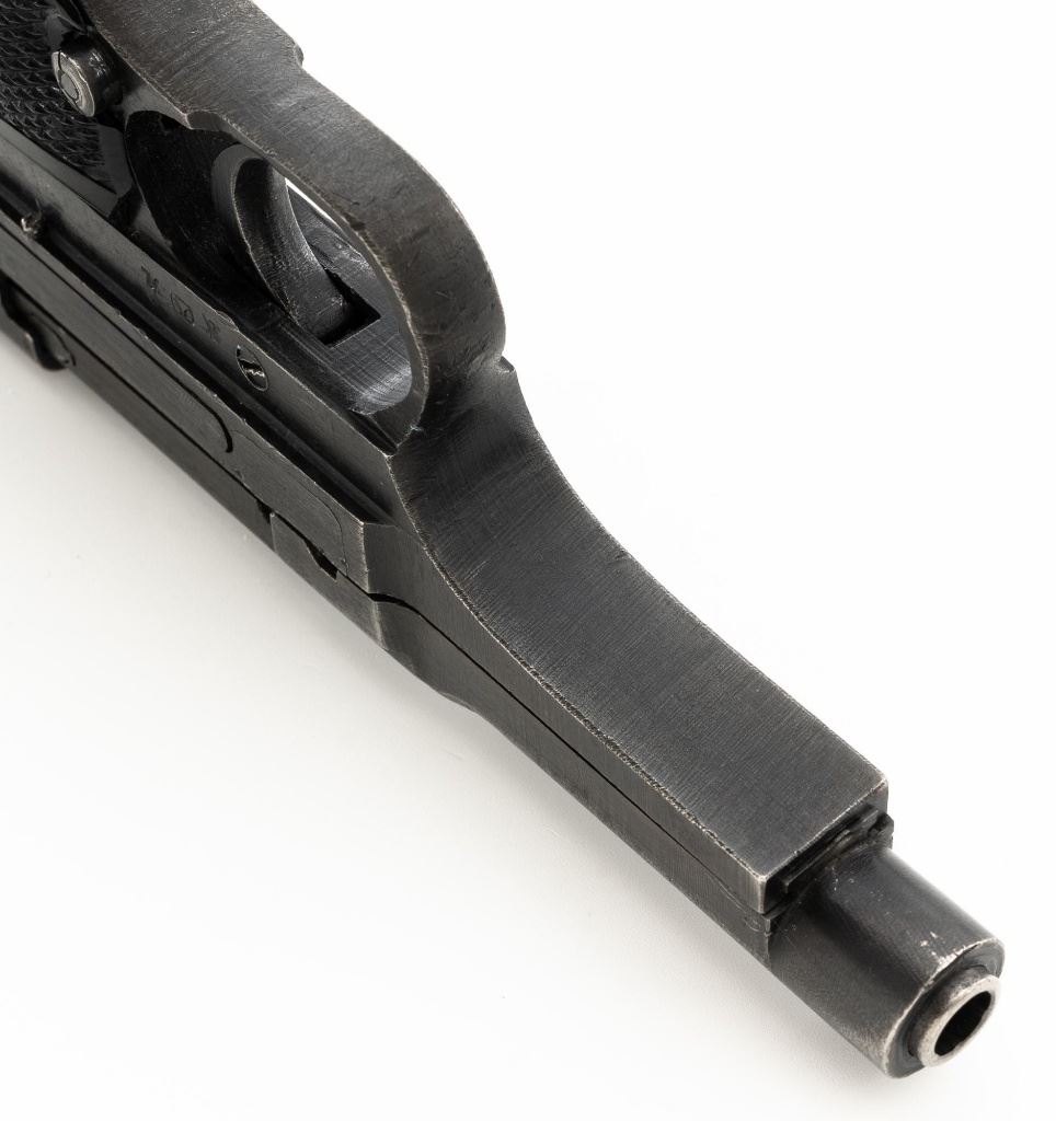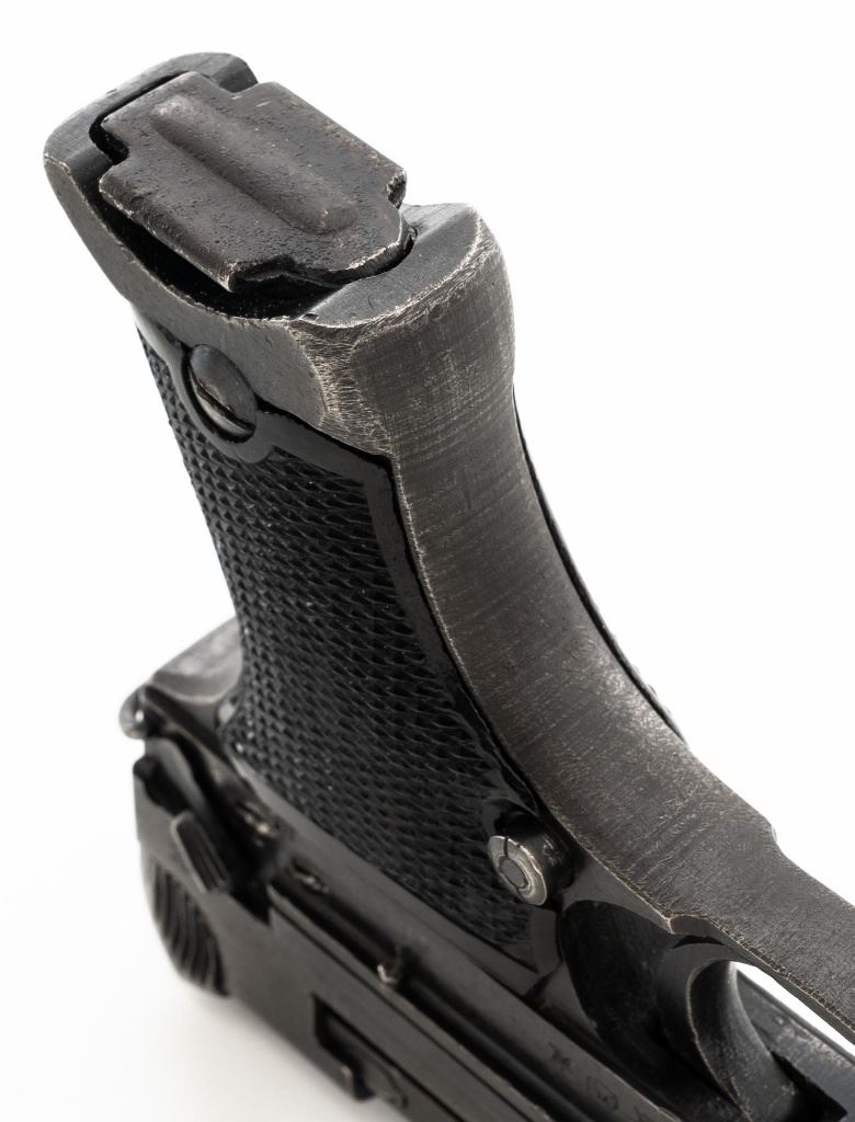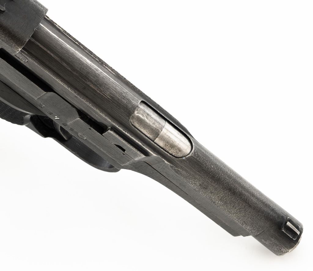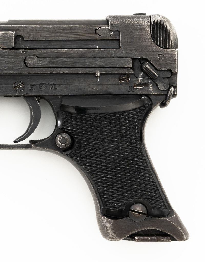 Japanese Type 94 Nambu Semi-Automatic Pistol, #38789, 8x22mm Nambu cal., 3.78" barrel, blued finish, checkered black plastic grips, blade front sight, fixed rear sight with "U"-notched groove, and swiveling lanyard loop on rear of the frame. Includes one original non-matching magazine, numbered "(dot)979" on the spine. Pistol is marked with Japanese characters for "94 Type" on left side of the frame; right side with (Showa symbol)/18.9". for manufacture in September 1943, along with Nagoya Arsenal and Nambu (Central Industries) makers marks. Bolt does not match. No visible import marks. Condition overall is fine, retaining approx. 87%-89% blue, with light edgewear, thinning to the slide, and toning to the grip straps. Grips with light wear and scratches around safety. Action operates smoothly. Bore is bright with very good, clearly defined rifling. Magazine with light pitting to right side of the body. Est.: $600-$900. (C&R/PPT)