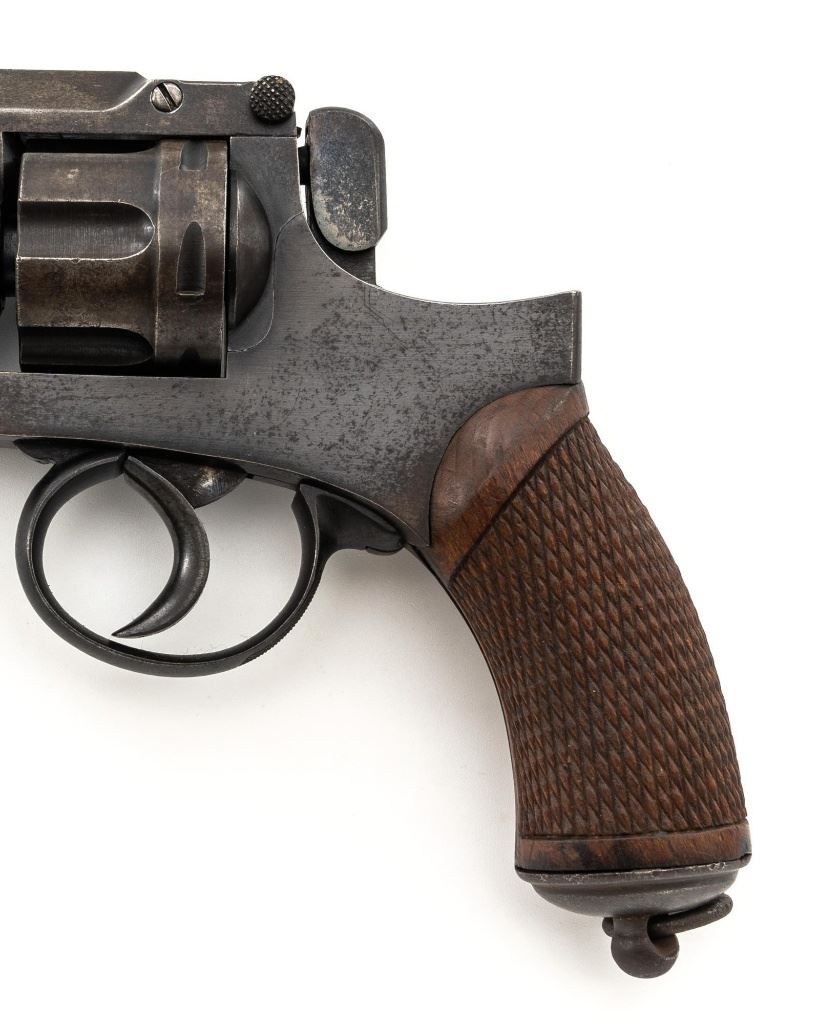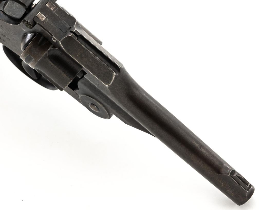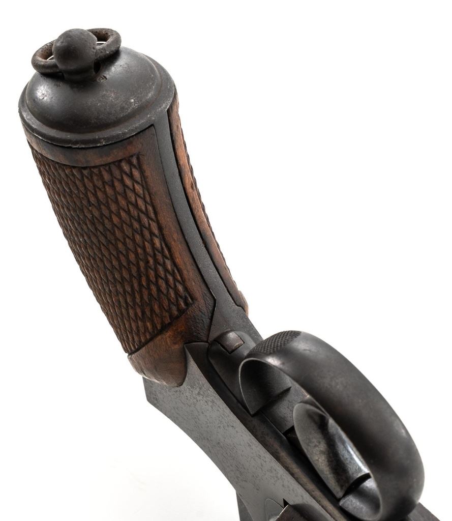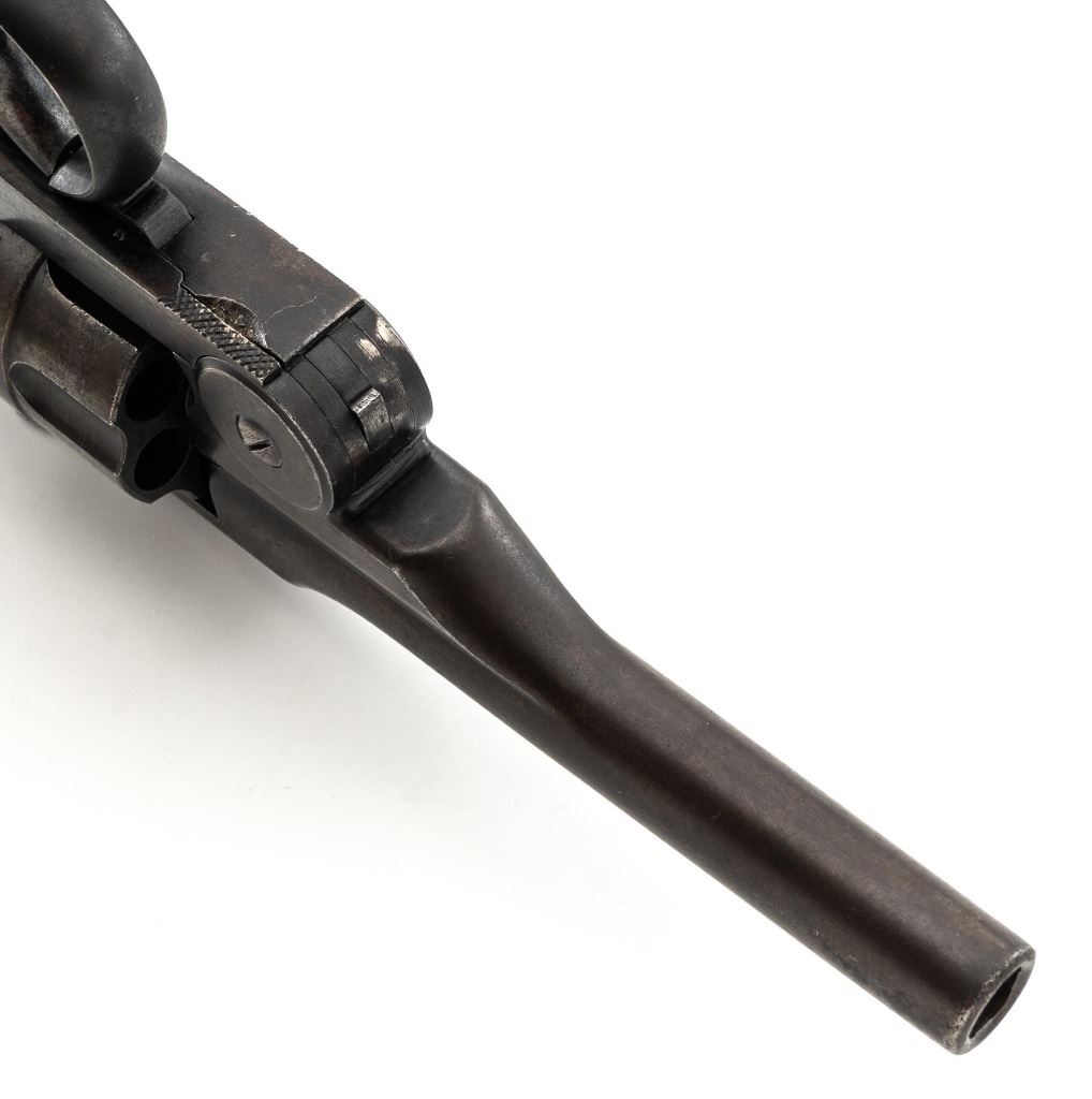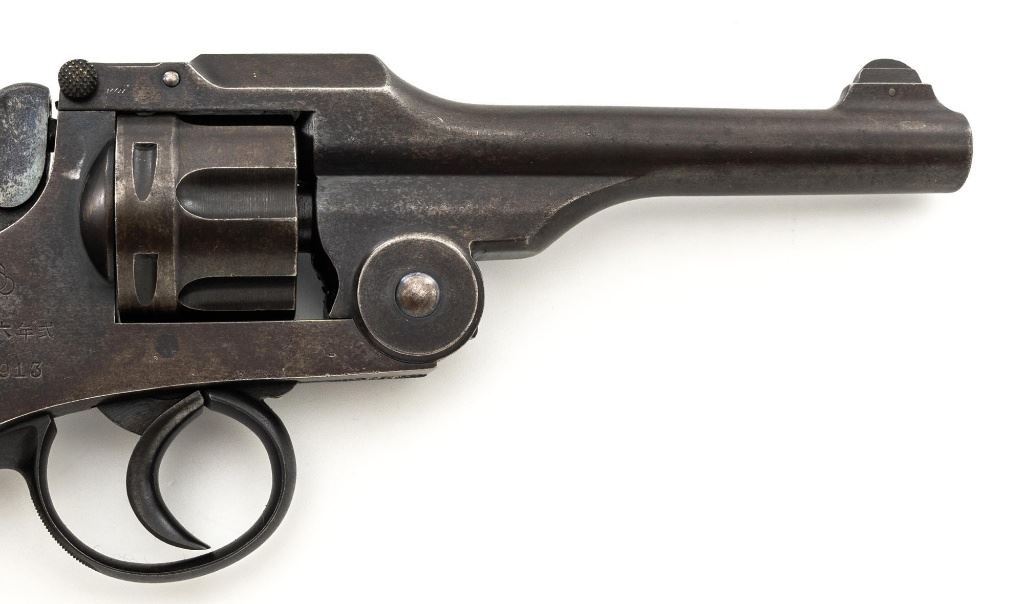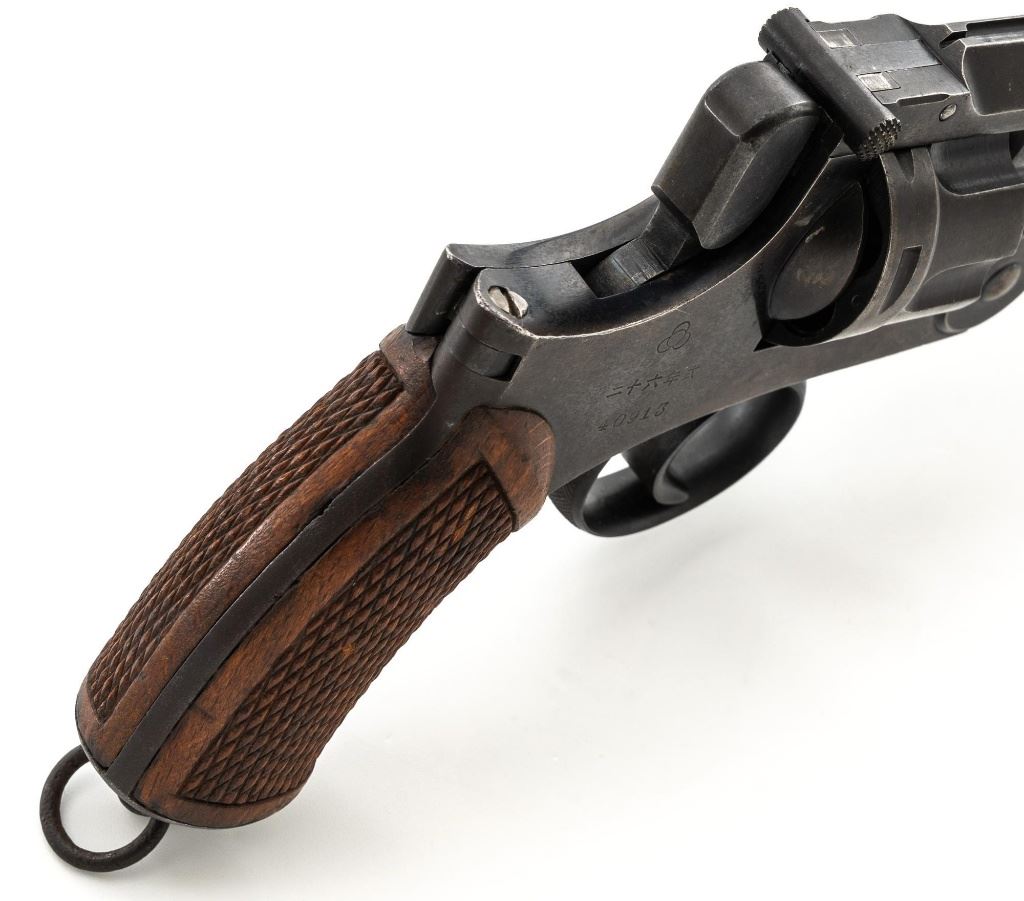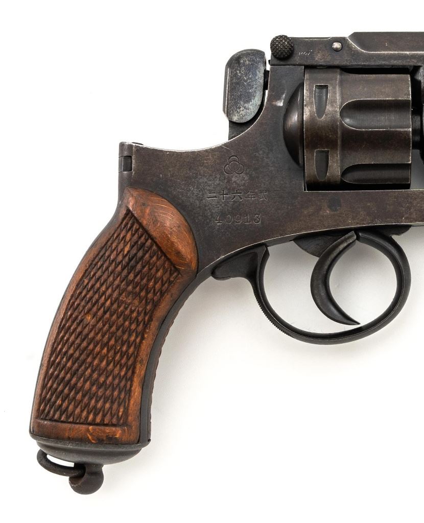Japanese Type 26 Double Action Revolver, #40913, 9x22Rmm cal., 4.76" barrel, blued finish, checkered hardwood grips, pinned blade front sight, fixed rear sight with "U"-notched groove, and swiveling lanyard ring at bottom of the grip frame. Right side of the frame is marked with Tokyo Arsenal makers mark, over characters for "two-ten-six-year-type". Matching number on cylinder. No visible import marks. Condition overall is good, metal has mostly toned brown, with mild frosting across most the surfaces. Grips with scattered marks from handling and use. Action locks up, cycles, and ejects smoothly. Bore rates fair with a few dark areas and good rifling. Est:$300-$500. (C&R/PPT)