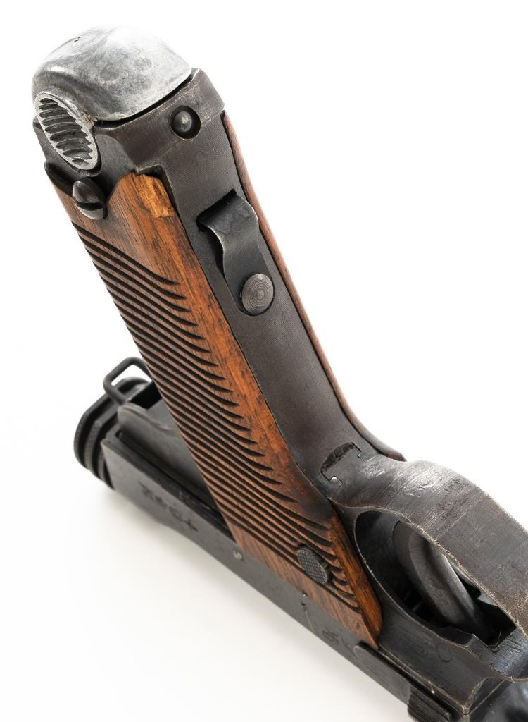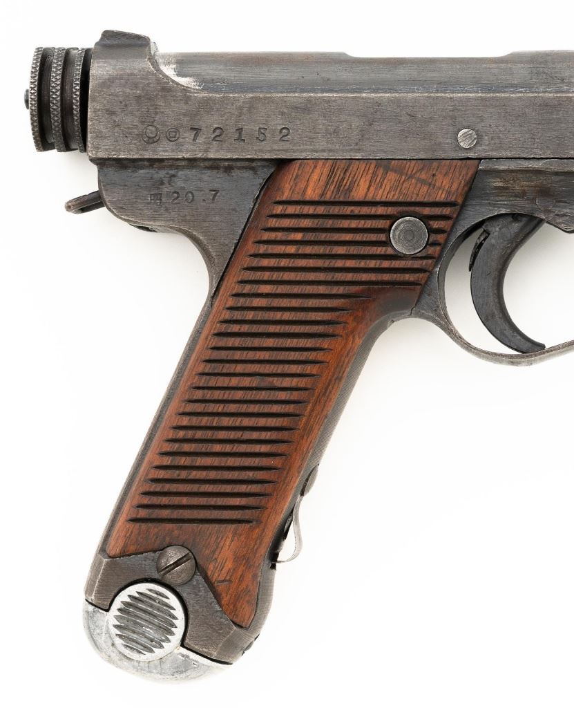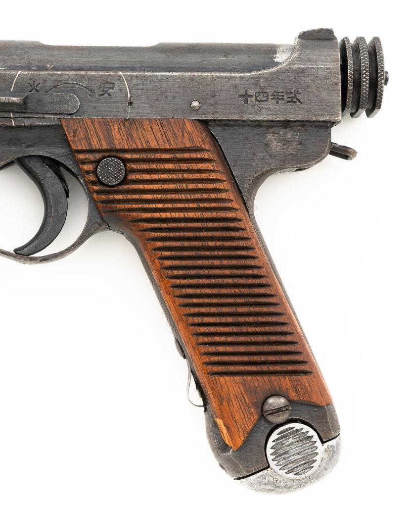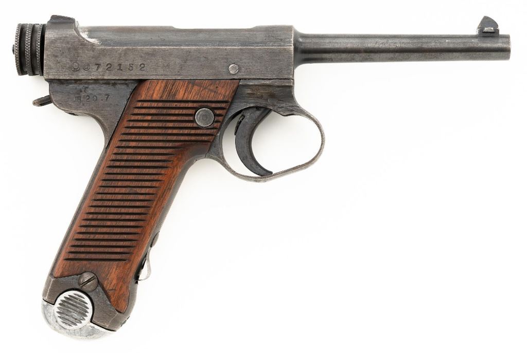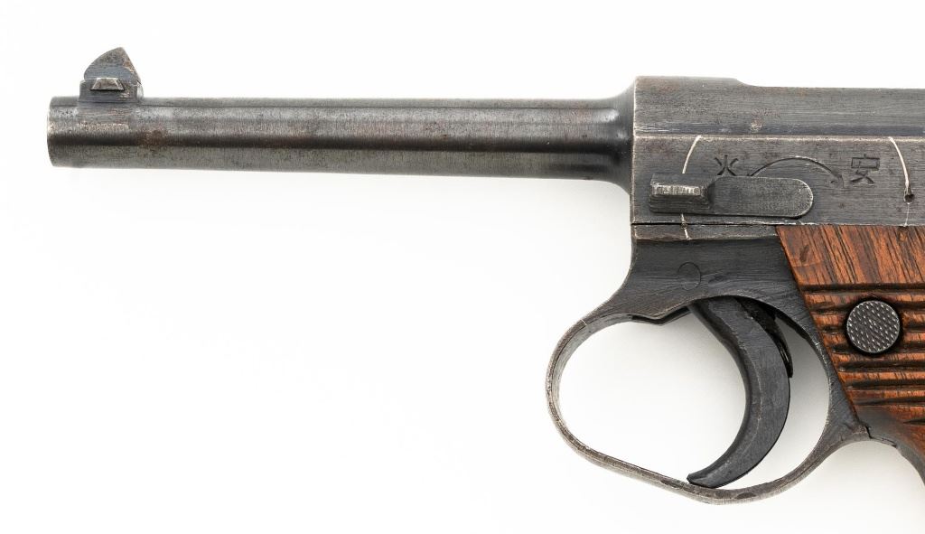 Japanese "Last Ditch" Type 14 Nambu Semi-Automatic Pistol, #72152, 8x22mm Nambu cal., 4.6" barrel, blued finish, grooved hardwood grips, dovetailed inverted-"V" front sight, and fixed rear sight with "U"-notched groove. Includes on aluminum based blued magazine with a cut out for the magazine retention spring. Spine is stamped "(dot)965". Pistol is marked on left side of the frame with four characters for "Type 14", right side Nagoya Arsenal makers mark and a second series "ro" character over a "Sho" character and "20.7" for manufacture in July 1945, with no final acceptance stamp. No serial number visible on bolt or trigger. No import marks. Condition overall is good, retaining less than 50% blue, with brown toning and patina across the surfaces. Grips are good with scattered handling marks and impressions to the darkened finish, with a chip missing from the lower left side. Action operates smoothly. Bore is bright with very good rifling. Est.: $700-$900. (C&R/PPT)