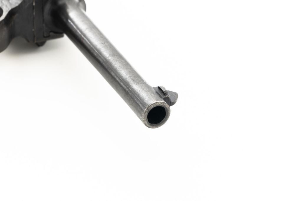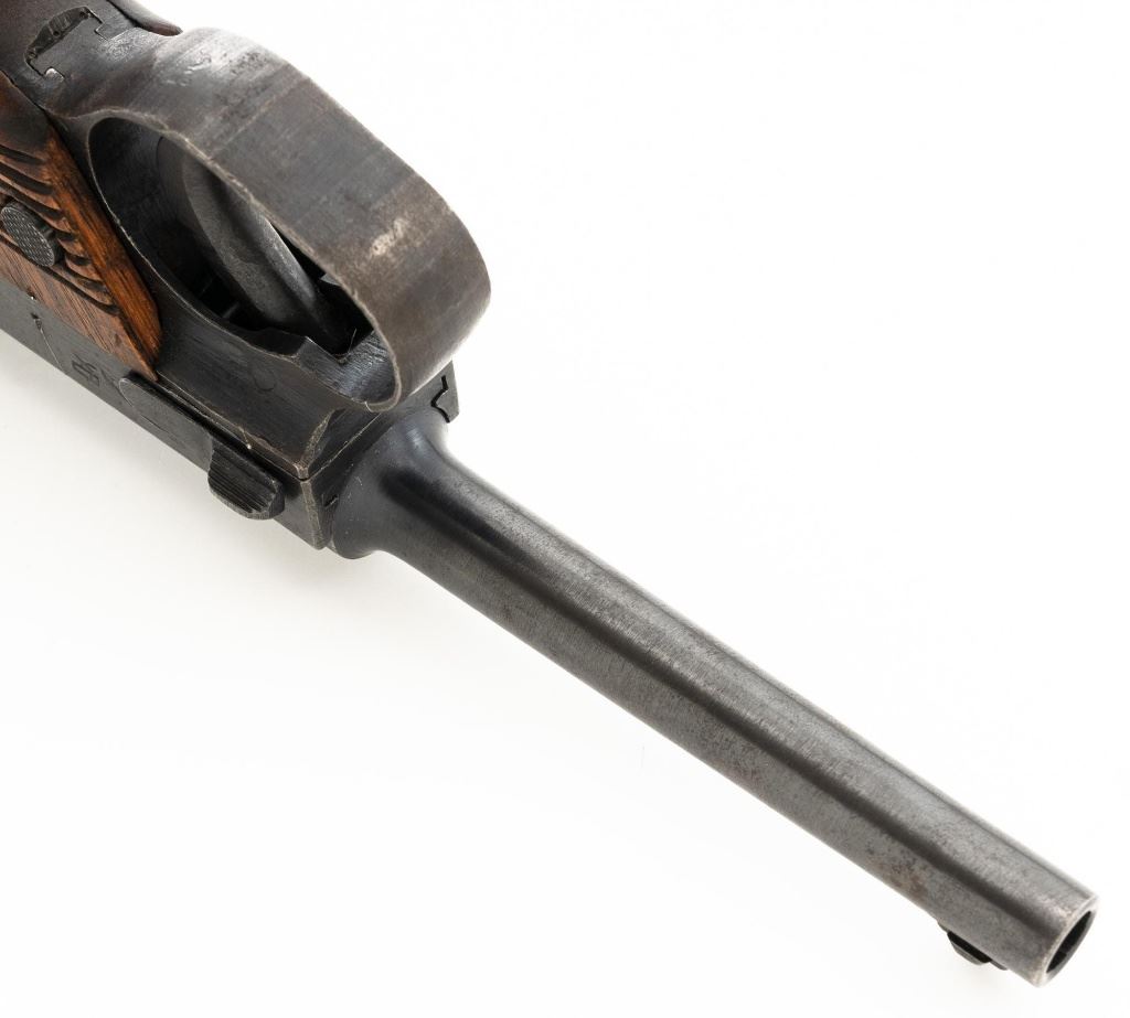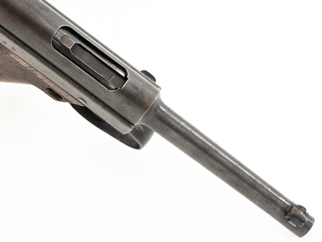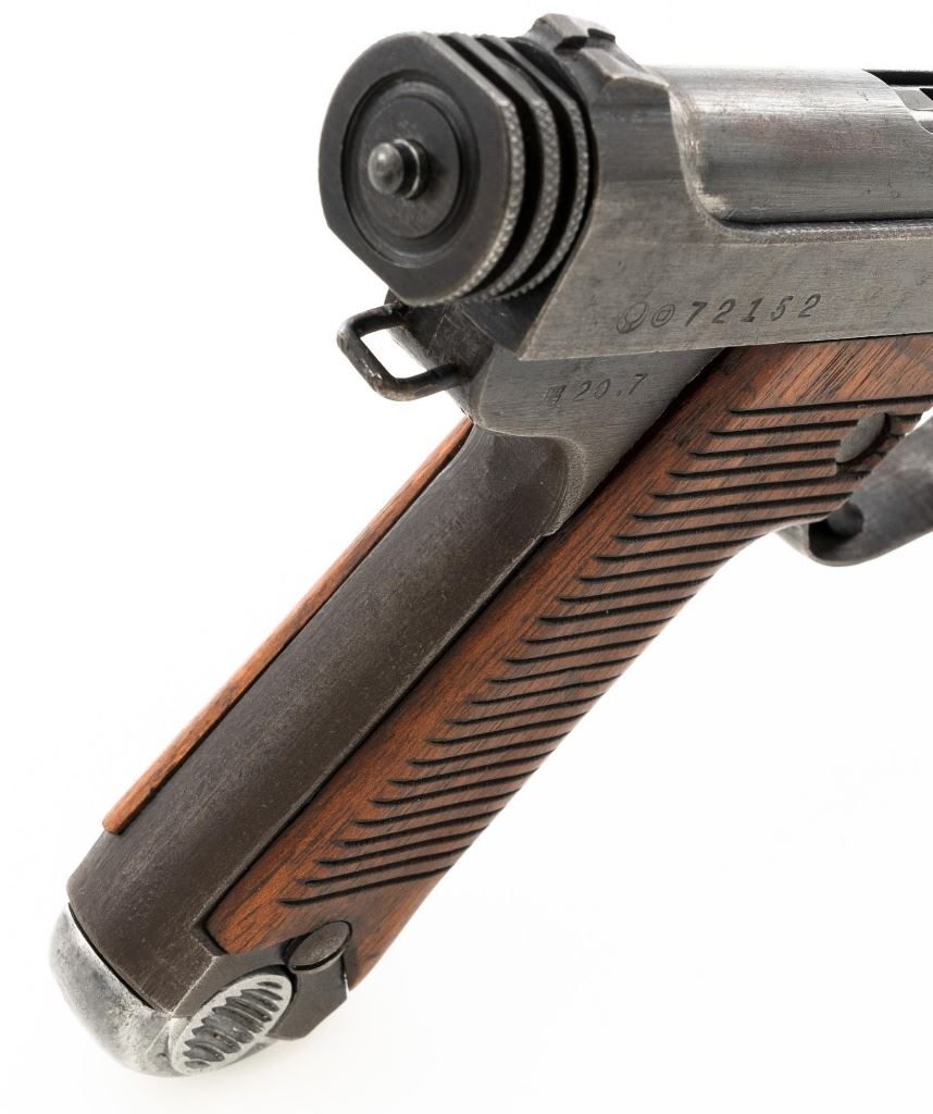 Japanese "Last Ditch" Type 14 Nambu Semi-Automatic Pistol, #72152, 8x22mm Nambu cal., 4.6" barrel, blued finish, grooved hardwood grips, dovetailed inverted-"V" front sight, and fixed rear sight with "U"-notched groove. Includes on aluminum based blued magazine with a cut out for the magazine retention spring. Spine is stamped "(dot)965". Pistol is marked on left side of the frame with four characters for "Type 14", right side Nagoya Arsenal makers mark and a second series "ro" character over a "Sho" character and "20.7" for manufacture in July 1945, with no final acceptance stamp. No serial number visible on bolt or trigger. No import marks. Condition overall is good, retaining less than 50% blue, with brown toning and patina across the surfaces. Grips are good with scattered handling marks and impressions to the darkened finish, with a chip missing from the lower left side. Action operates smoothly. Bore is bright with very good rifling. Est.: $700-$900. (C&R/PPT)