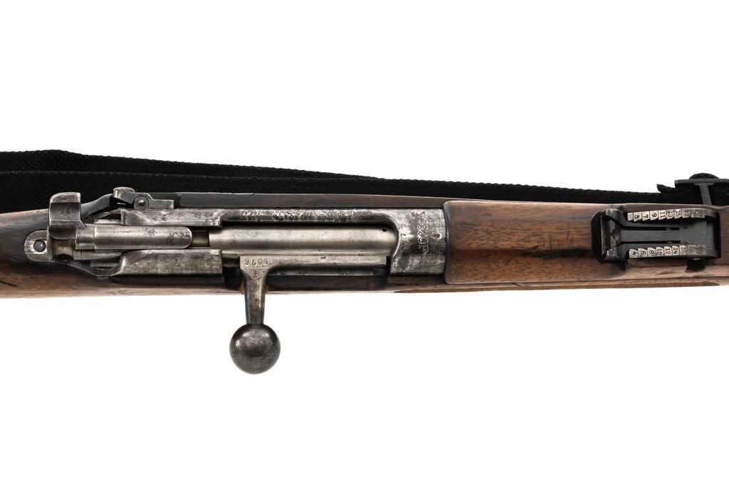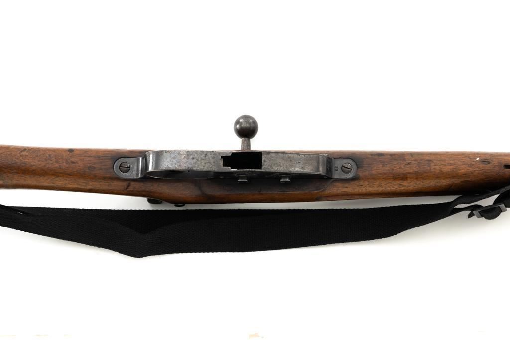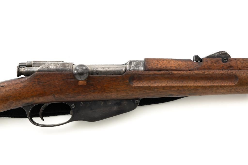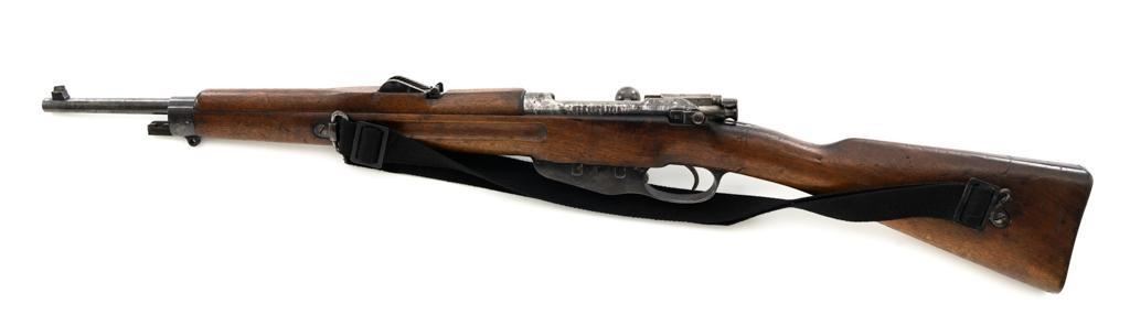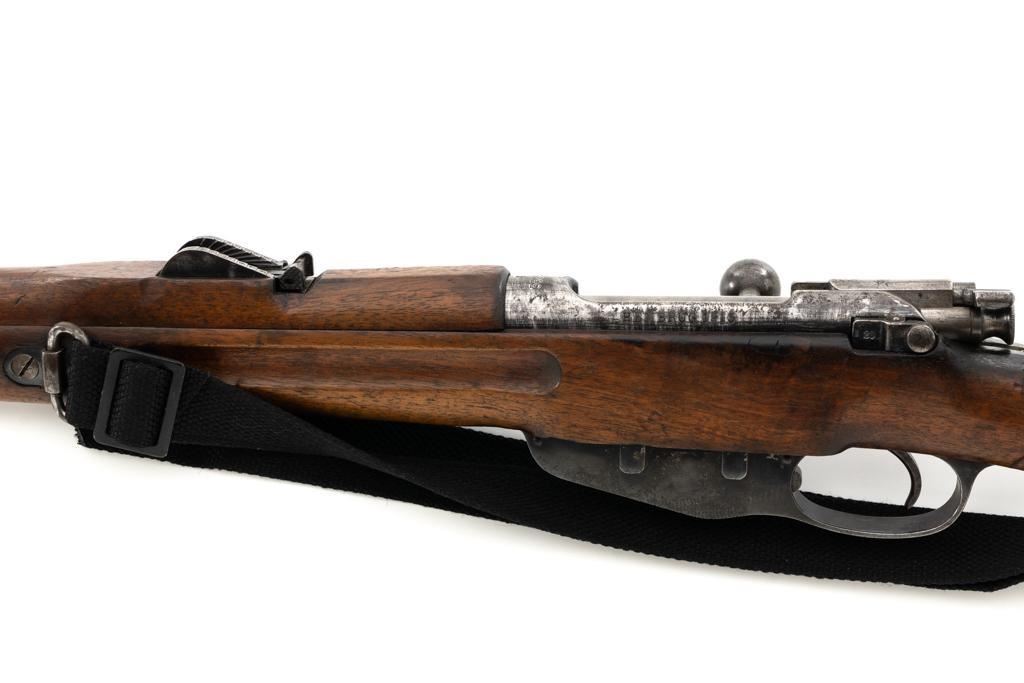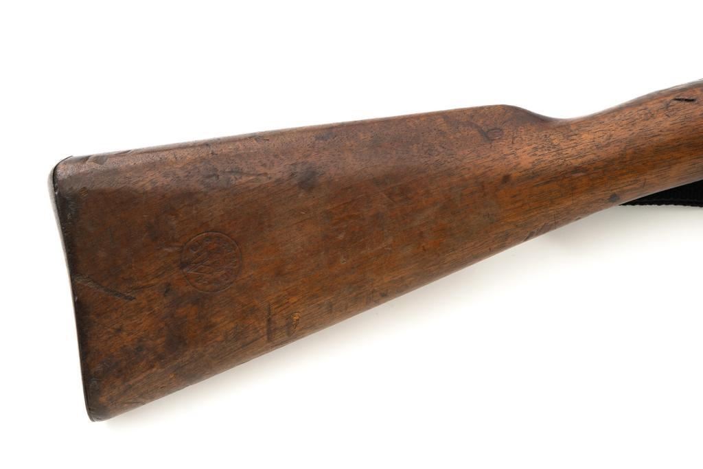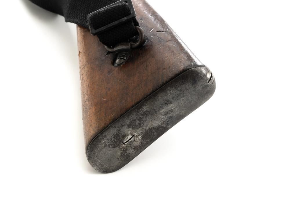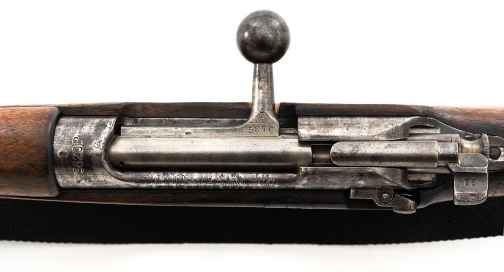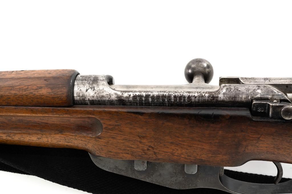 Dutch M95 No.4 Mannlicher Bolt Action Carbine, #3620P, 6.5x53Rmm cal., 18" barrel, blued finish with bright bolt body, hardwood stock and handguard, dovetailed inverted-"V" front sight, and adjustable rear sight with "V"-notched groove, graduated to 2000 meters. Includes a black nylon sling. Left side of the receiver rail is marked "HEMBRUG 1915" with a crowned inspection stamp on top of the receiver ring. The clear, well struck stamp on right side of the buttstock reads "HEMBRUG 1925" surrounding a "(crowned)W". Matching bolt, other numbers do not match. No visible import marks. Condition overall is good, receiver appears to have been partially cleaned, now showing residual bluing, balance is mixture of gray metal and brown patina. Bolt handle has toned darker. A square notch has been carved into right side of the forend, below the bolt handle. Otherwise, wood with numerous dents and scratches scattered throughout. Action functions well. Bright bore rates excellent, with well-defined rifling. Est.: $250-$350. (C&R)