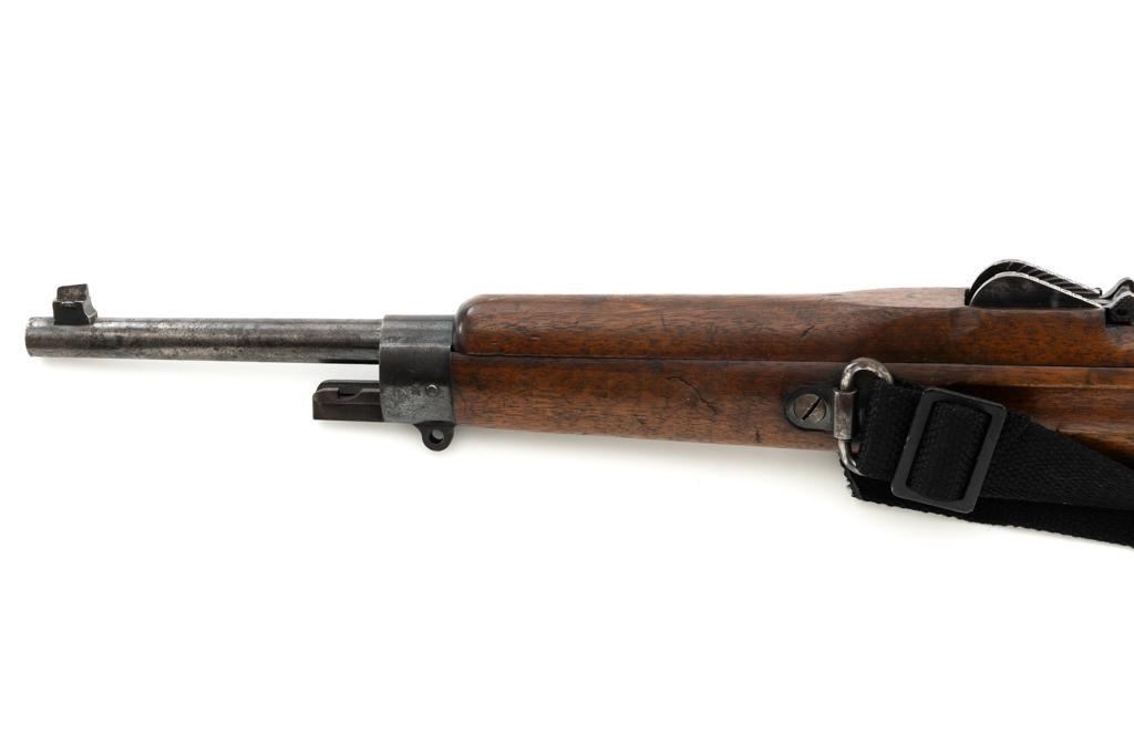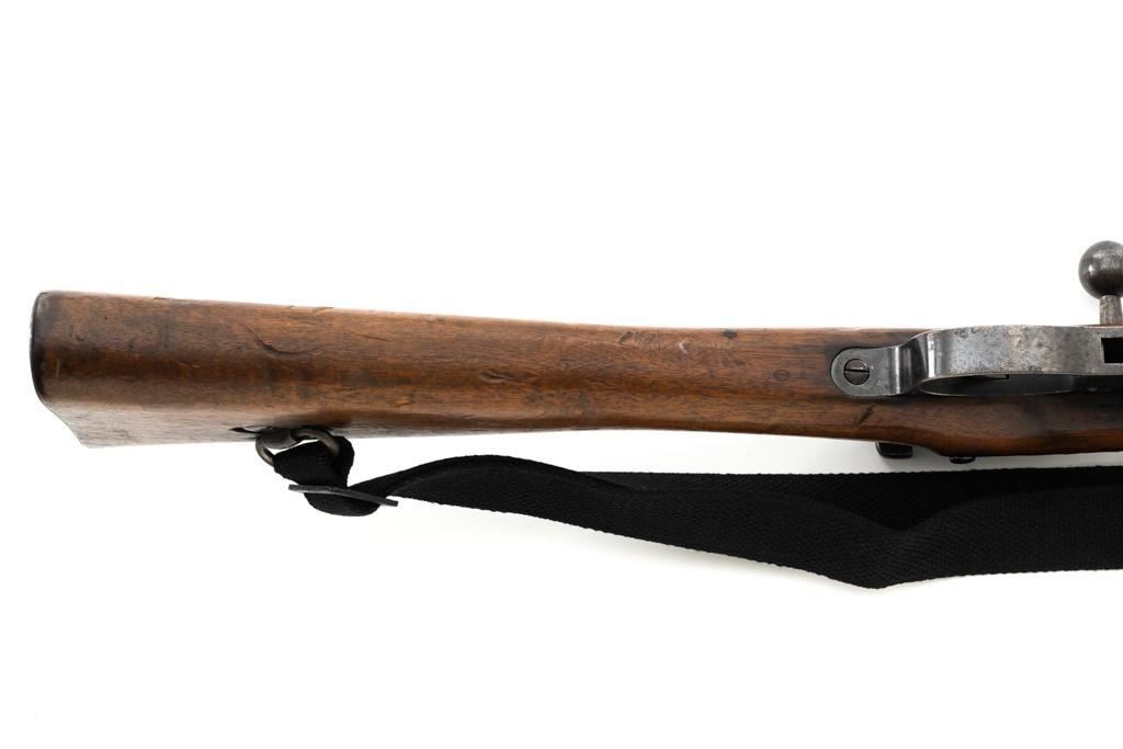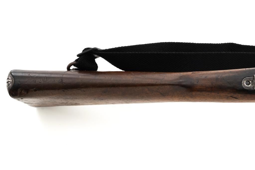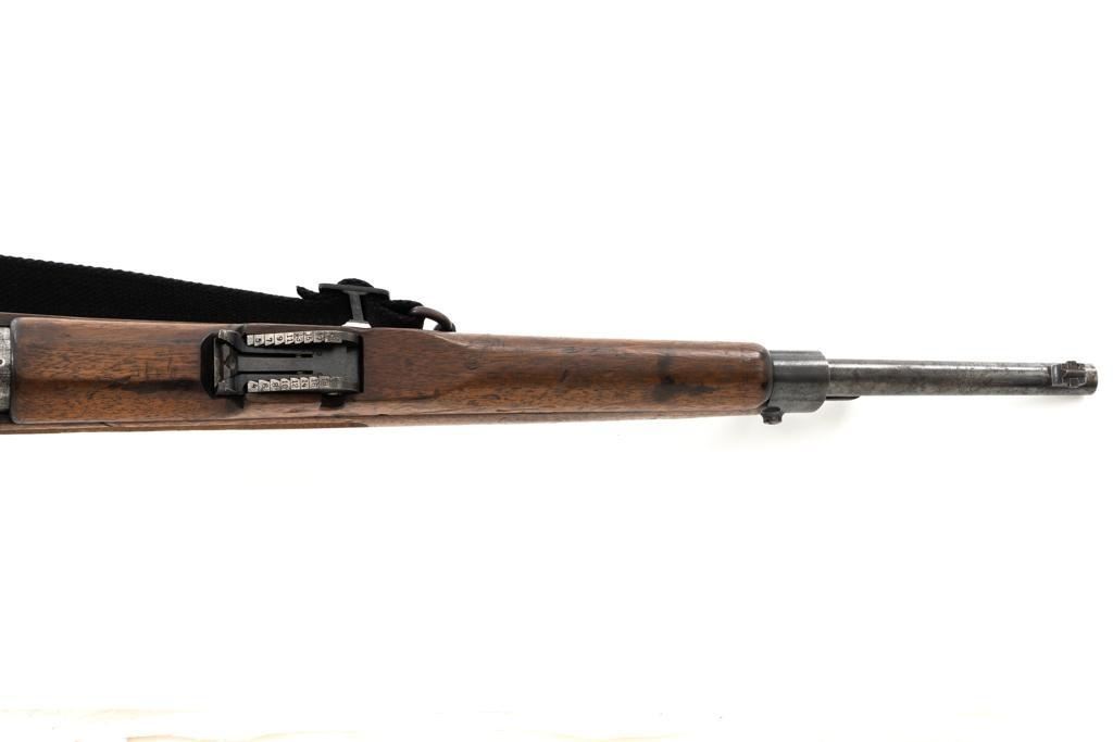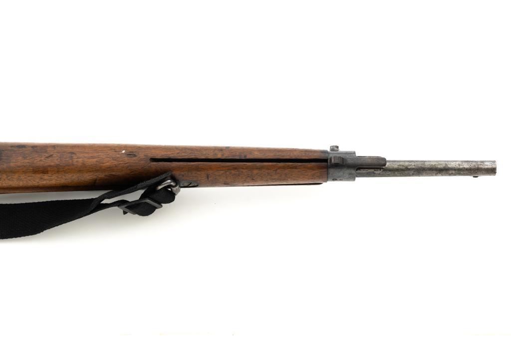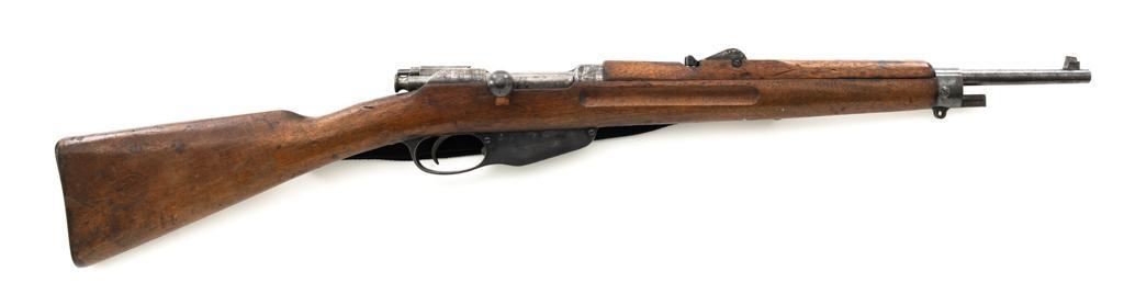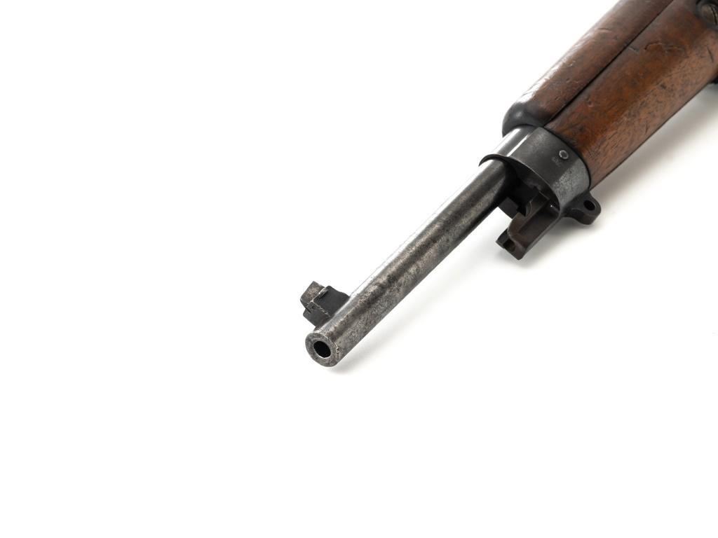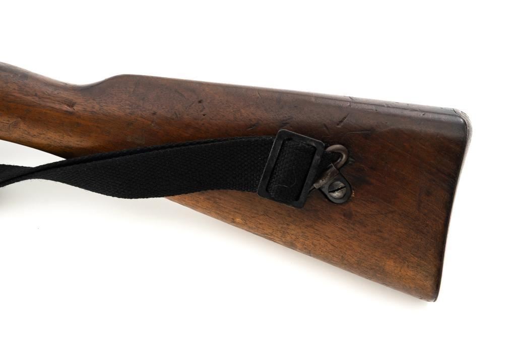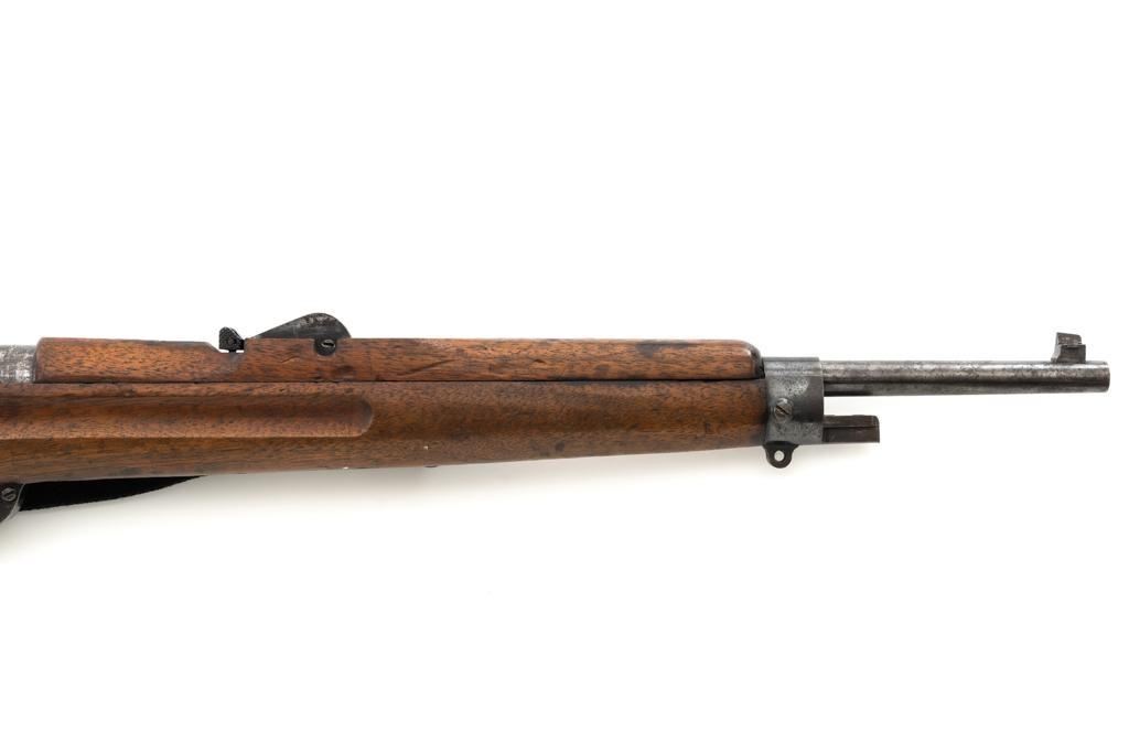 Dutch M95 No.4 Mannlicher Bolt Action Carbine, #3620P, 6.5x53Rmm cal., 18" barrel, blued finish with bright bolt body, hardwood stock and handguard, dovetailed inverted-"V" front sight, and adjustable rear sight with "V"-notched groove, graduated to 2000 meters. Includes a black nylon sling. Left side of the receiver rail is marked "HEMBRUG 1915" with a crowned inspection stamp on top of the receiver ring. The clear, well struck stamp on right side of the buttstock reads "HEMBRUG 1925" surrounding a "(crowned)W". Matching bolt, other numbers do not match. No visible import marks. Condition overall is good, receiver appears to have been partially cleaned, now showing residual bluing, balance is mixture of gray metal and brown patina. Bolt handle has toned darker. A square notch has been carved into right side of the forend, below the bolt handle. Otherwise, wood with numerous dents and scratches scattered throughout. Action functions well. Bright bore rates excellent, with well-defined rifling. Est.: $250-$350. (C&R)