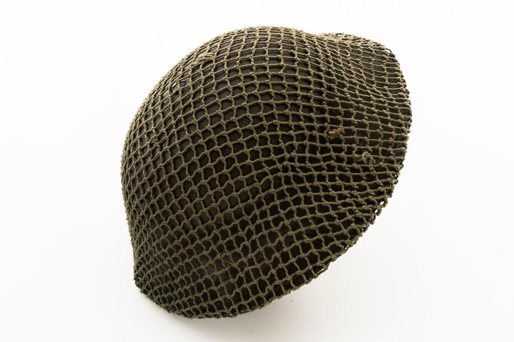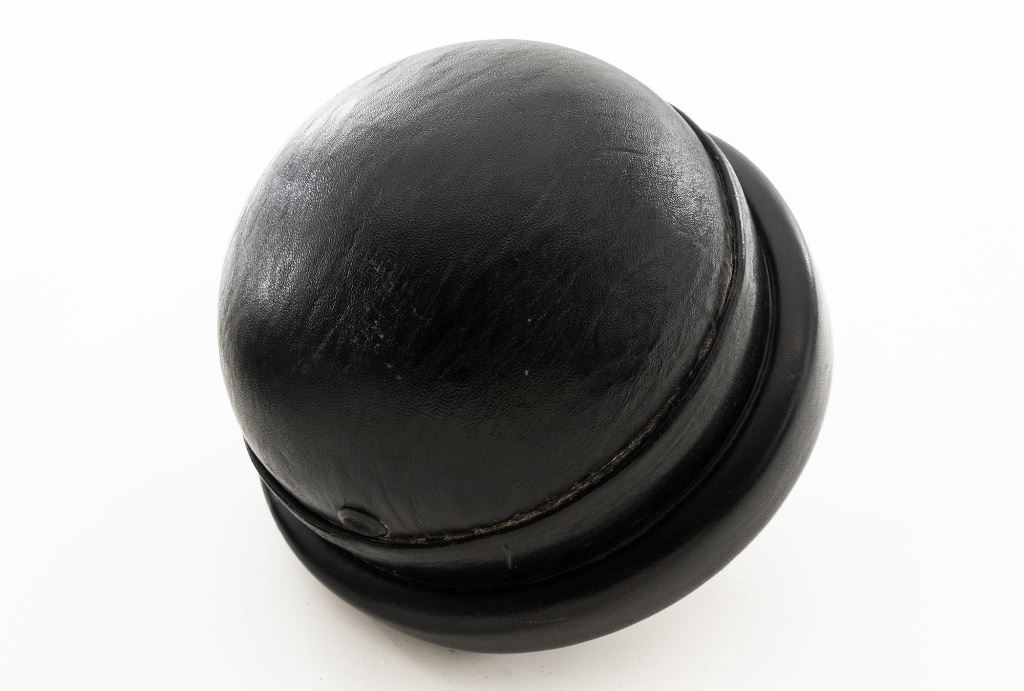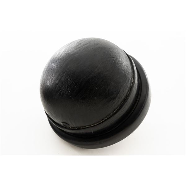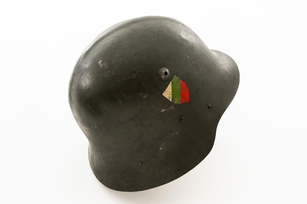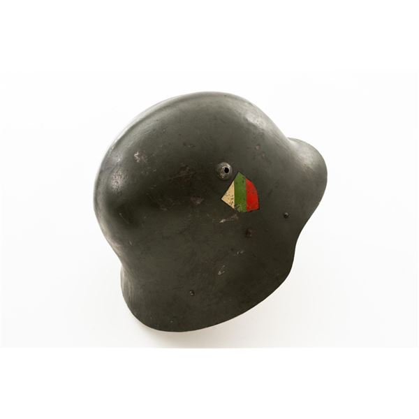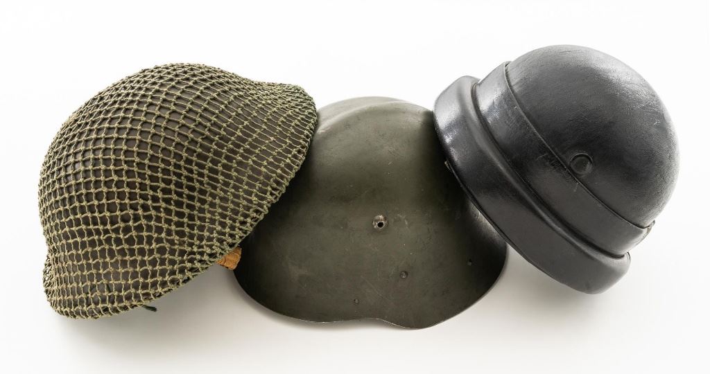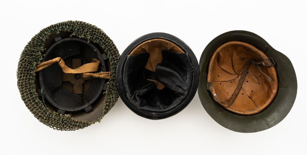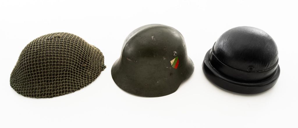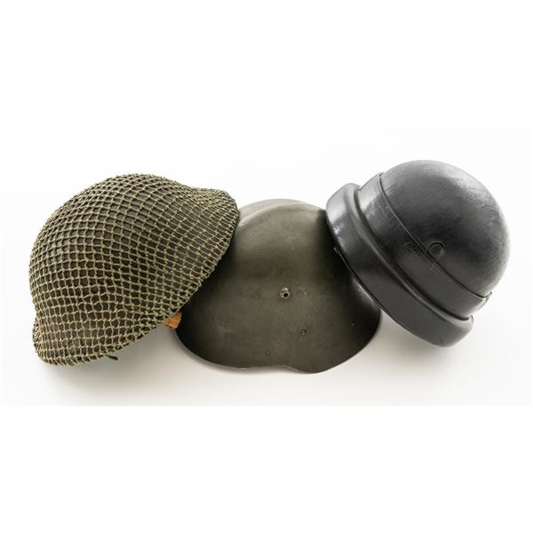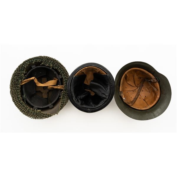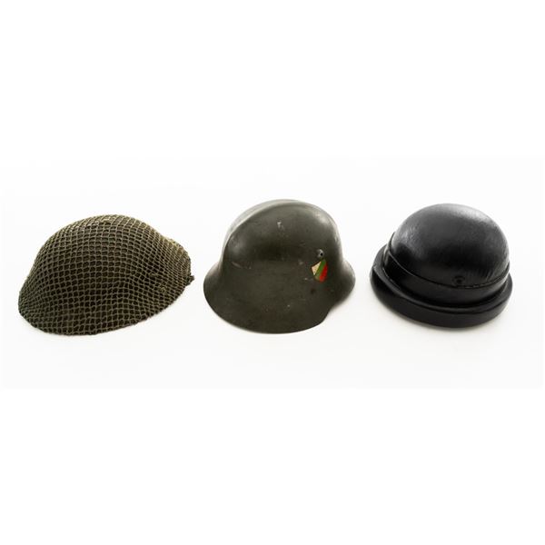 Lot of Three (3) Military Helmets: 1.) Post-War Italian black leather tankers helmet with chin strap and neck protector, tan leather liner and cushioned interior. Marked size "59". Condition is very good+, with light handling marks and scuffs to the shell, moderate wear and darkening to the liner. 2.) Bulgarian M36C steel helmet with tan leather liner and chin strap. Marked with Bulgarian flag shield decal on right side of shell and size "58" on liner. Condition is good, with a few small dents, wear and patina to shell. Liner and chin strap show moderate age and wear. 3.) Canadian Mk II steel helmet with liner, chin strap, and net cover. Marked "G.S.W." on rim as made by General Steel Wares and "DP&H" for issue to the Department of Pensions and Health. Liner is marked with size "7 1/4". Condition is very good, with light rust around rim of shell, scuffs to liner, and light wear to chin strap and net. Est.: $150-$250/lot.