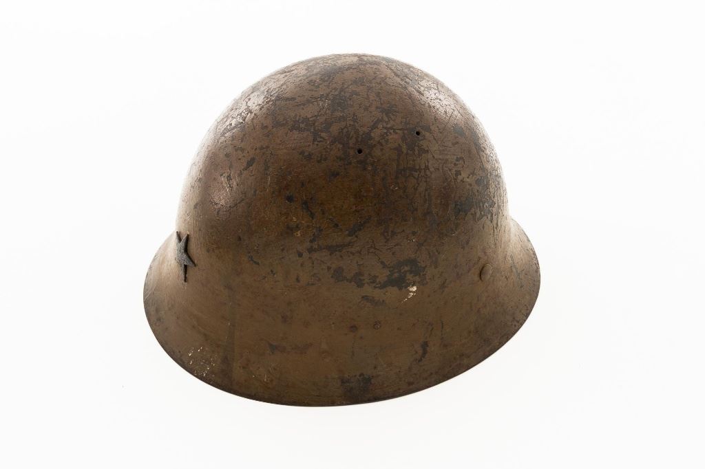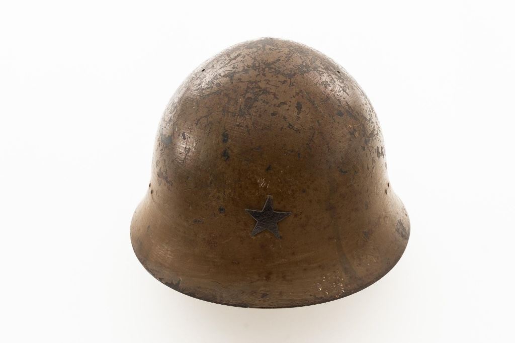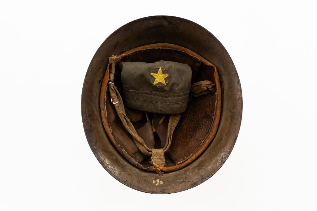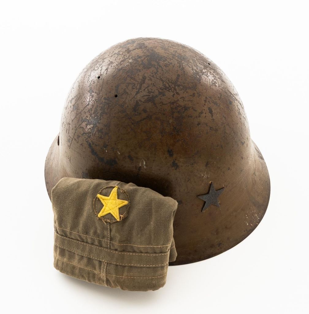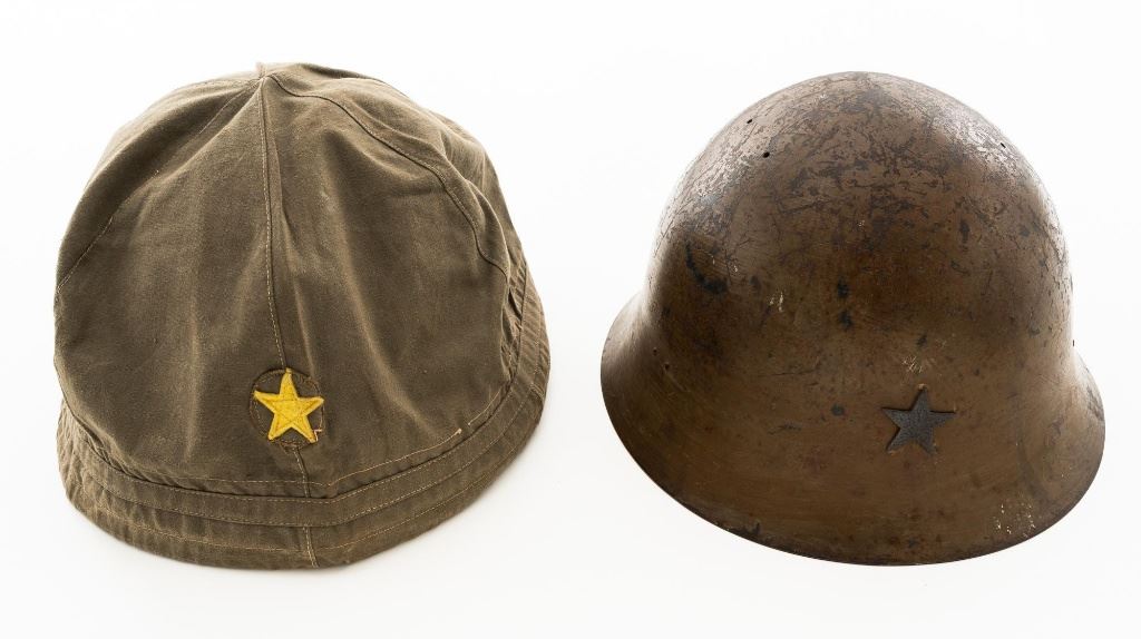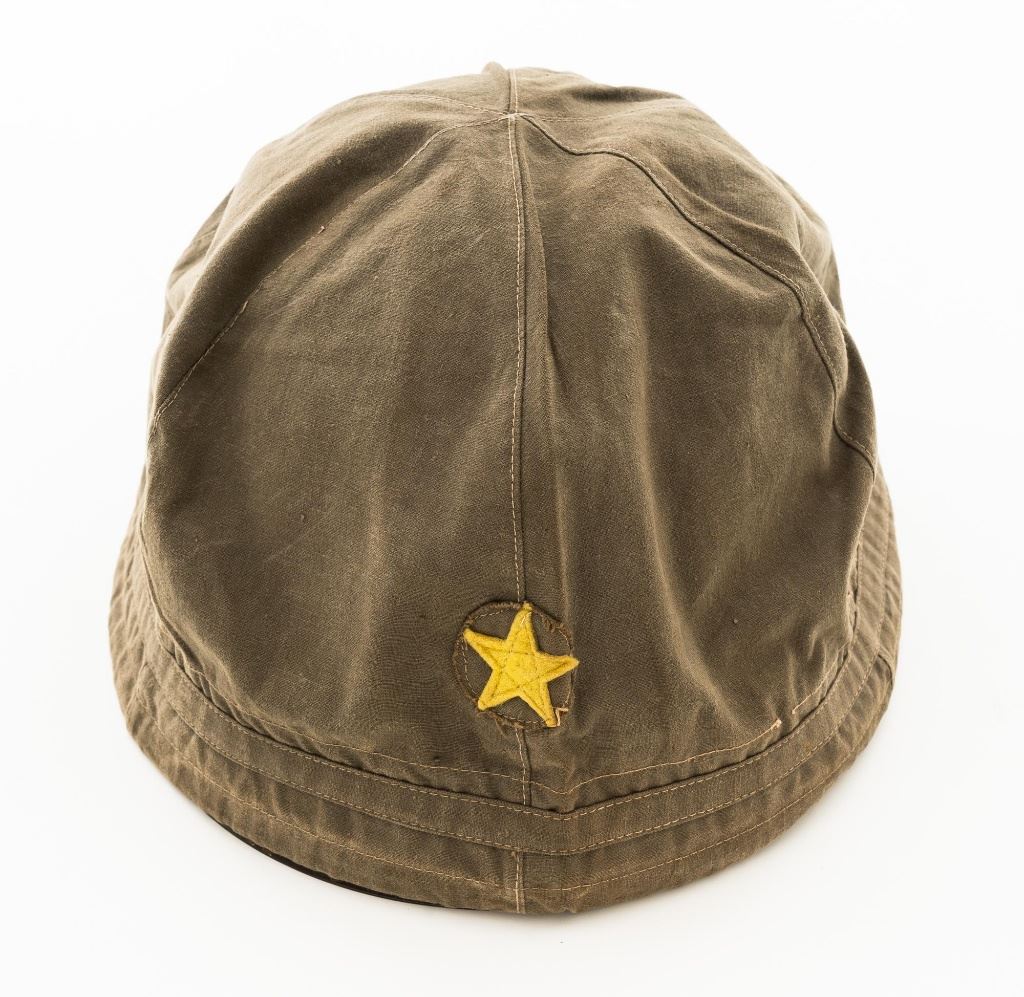 Japanese Type 90 Steel Helmet with Liner and Reproduction Cloth Cover, a five pointed star is attached to the front of the brown painted shell and marked with a white painted size Japanese character on rear of the brim. Brown leather liner is made with three pads attached to a leather band. Cloth chin strap is attached to the sides and rear of the shell. Condition is good, showing typical age and wear, with scratches and patina to the shell. Liner is dry and shows darkening and wear. Chin strap is good, showing light soiling. Cloth cover has a five pointed yellow star sewn to the front and is in very good condition. Est.: $200-$400.