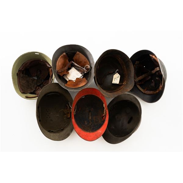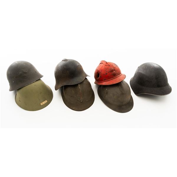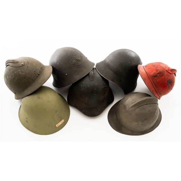 Lot of Seven (7) Steel Military Helmets: 1.) Swiss M1918 with liner, marked "A/853947". Condition is good overall. 2.) Romanian M73 with liner, no chinstrap, painted olive drab green. In good condition, front of liner is torn. 3.) Swedish M26 with liner, marked with "(three crowns)" badge and decal. In very good condition with light wear and toning. 4.) French Adrian, no liner, with "(flaming grenade)RF" badge, painted red. In fair condition, with a hole in the right side. 5.) French Adrian, no liner, no markings, painted olive drab green. In fair condition with wear and flaking to the finish. 6.) French Adrian, not liner, no markings, painted olive drab green. In fair condition with torn chin strap. 7.) Soviet SSH-36, no liner, with chin strap. In good condition with wear and patina. Est.: $200-$300/lot.