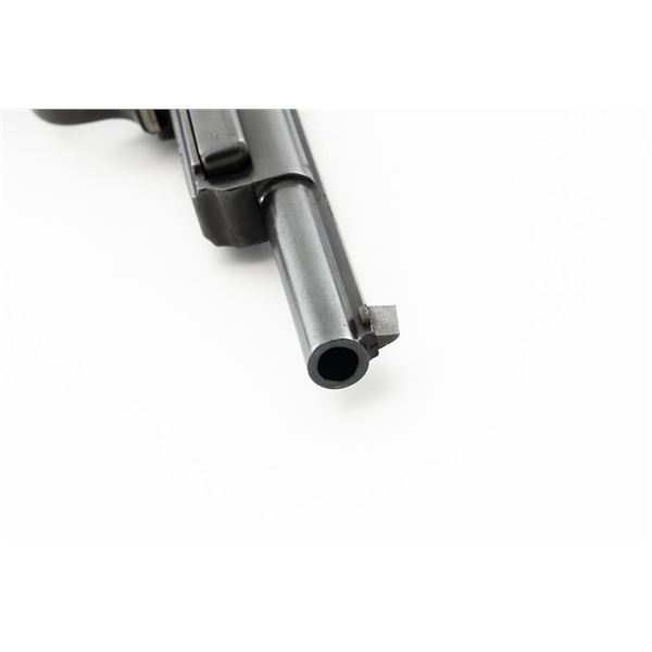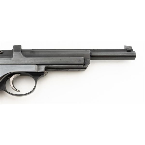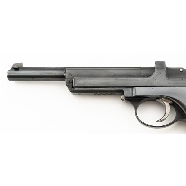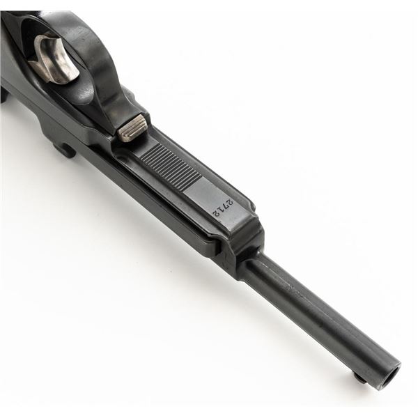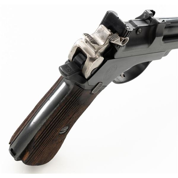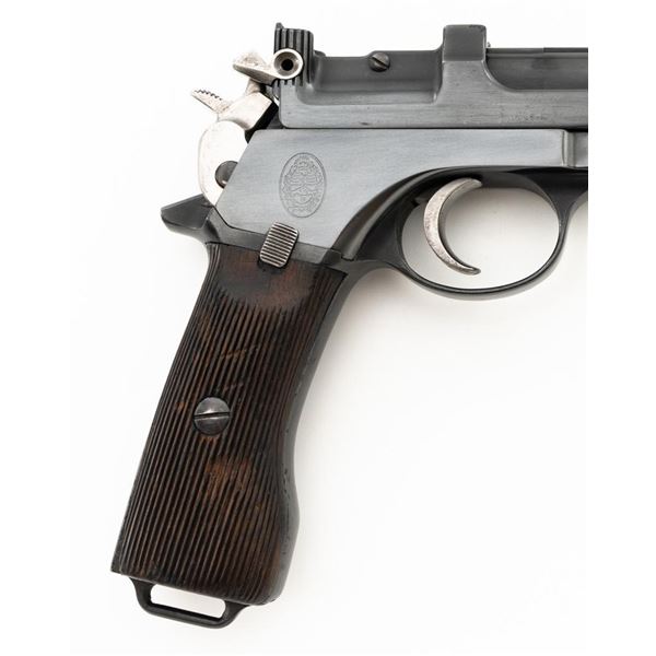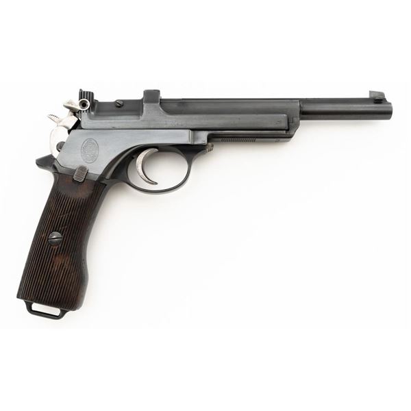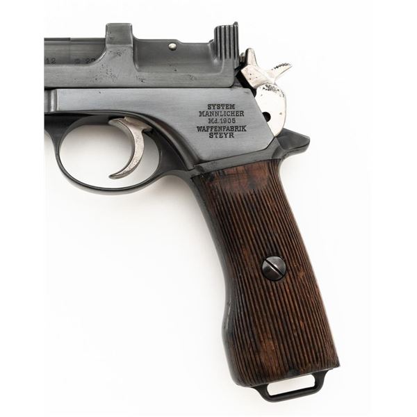 Argentine Contract Steyr Model 1905 Mannlicher Semi-Automatic Pistol, #2712, 7.65x21mm cal., 6.3" barrel, blued finish with bright hammer and trigger, grooved hardwood grips, dovetailed inverted-"V" front sight, fixed rear sight with "V"-notched groove, and fixed lanyard loop at bottom of the frame. Right side of the frame is marked with an intact Argentine crest and the left side with "SYSTEM/MANNLICHER/Md.1905/WAFFENFABRIK/STEYR". Matching numbers. No visible import marks. Condition overall is very good, retaining nearly all of the reblued finish, which was applied over spots of light pitting. There are also some mild spots of pitting and patina on the hammer. Grips are fair, with bruises and handling marks to both sides. Action operates smoothly. Bore is bright with very good, well-defined rifling. Est.: $600-$900. (C&R)