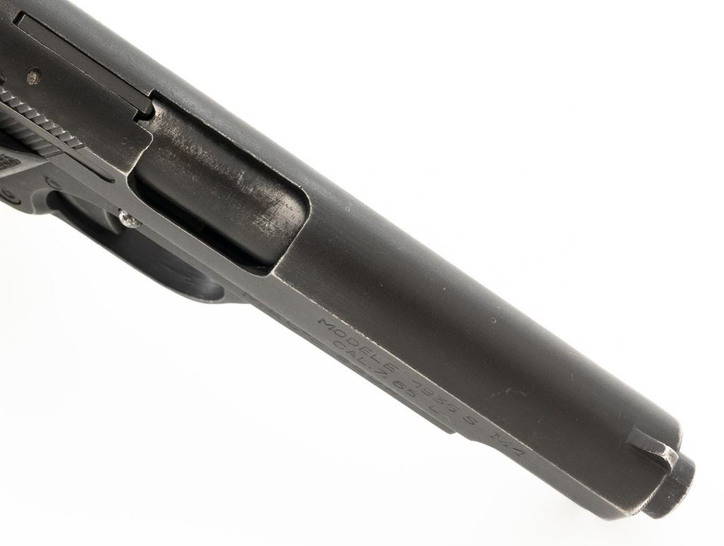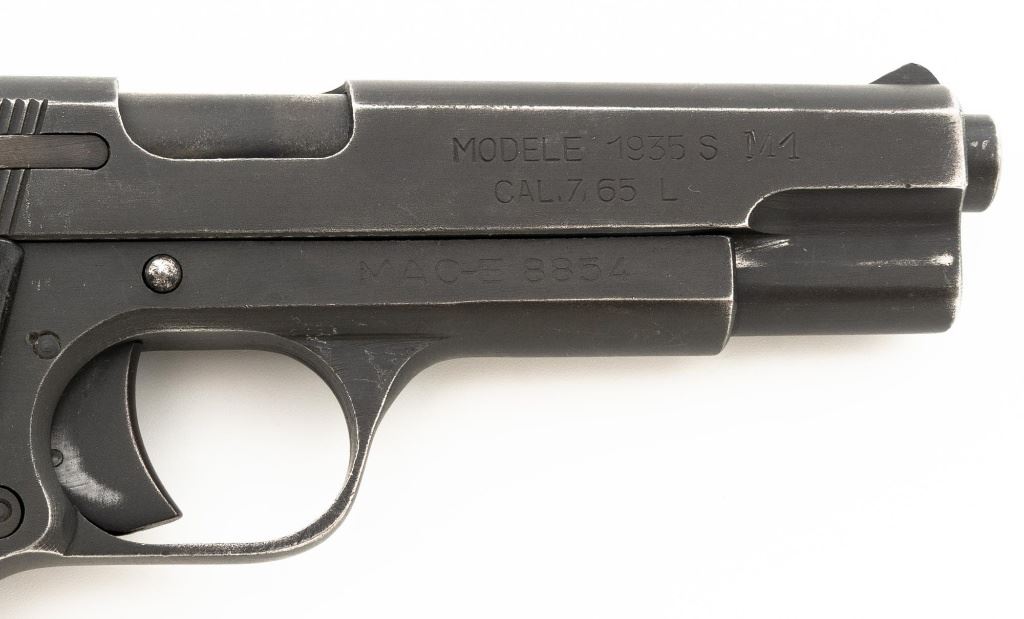 French MAC Model 1935-S Semi-Automatic Pistol, #8854, 7.65 French Long cal., 4.1" barrel, phosphate finish, checkered polymer two-piece grips, lanyard loop, with one 8-round blue steel magazine. Magazine base is marked "1935-S". No visible import marks. Pistol is in near fine overall condition, retaining approx. 90%-95% thinning factory finish, with holster wear, scuffs, and scattered spots of light erosion. Grips are very good, with smoothing and flattening on the right panel. Action functions well. Bore is very good with minor visible erosion and well-defined rifling. The Model 1935-S was manufactured from 1939-1953, last issued to the French Foreign Legion fighting in Indo-China in 1953-1954. Est.: $400-$600. (C&R/PPT)