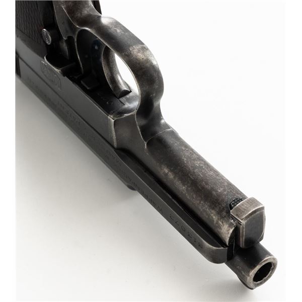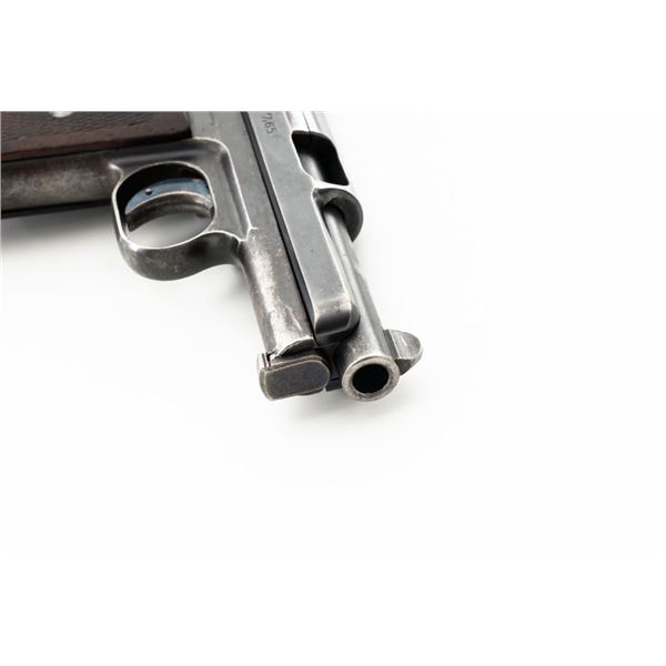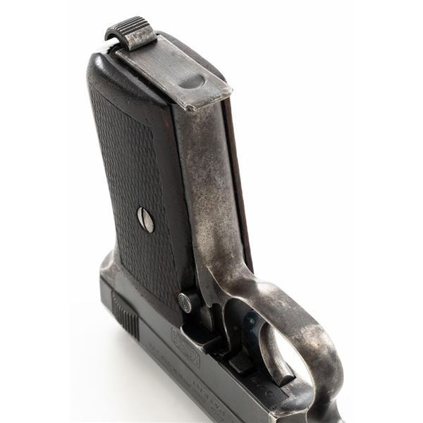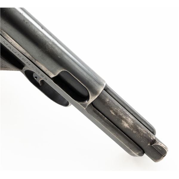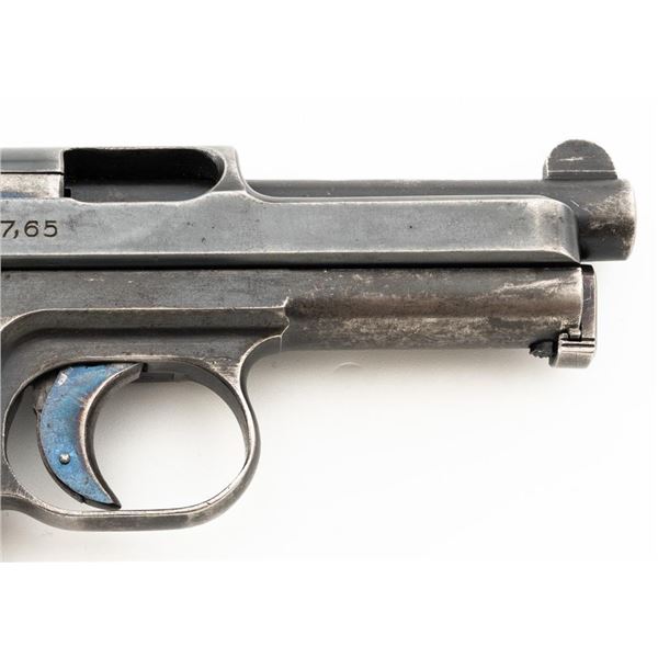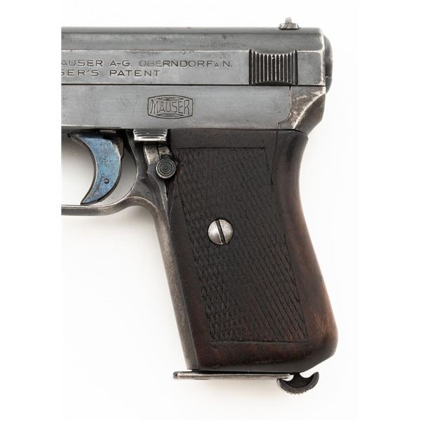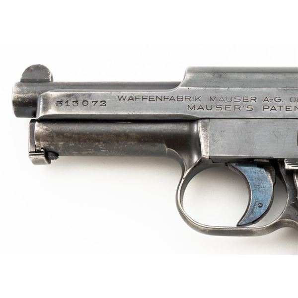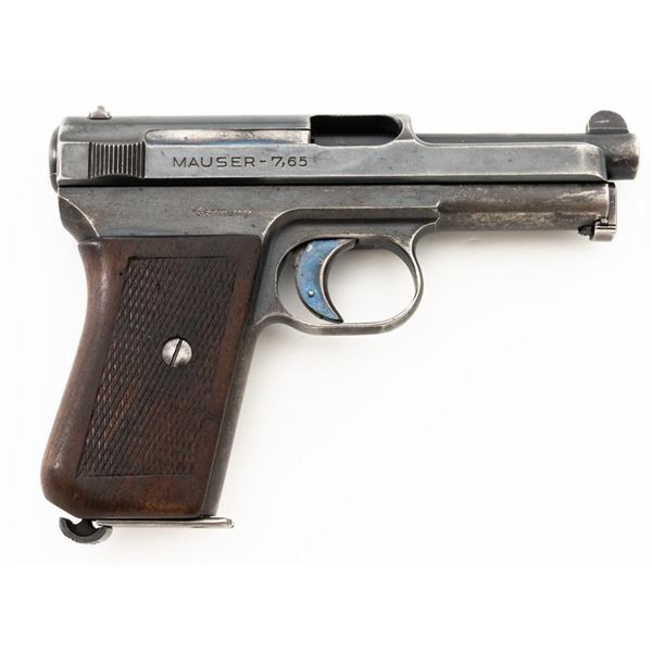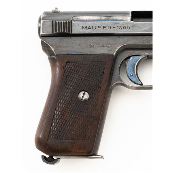 Mauser Model 1914 Semi-Automatic Pistol, #313072, .32 ACP cal., 3.5" barrel, blued finish, checkered hardwood one-piece grip, blade front sight, and fixed rear sight with "U"-notched groove. Includes one unmarked magazine. Pistol is marked "WAFFENFABRIK MAUSER A.G.OBERNDORF A.N./MAUSERSPATENT" on left side of the slide and "MAUSER-7,65" on the right side. Left side of the frame is marked with Mauser logo. Matching numbers on the frame and slide. Stamped "GERMANY" on right side of the frame. Condition overall is good, retaining approx. 50%-55% blue, showing general thinning and toning. Grip is fair with a crack and a chip missing from the left side. Action operates smoothly. Bore is fair with pitting and patina mid-barrel. Otherwise, rifling is clear. Est.: $200-$300. (C&R/PPT)