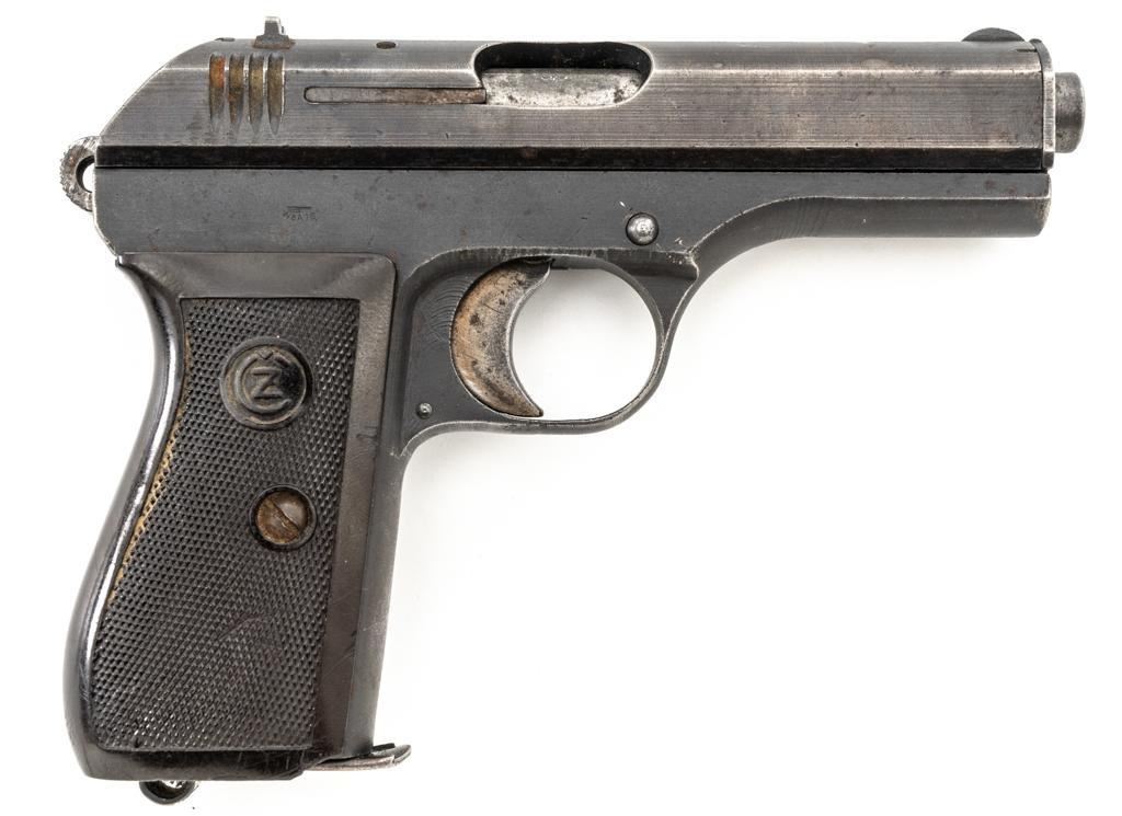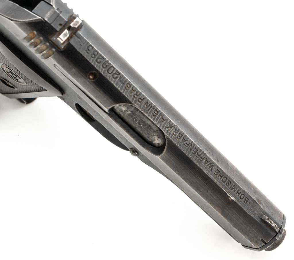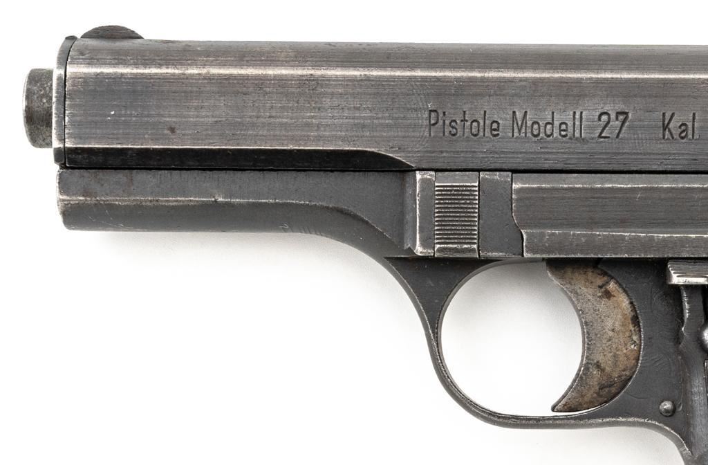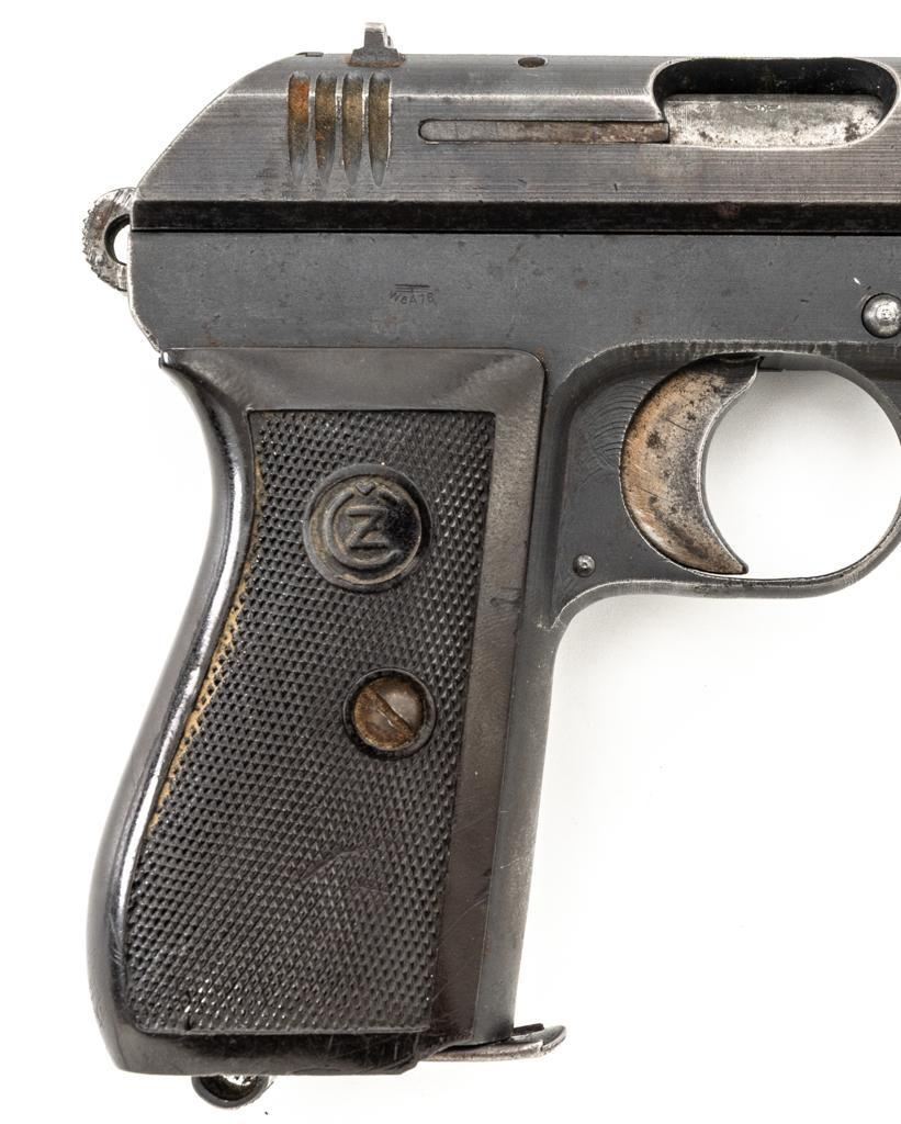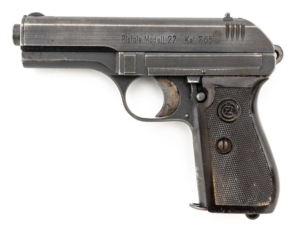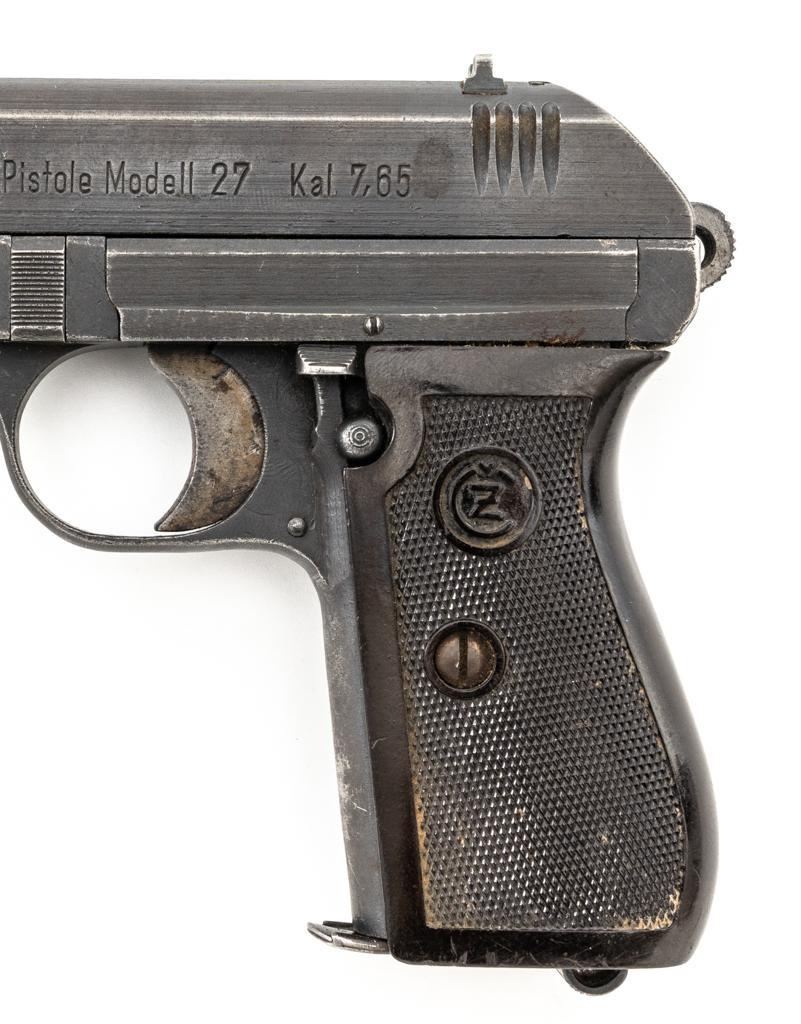 German Occupation Czech CZ 27 Semi-Automatic Pistol, #209283, .32 ACP cal., 3.9" barrel, phosphate finish with straw colored hammer and trigger, checkered dark red plastic one-piece grip embossed with "CZ" logo on both sides, blade front sight, and fixed rear sight with "V"-notched groove. Includes one phosphate finished magazine, marked "P.Mod.27" on the floorplate. Top of the slide is marked "BOHMISCHE WAFFENFABRIK A.G. IN PRAG" with a faint "(eagle/swastika)" firing proof, and "Pistole Modell 27 Kal 7,65" on the left side. Right side of the frame is stamped with German occupation "(eagle)/WaA76" Waffenamt. There is a partially visible Nazi eagle firing proof on the barrel at the ejection port. No visible import marks. Condition overall is about fine, retaining approx. 80%-85% finish, with edge wear to the slide, spots of patina to the frame and side plate, thinning and toning to the front grip strap. Grip is good with scattered handling marks and flattening to the checkering, with a chip missing from the right side. Action operates smoothly. Bore is bright with very good rifling. Magazine has a few small spots of rust patina on the floorplate. Est.: $300-$500. (C&R/PPT)