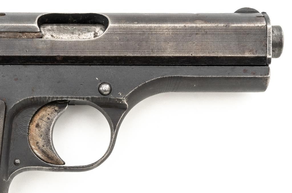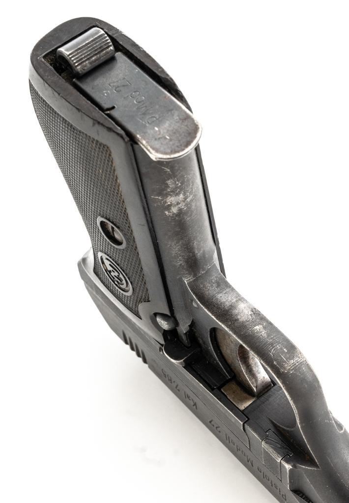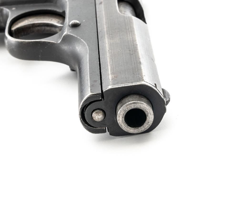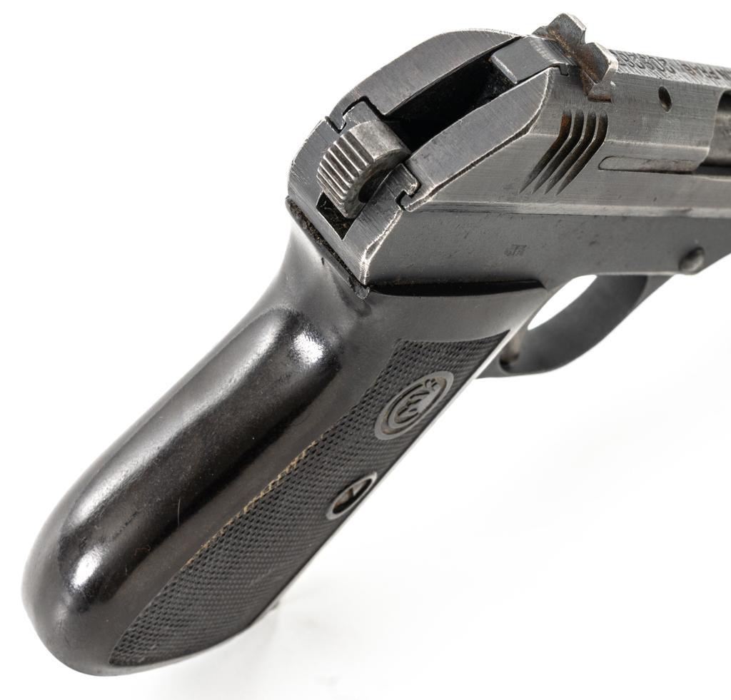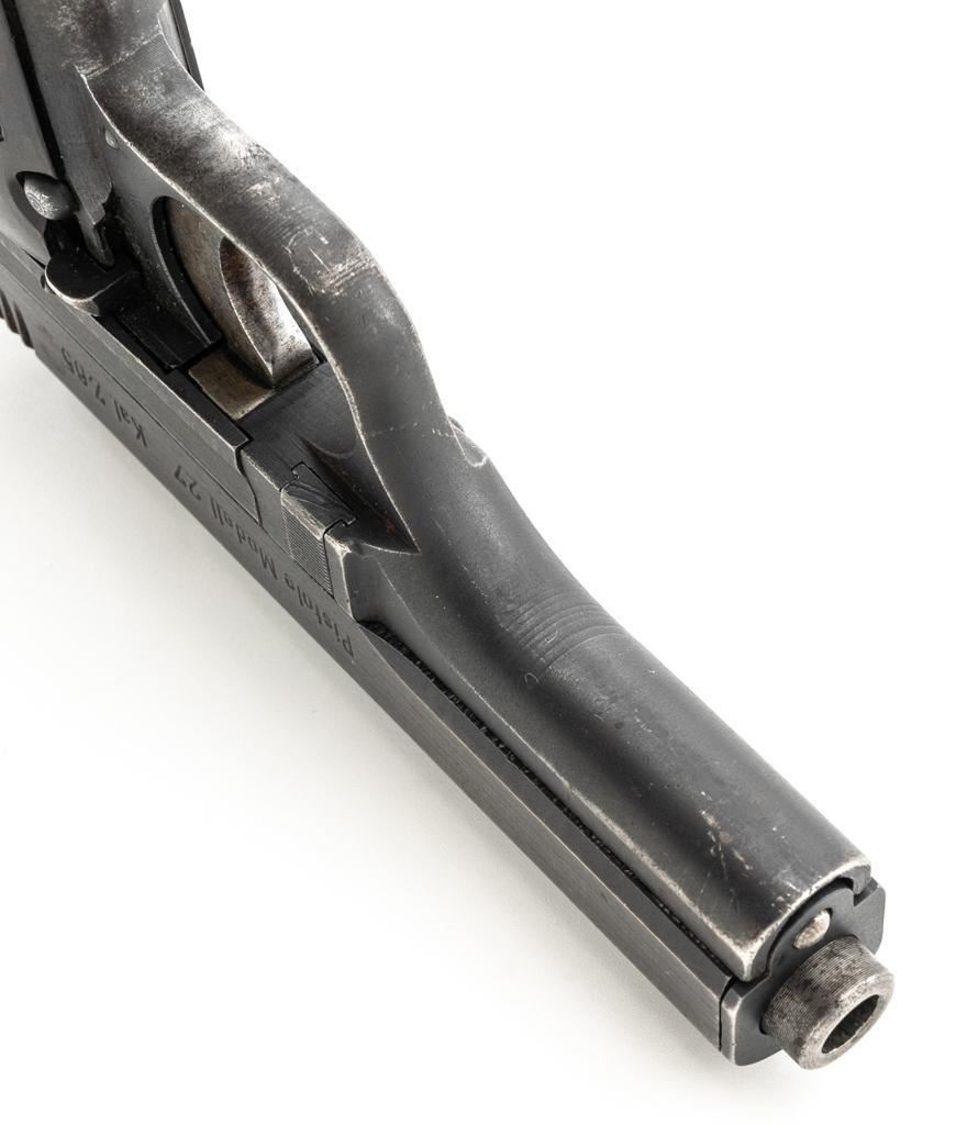 German Occupation Czech CZ 27 Semi-Automatic Pistol, #209283, .32 ACP cal., 3.9" barrel, phosphate finish with straw colored hammer and trigger, checkered dark red plastic one-piece grip embossed with "CZ" logo on both sides, blade front sight, and fixed rear sight with "V"-notched groove. Includes one phosphate finished magazine, marked "P.Mod.27" on the floorplate. Top of the slide is marked "BOHMISCHE WAFFENFABRIK A.G. IN PRAG" with a faint "(eagle/swastika)" firing proof, and "Pistole Modell 27 Kal 7,65" on the left side. Right side of the frame is stamped with German occupation "(eagle)/WaA76" Waffenamt. There is a partially visible Nazi eagle firing proof on the barrel at the ejection port. No visible import marks. Condition overall is about fine, retaining approx. 80%-85% finish, with edge wear to the slide, spots of patina to the frame and side plate, thinning and toning to the front grip strap. Grip is good with scattered handling marks and flattening to the checkering, with a chip missing from the right side. Action operates smoothly. Bore is bright with very good rifling. Magazine has a few small spots of rust patina on the floorplate. Est.: $300-$500. (C&R/PPT)