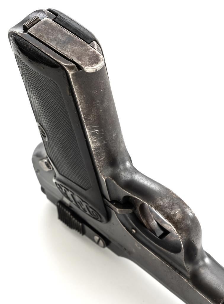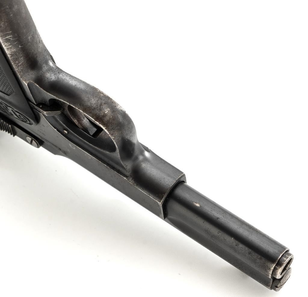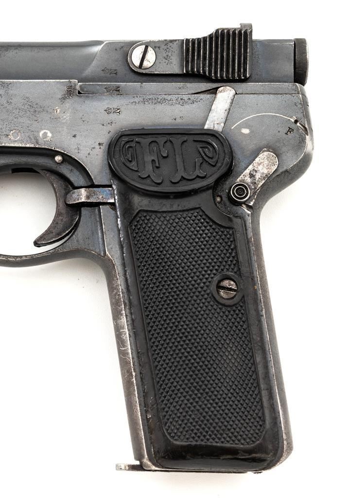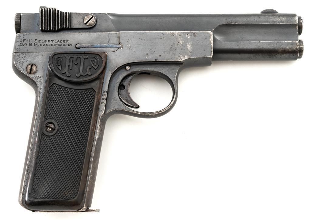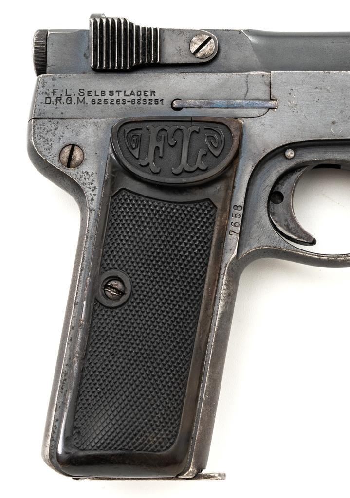 Langenhan FL Selbstlader Self-Loading Semi-Automatic Pistol, #7658, .32 ACP cal., 4" barrel, blue finish, checkered hard rubber two-piece grips with "FL" monogram, blade front and fixed "V"-notch rear sight, with one unmarked 8-round blue steel magazine. Factory markings are clear, with "(crown)/N" proofs on left side of the slide and frame, with an additional "(crown)/R" . There are no visible import marks. Mfgd circa 1914-1917. Pistol is in near fine overall condition, retaining approx. 80%-85% thinning blue finish, with holster wear at the muzzle, showing even edgewear and some areas of slight surface erosion, worse at the muzzle. Grips are very good with smoothing of the checkering and a couple minor indentations. Action functions well and locks up securely. Bore is very good, with scattered light frosting, and well-defined rifling. The Langenhan was a simple blowback pistol modeled after the FN 1900, produced for only three years, with approx 55,000 pistols produced for use by the German military and police during WWI. Est.: $700-$900. (C&R/PPT)