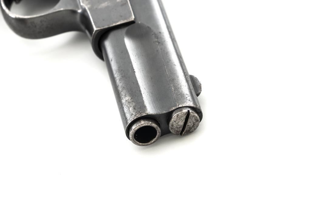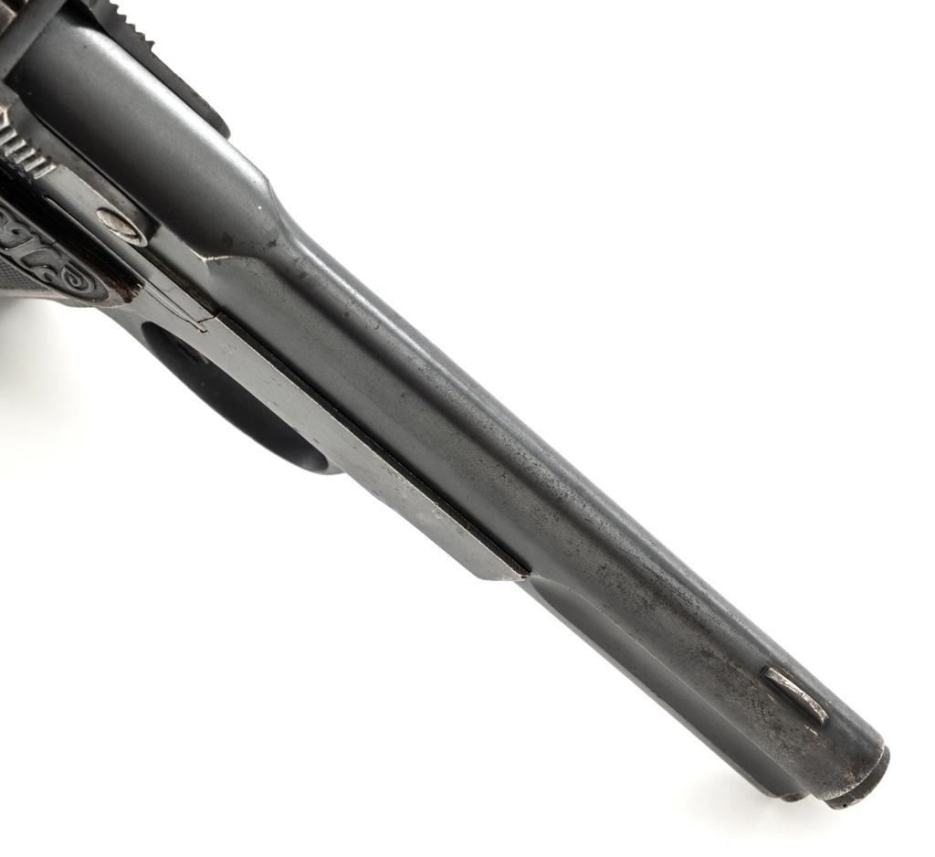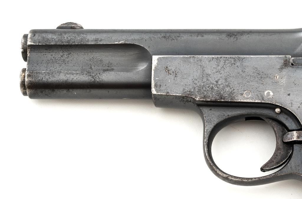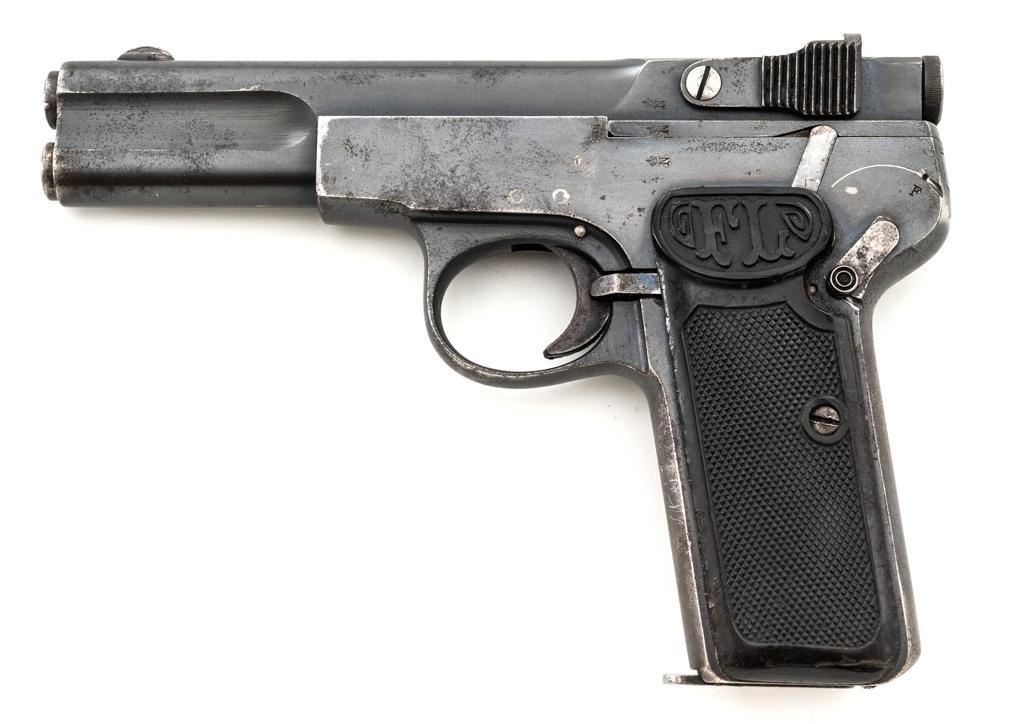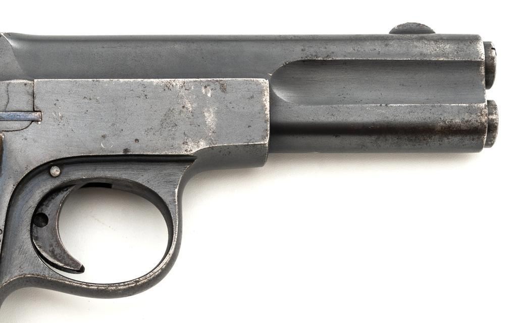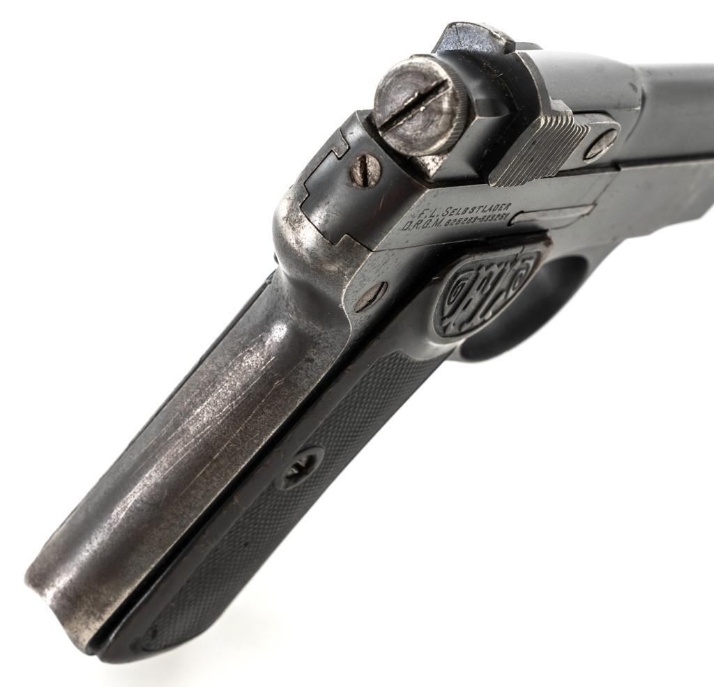 Langenhan FL Selbstlader Self-Loading Semi-Automatic Pistol, #7658, .32 ACP cal., 4" barrel, blue finish, checkered hard rubber two-piece grips with "FL" monogram, blade front and fixed "V"-notch rear sight, with one unmarked 8-round blue steel magazine. Factory markings are clear, with "(crown)/N" proofs on left side of the slide and frame, with an additional "(crown)/R" . There are no visible import marks. Mfgd circa 1914-1917. Pistol is in near fine overall condition, retaining approx. 80%-85% thinning blue finish, with holster wear at the muzzle, showing even edgewear and some areas of slight surface erosion, worse at the muzzle. Grips are very good with smoothing of the checkering and a couple minor indentations. Action functions well and locks up securely. Bore is very good, with scattered light frosting, and well-defined rifling. The Langenhan was a simple blowback pistol modeled after the FN 1900, produced for only three years, with approx 55,000 pistols produced for use by the German military and police during WWI. Est.: $700-$900. (C&R/PPT)