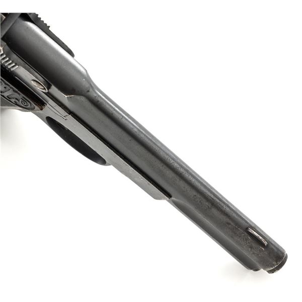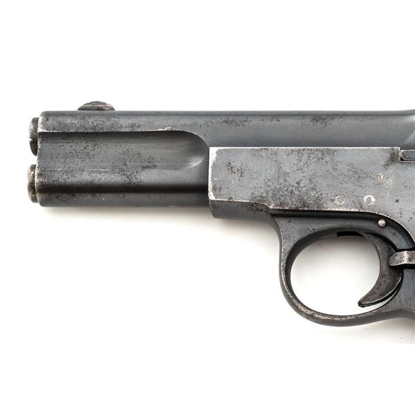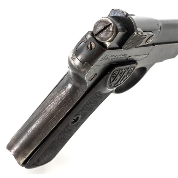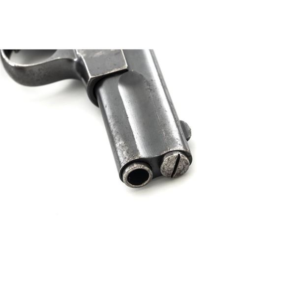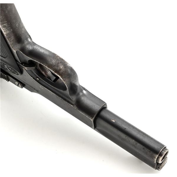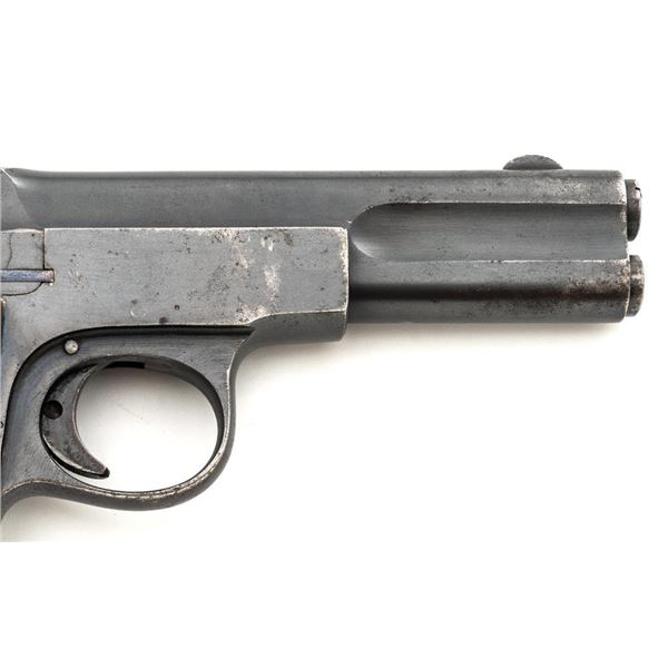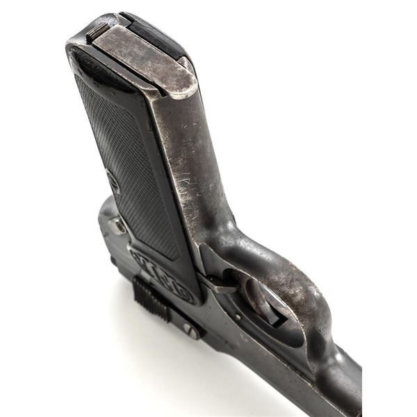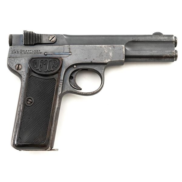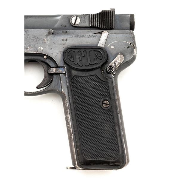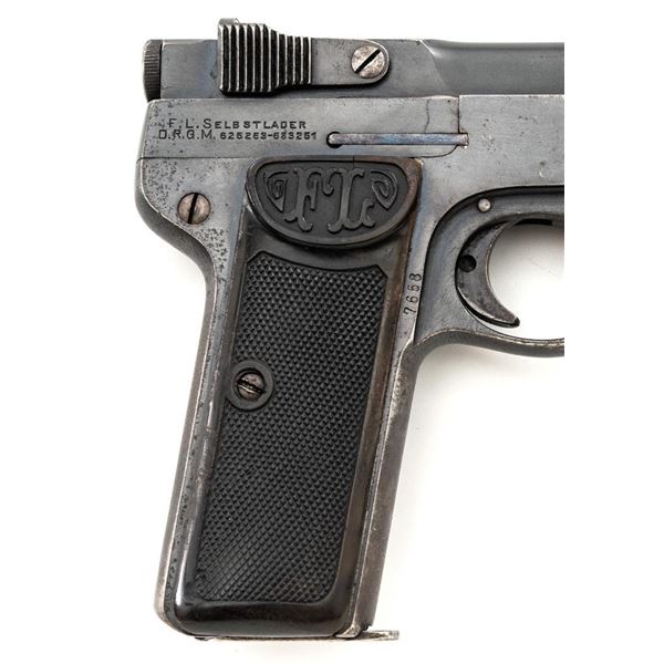 Langenhan FL Selbstlader Self-Loading Semi-Automatic Pistol, #7658, .32 ACP cal., 4" barrel, blue finish, checkered hard rubber two-piece grips with "FL" monogram, blade front and fixed "V"-notch rear sight, with one unmarked 8-round blue steel magazine. Factory markings are clear, with "(crown)/N" proofs on left side of the slide and frame, with an additional "(crown)/R" . There are no visible import marks. Mfgd circa 1914-1917. Pistol is in near fine overall condition, retaining approx. 80%-85% thinning blue finish, with holster wear at the muzzle, showing even edgewear and some areas of slight surface erosion, worse at the muzzle. Grips are very good with smoothing of the checkering and a couple minor indentations. Action functions well and locks up securely. Bore is very good, with scattered light frosting, and well-defined rifling. The Langenhan was a simple blowback pistol modeled after the FN 1900, produced for only three years, with approx 55,000 pistols produced for use by the German military and police during WWI. Est.: $700-$900. (C&R/PPT)