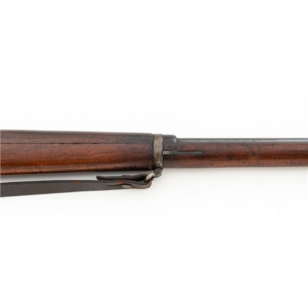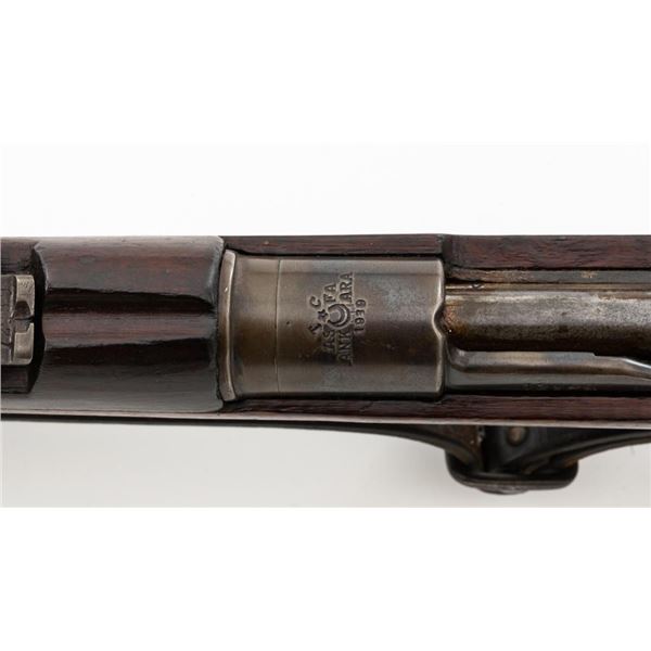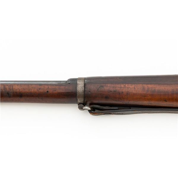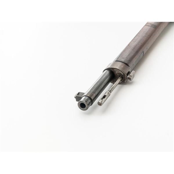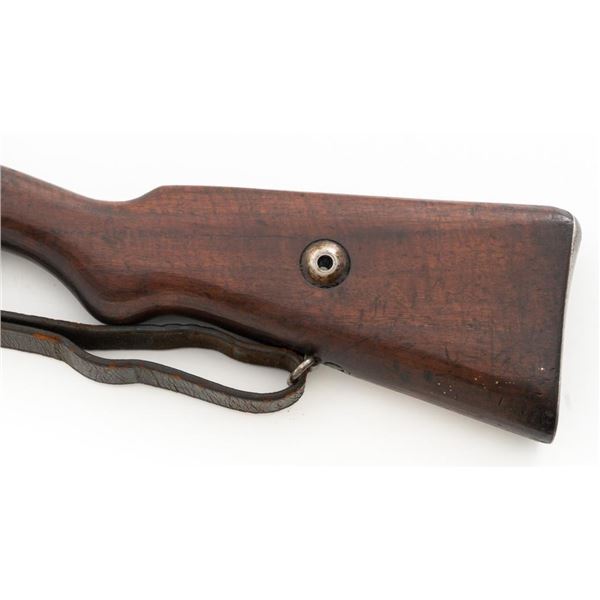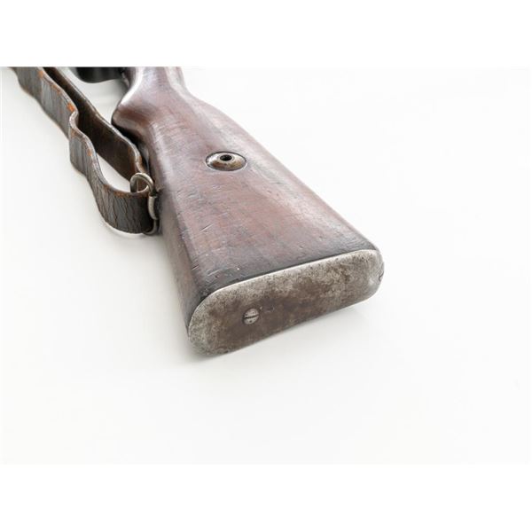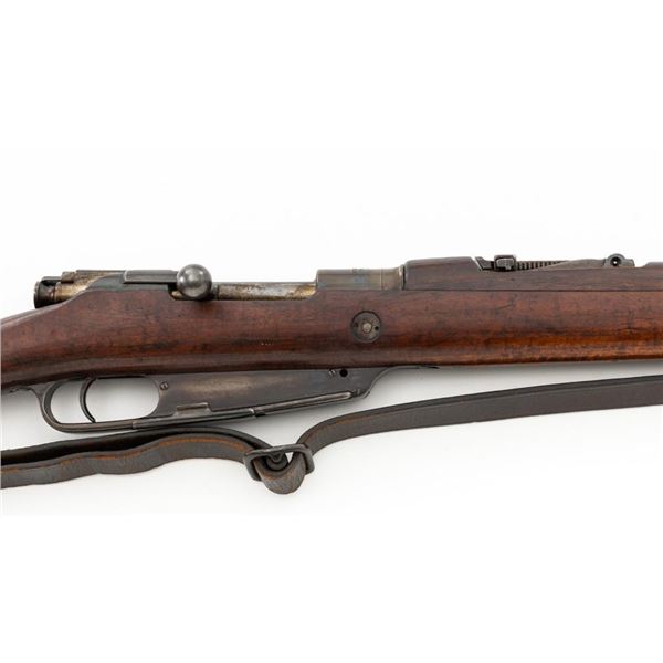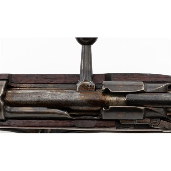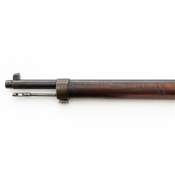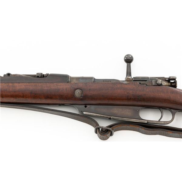 Turkish Modified Model 1888 Bolt Action Rifle, #12989, 8x57mm cal., 29.5" barrel, blued finish, hardwood stock, inverted-"V" front sight, and adjustable tangent rear sight. Includes a steel cleaning rod. Marked on top of the receiver ring "TC/ASFA(Turkish crest)ANKARA/1938". Bolt is numbered but does not match. No visible import marks. Rifle was modified in Turkish service by replacing the barrel and stock and modifying the magazine for Mauser type stripper clips. Condition overall is very good, retaining approx. 60%-70% blue, showing general thinning and toning, browning across the receiver ring. Wood with scattered moderate dents and scratches, with an even colored finish. Action functions well. Bright bore rates good, with defined rifling. Est.: $200-$400. (C&R)