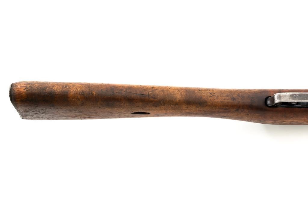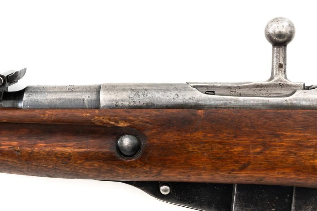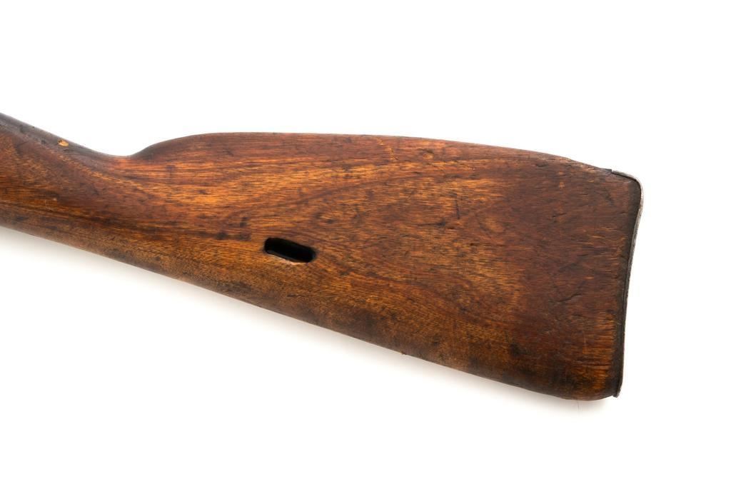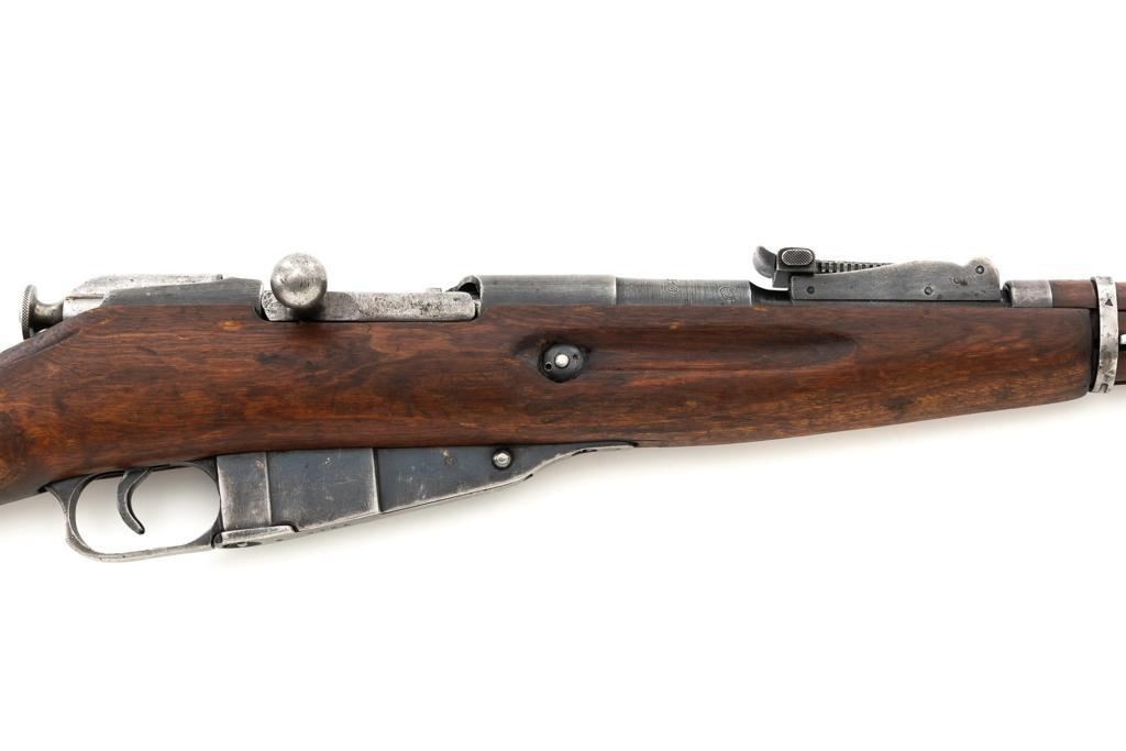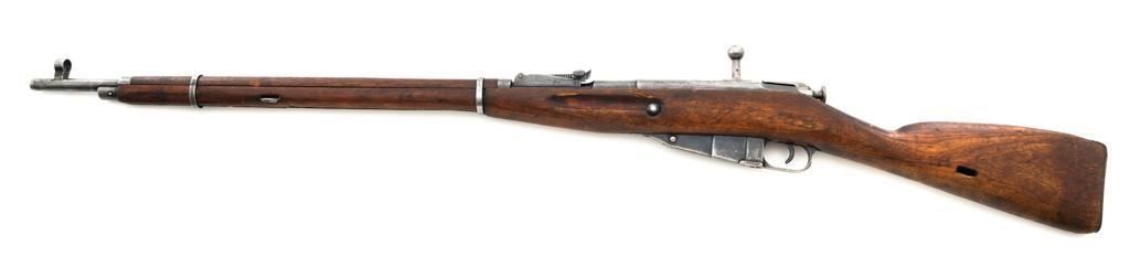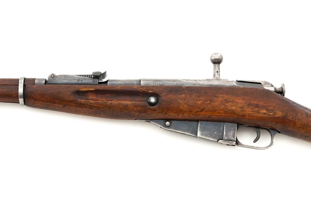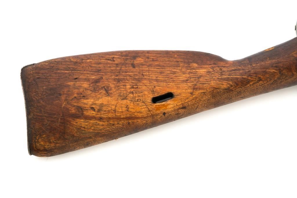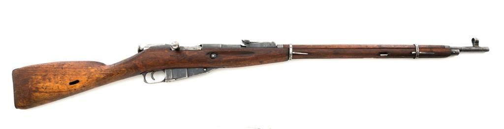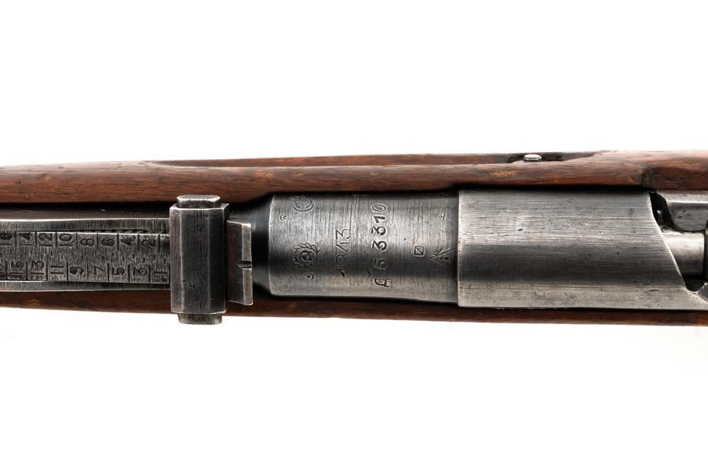 Soviet M1891/30 Mosin Nagant Bolt Action Rifle, #DB3310, 7.62x54Rmm cal., 29" barrel, blued finish with bright bolt assembly, hardwood stock and handguard, hooded post front sight, and adjustable tangent rear sight with "U"-notched groove, graduated to 2000 meters. No cleaning rod. Marked with "(Soviet crest)/1943/(DB)3310/(refurbishment stamp)/(Ishevsk Arsenal symbol)" on top of the receiver ring; "DB3310" on left side of the receiver. Matching numbers on floorplate and buttplate, bolt does not match. Import stamped on right side barrel. Condition overall is good, retaining approx. 50%-55% blue, showing general toning and wear; spots of patina on the bolt. Wood is good, with bruises and handling marks throughout. Action functions well. bore rates good, with defined rifling. Est.: $250-$350. (C&R)