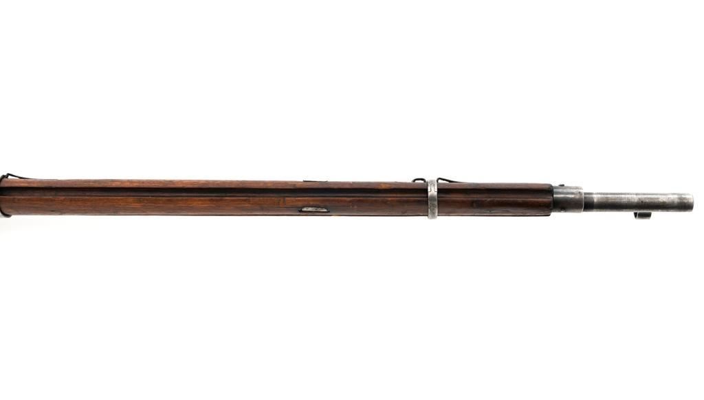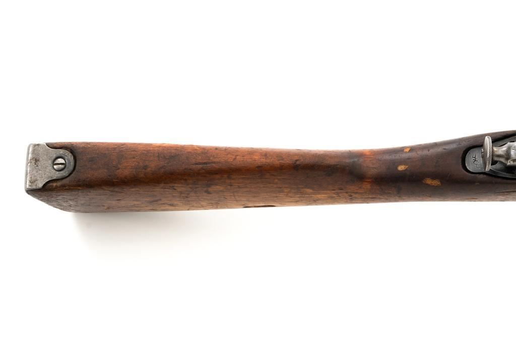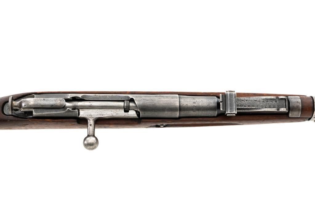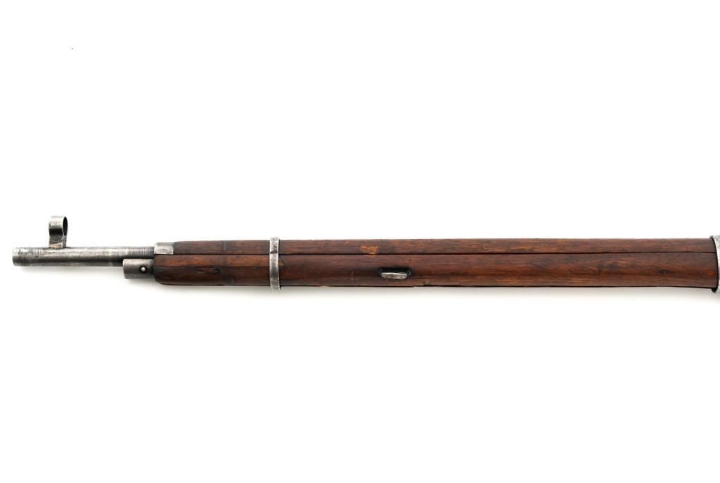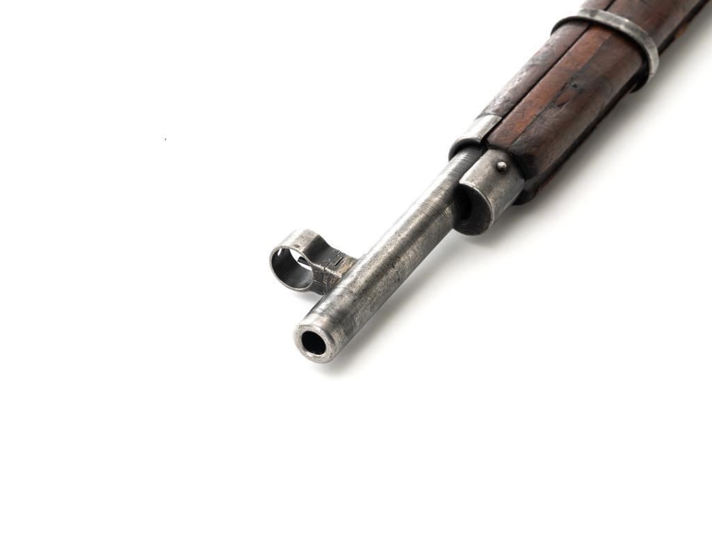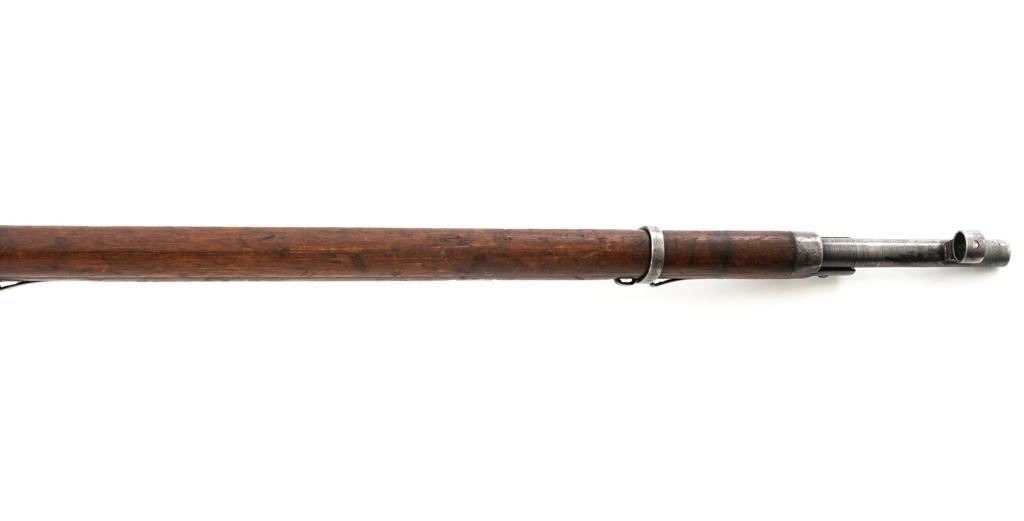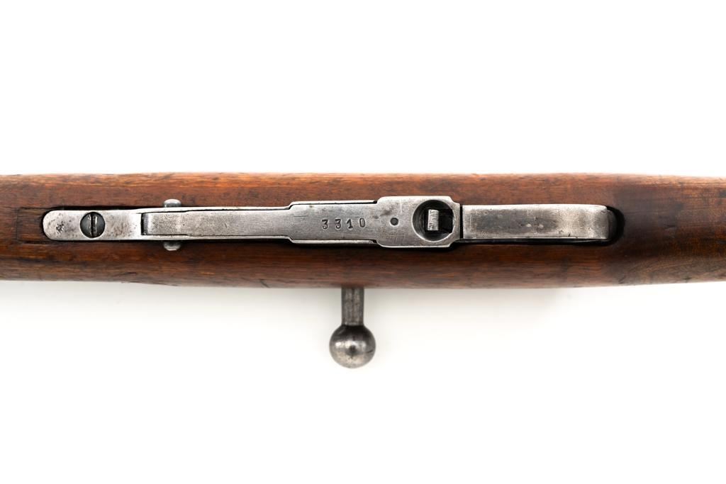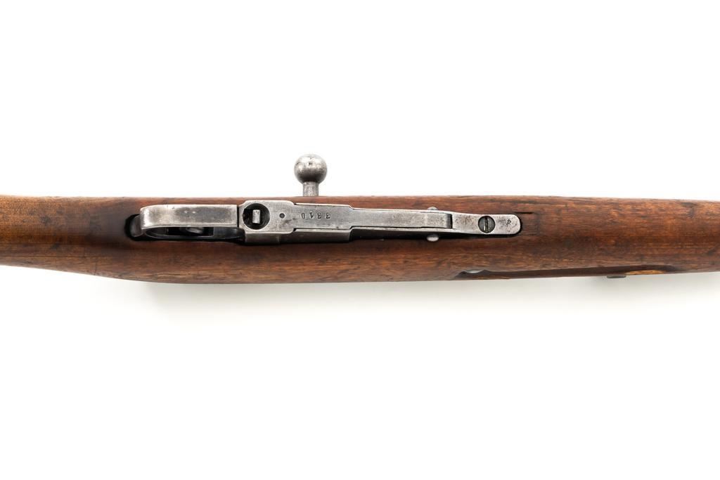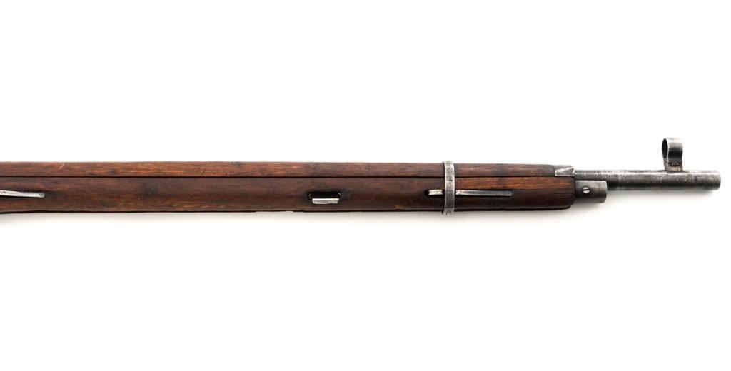 Soviet M1891/30 Mosin Nagant Bolt Action Rifle, #DB3310, 7.62x54Rmm cal., 29" barrel, blued finish with bright bolt assembly, hardwood stock and handguard, hooded post front sight, and adjustable tangent rear sight with "U"-notched groove, graduated to 2000 meters. No cleaning rod. Marked with "(Soviet crest)/1943/(DB)3310/(refurbishment stamp)/(Ishevsk Arsenal symbol)" on top of the receiver ring; "DB3310" on left side of the receiver. Matching numbers on floorplate and buttplate, bolt does not match. Import stamped on right side barrel. Condition overall is good, retaining approx. 50%-55% blue, showing general toning and wear; spots of patina on the bolt. Wood is good, with bruises and handling marks throughout. Action functions well. bore rates good, with defined rifling. Est.: $250-$350. (C&R)