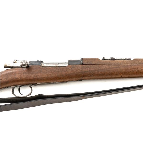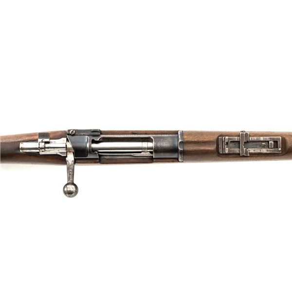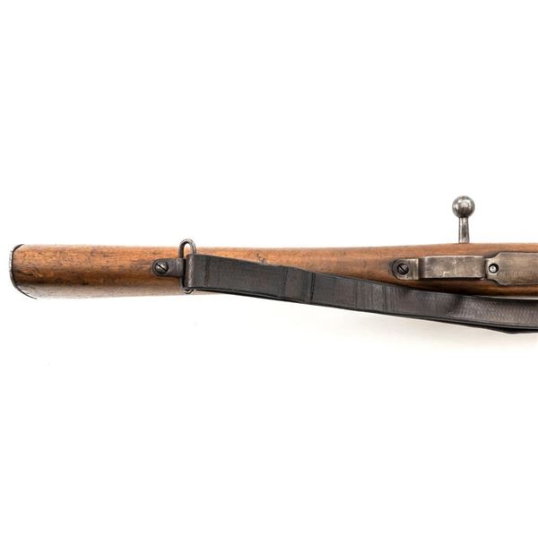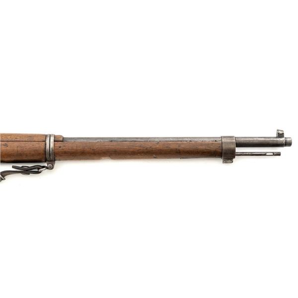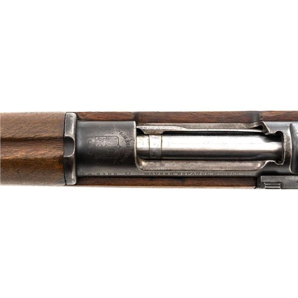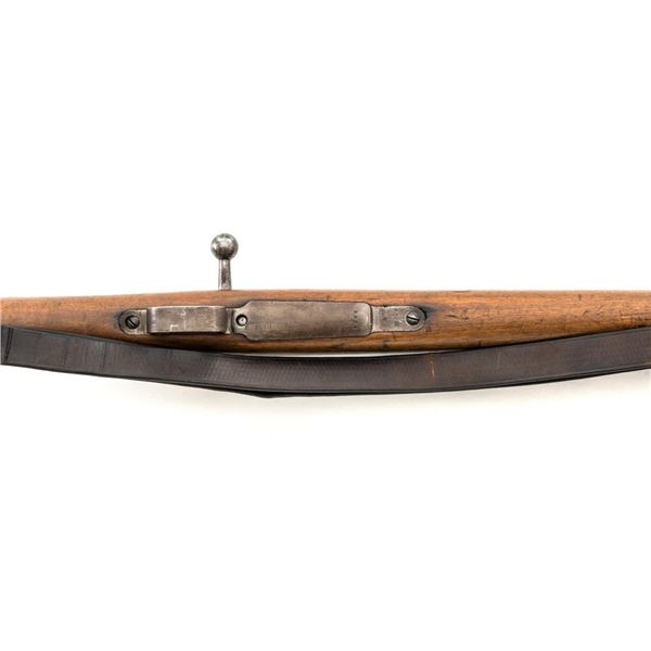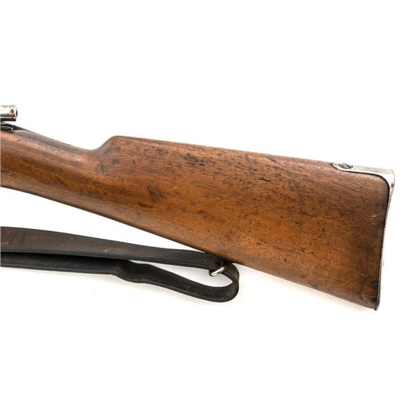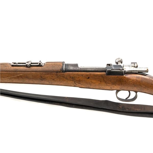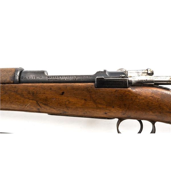 Antique Spanish Model 1893 Mauser Bolt Action Rifle, #A6196, 7x57mm cal., 29"barrel, blued finish with bright bolt assembly, hardwood stock and handguard, dovetailed inverted-"V" front sight, and adjustable folding leaf rear sight with "V"-notched groove, graduated to 1900 yards. Includes cleaning rod and brown leather sling. Sling is in good used condition. Top of the receiver ring is marked with a faint Spanish crest over "OBERNDORF 1896." and the left side receiver rail with "MAUSER ESPANOL MODELO 1893./MANUFACTURA MAUSER OBERNDORF A/N". Matching numbers on the trigger guard and rear sight. Other numbered parts do not match. Condition overall is good, retaining approx. 40%-45% thinning and toning blue. Bolt assembly has toned darker. Wood is good general dents and scratches, with a notch carved into the underside of the forend, between the bayonet lug and barrel band. A faint "R" is stamped into the left side of the buttstock. Action operates smoothly. Bore is dark with fair, visible rifling. Est.: $400-$600. (Antique)