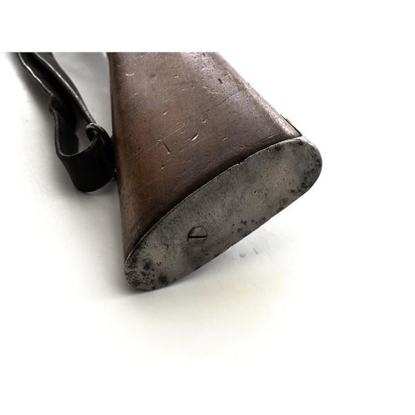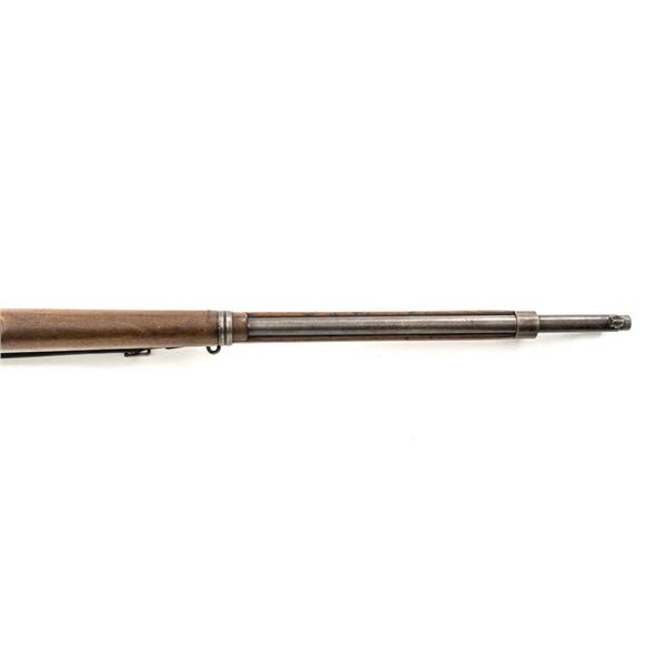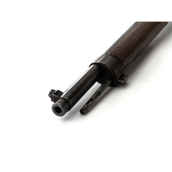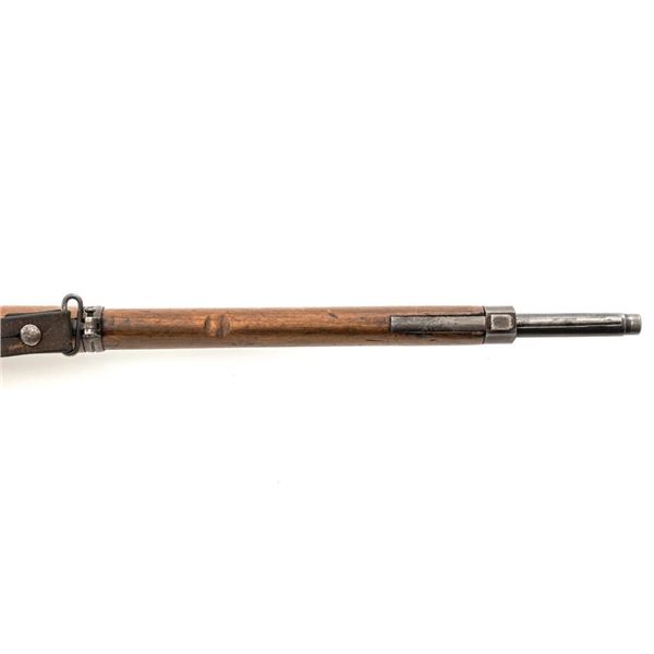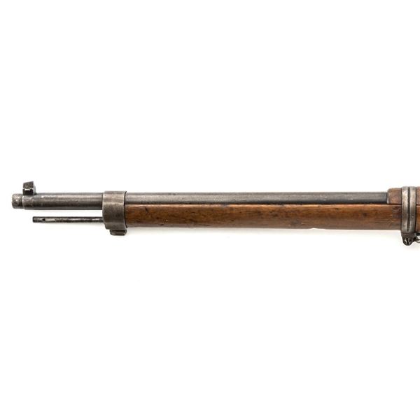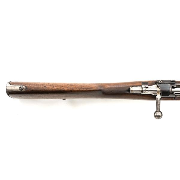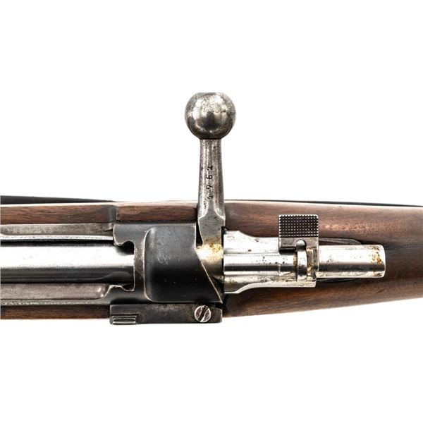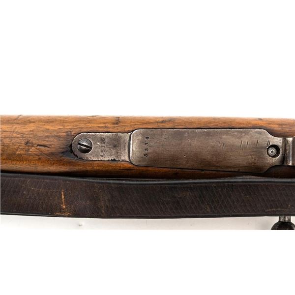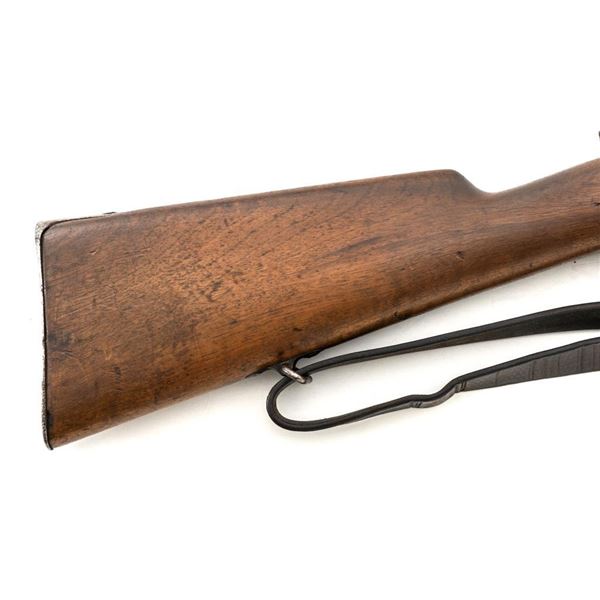 Antique Spanish Model 1893 Mauser Bolt Action Rifle, #A6196, 7x57mm cal., 29"barrel, blued finish with bright bolt assembly, hardwood stock and handguard, dovetailed inverted-"V" front sight, and adjustable folding leaf rear sight with "V"-notched groove, graduated to 1900 yards. Includes cleaning rod and brown leather sling. Sling is in good used condition. Top of the receiver ring is marked with a faint Spanish crest over "OBERNDORF 1896." and the left side receiver rail with "MAUSER ESPANOL MODELO 1893./MANUFACTURA MAUSER OBERNDORF A/N". Matching numbers on the trigger guard and rear sight. Other numbered parts do not match. Condition overall is good, retaining approx. 40%-45% thinning and toning blue. Bolt assembly has toned darker. Wood is good general dents and scratches, with a notch carved into the underside of the forend, between the bayonet lug and barrel band. A faint "R" is stamped into the left side of the buttstock. Action operates smoothly. Bore is dark with fair, visible rifling. Est.: $400-$600. (Antique)