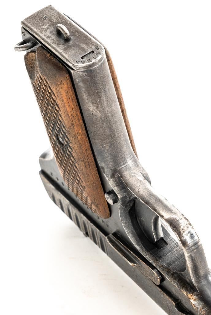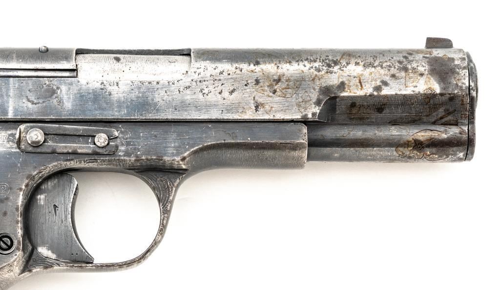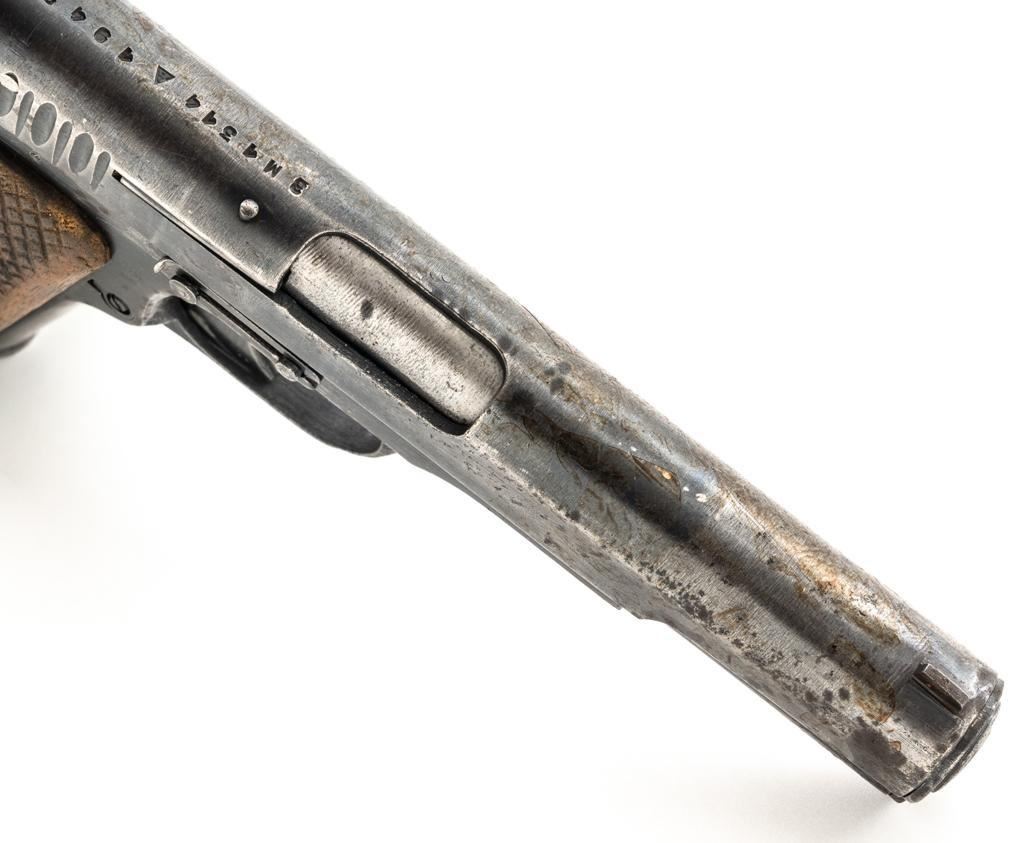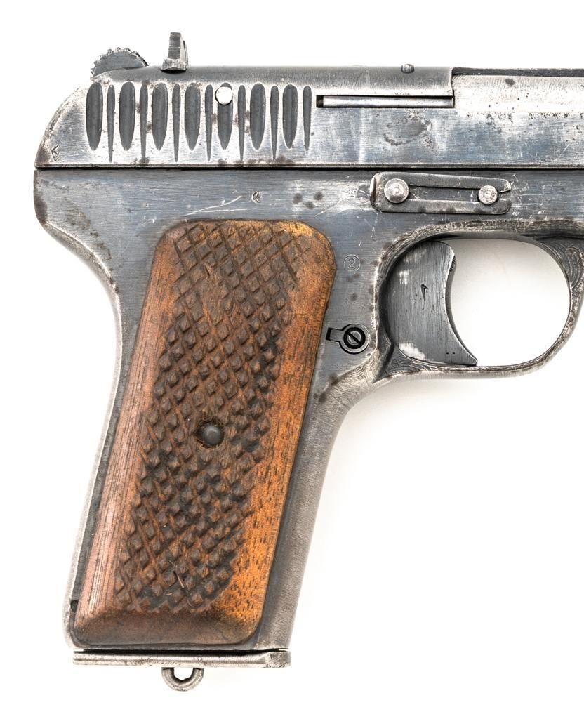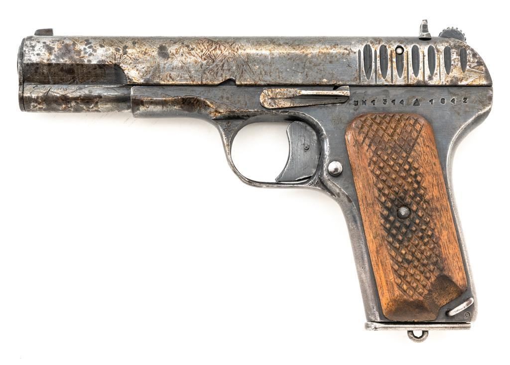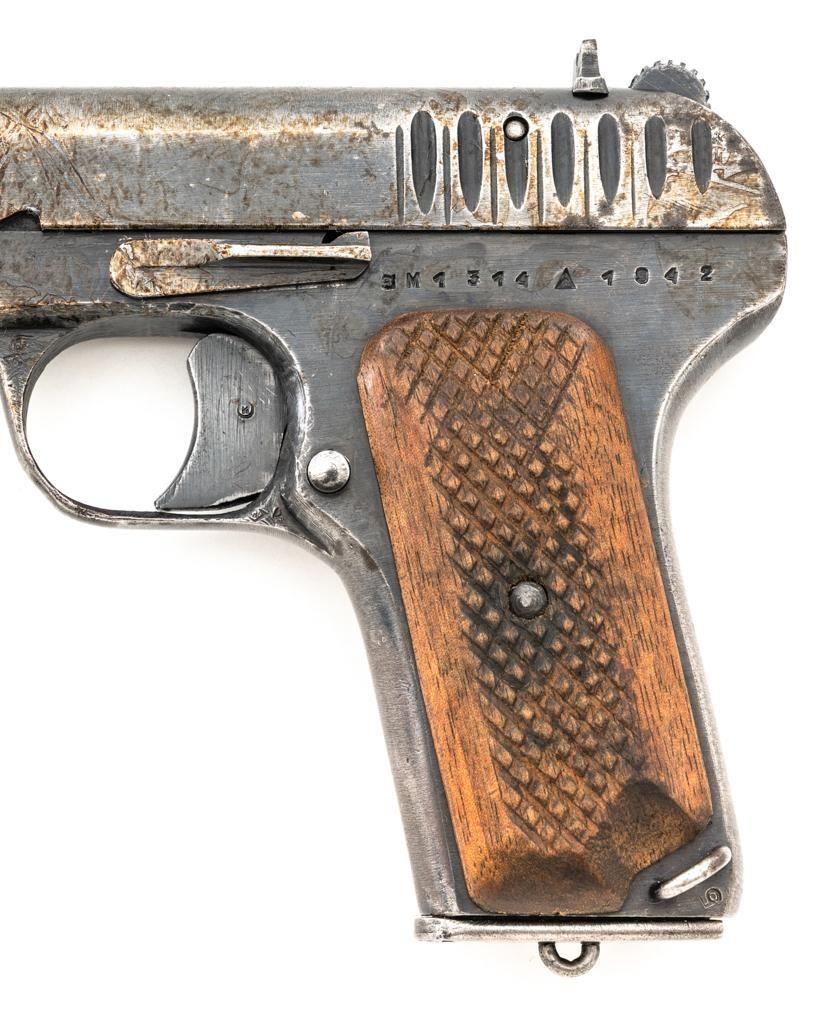 Soviet TT-33 Tokarev Semi-Automatic Pistol, #3M1314, 7.62x25mm cal, 4.6" barrel, blued finish, checkered hardwood grips, blade front sight, fixed rear sight with "U"-notched groove, and lanyard loop on left side of the frame. Includes one matching numbered blue steel magazine with lanyard ring on the base. Pistol is marked "3M1314/(Izhevsk Arsenal symbol)/1942" on left side of the frame and on top of the slide. Matching numbers. No visible import marks. Condition overall is fair, retaining approx. 40% blue, showing general wear and patina, with areas of light pitting to both sides of the frame and slide. Grips are good, showing age and wear from service use. Action operates smoothly but the slide will not lock to the rear with the magazine in place. Bore with darkening in the grooves, rifling is fair to good. Est.: $300-$500. (C&R/PPT)