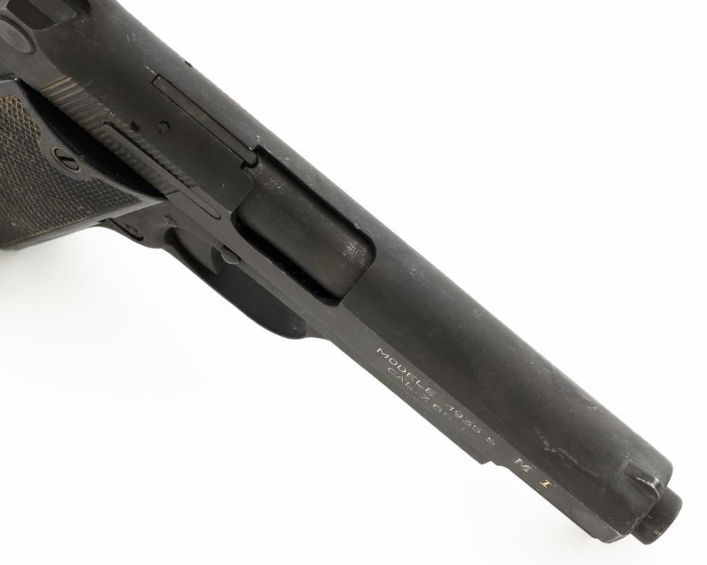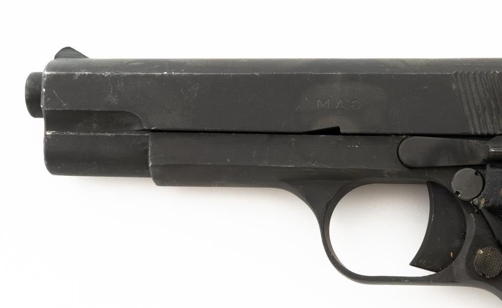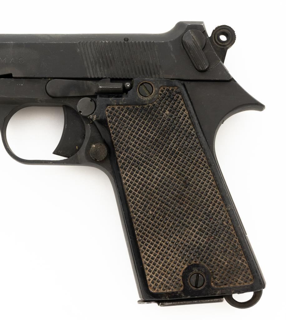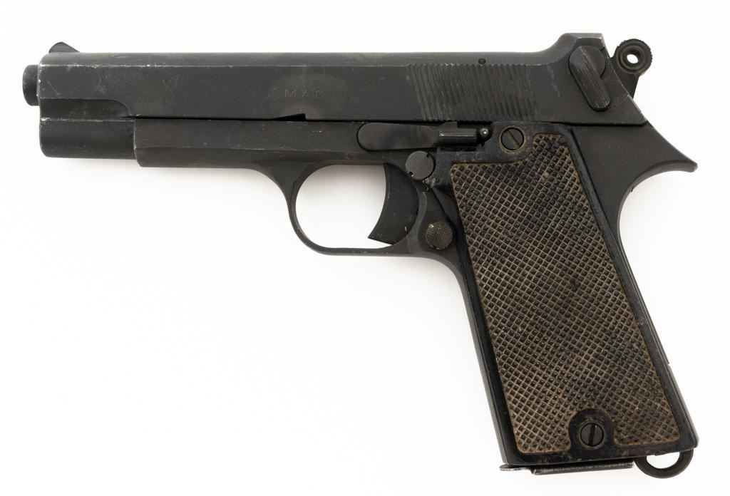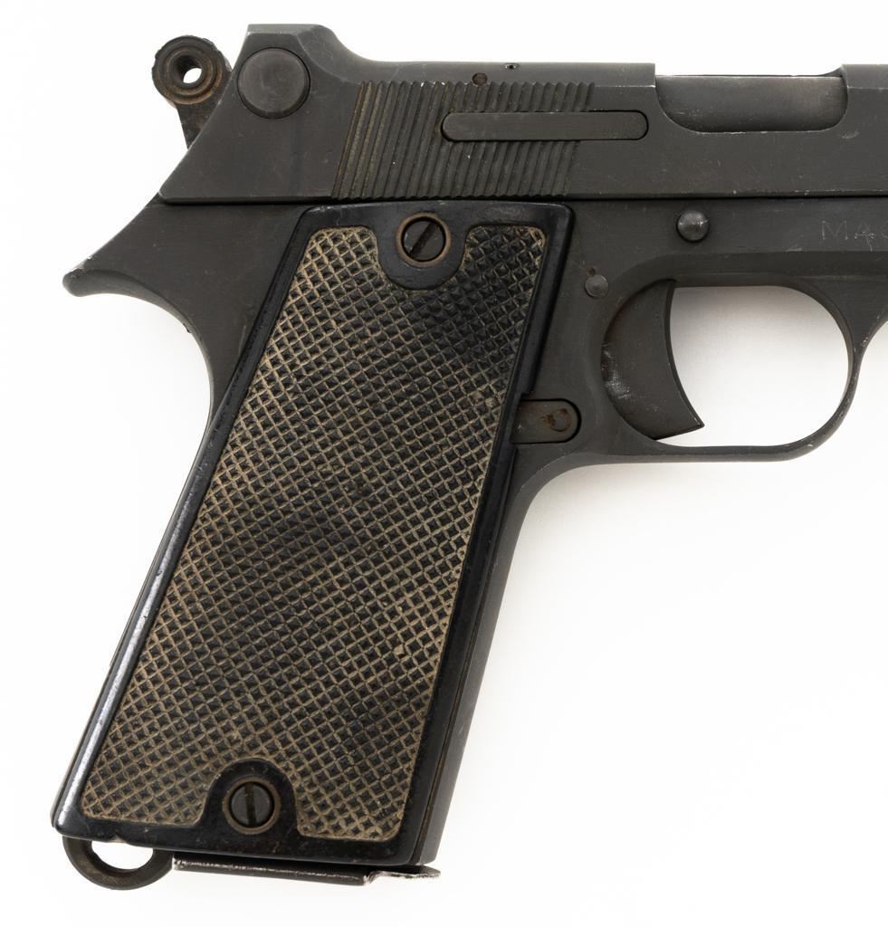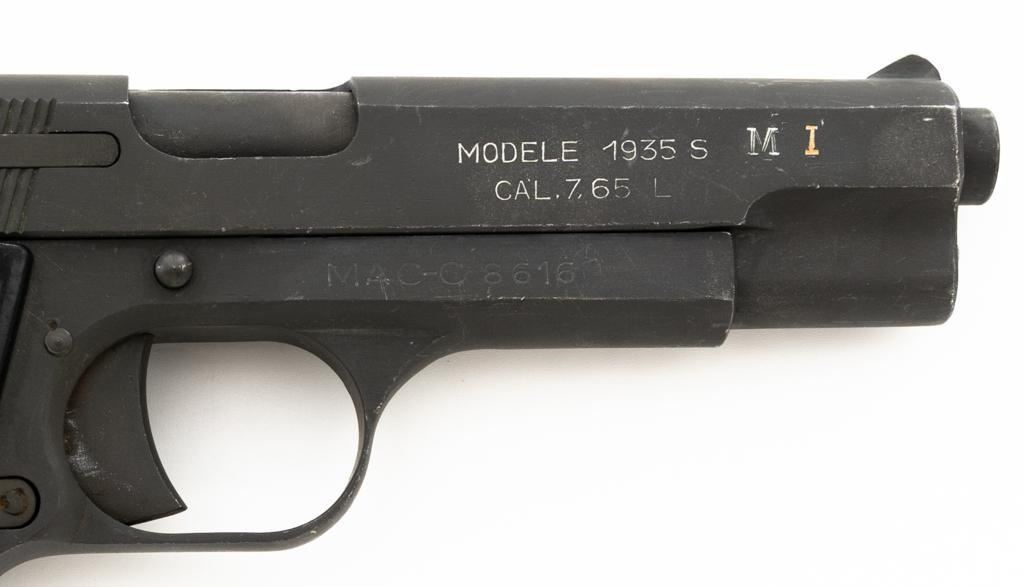 French Model 1935S Semi-Automatic Pistol, #8616, 7.65x20mm Longue cal., 4.29" barrel, parkerized finish, checkered black plastic grips, blade front sight, and fixed rear sight with "U"-notched groove. Includes one parkerized magazine, marked "1935-S" on the floorplate. Right side of the slide is marked "MODELE 1935S/CAL.7.65 L/MI". Left side is marked "M.A.C". Right side of the frame is marked "MAC-C 8616". No visible import marks. Condition overall is very good, retaining approx. 93%-95% blue, showing light edge wear and handling marks. Grips with scuffs, handling marks, and a few small chips to the bottom on both sides. Action operates smoothly, Bore is good, rifling shows wear but is still clearly visible. The bore rates good with about good rifling. Est:$300-$400. (C&R/PPT)