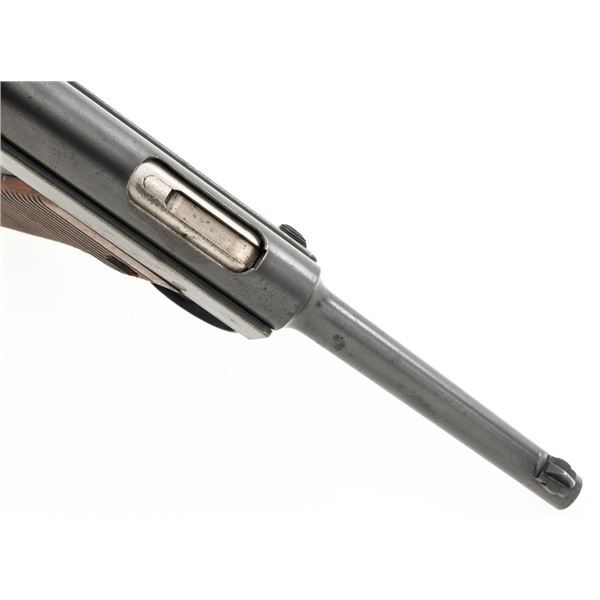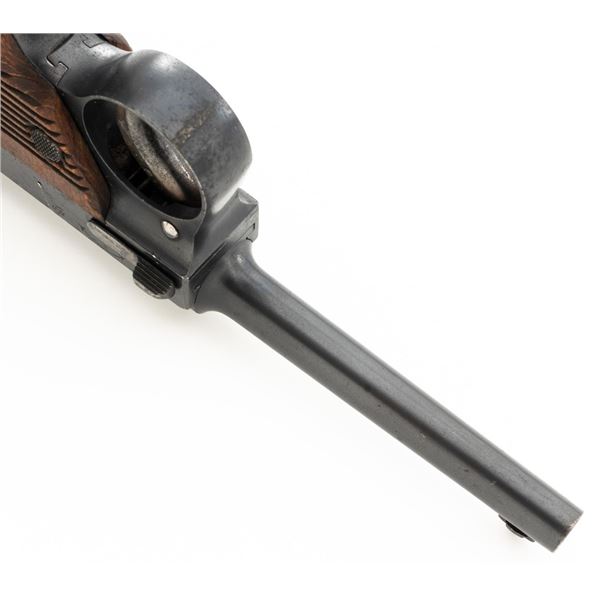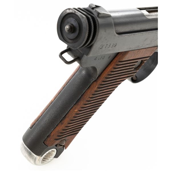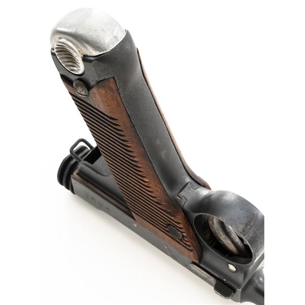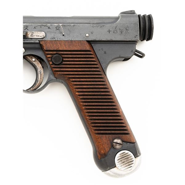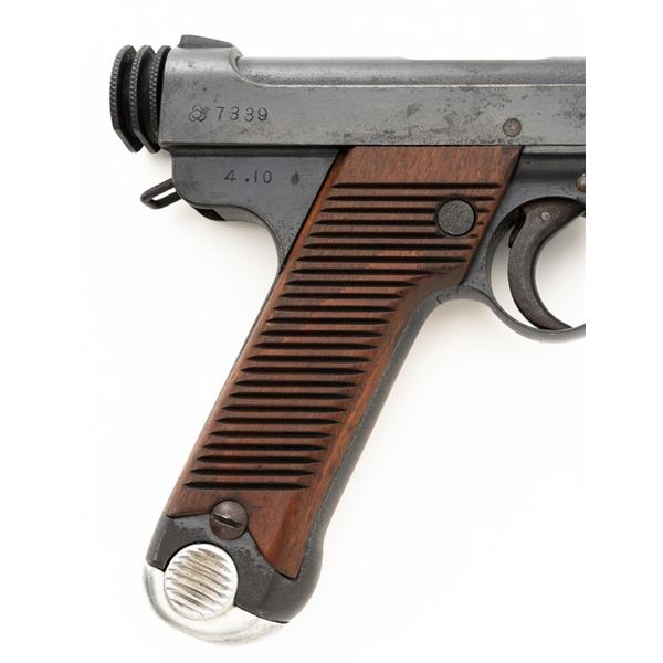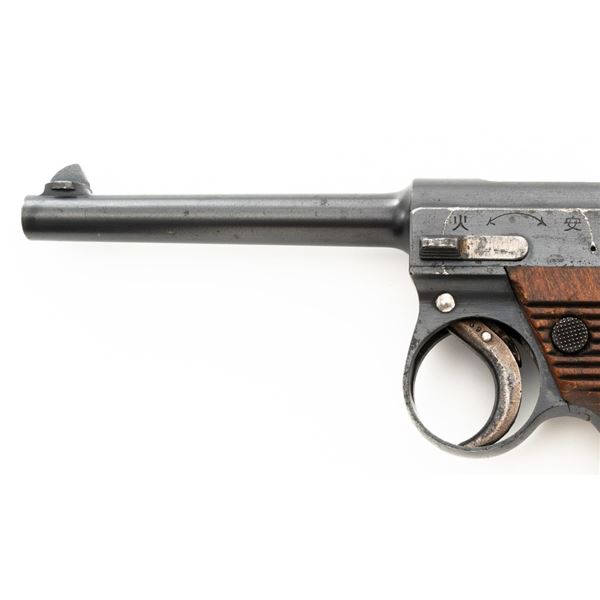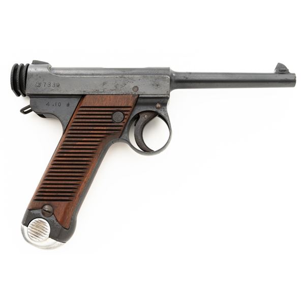 Japanese Type 14 Nambu Semi-Automatic Pistol, #7339, 8x22mm Nambu cal., 4.6" barrel, blued finish, grooved hardwood grips, dovetailed inverted-"V" front sight, and fixed rear sight with trapezoid-shaped notch. Includes one nickel-plated magazine, early type with no cut out for the magazine retention spring. It is stamped "532" on the spine. Pistol is marked on left side of the frame with four Japanese characters for "Type 14"; right side Tokyo Arsenal makers mark and "7339/4.10"/(inspection mark) for manufacture in October 1929. Visible matching numbers. No import marks. Condition overall is good, retaining approx. 60% blue, with brown toning and patina across the surfaces. Grips are very good, with a few impressions and handling marks to the dark even colored finish. Action operates smoothly. Bore is fair, with general frosting, and visible rifling. Est.: $600-$800. (C&R/PPT)