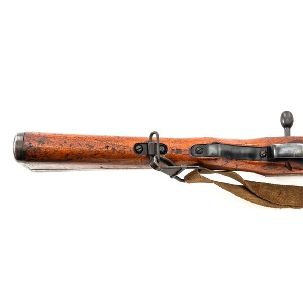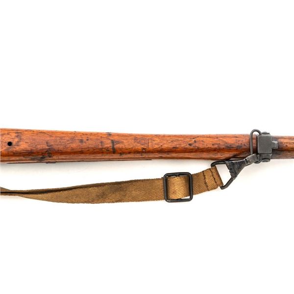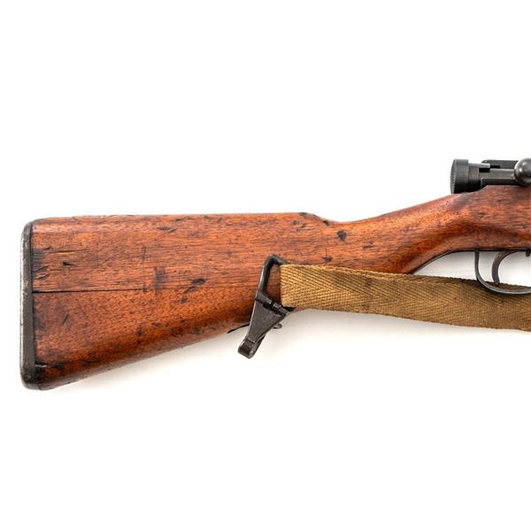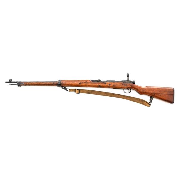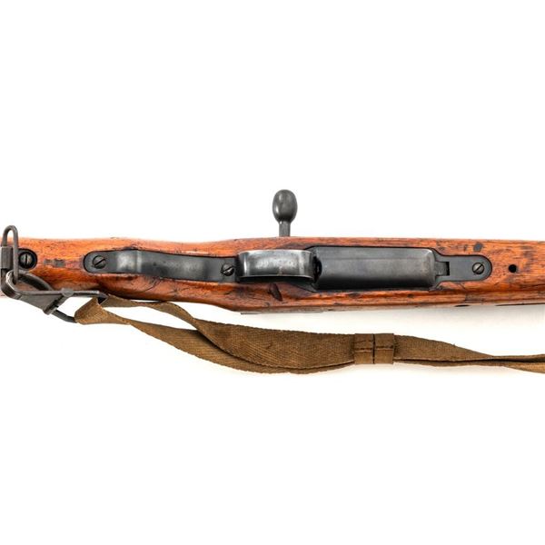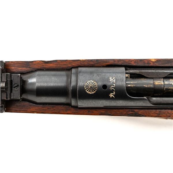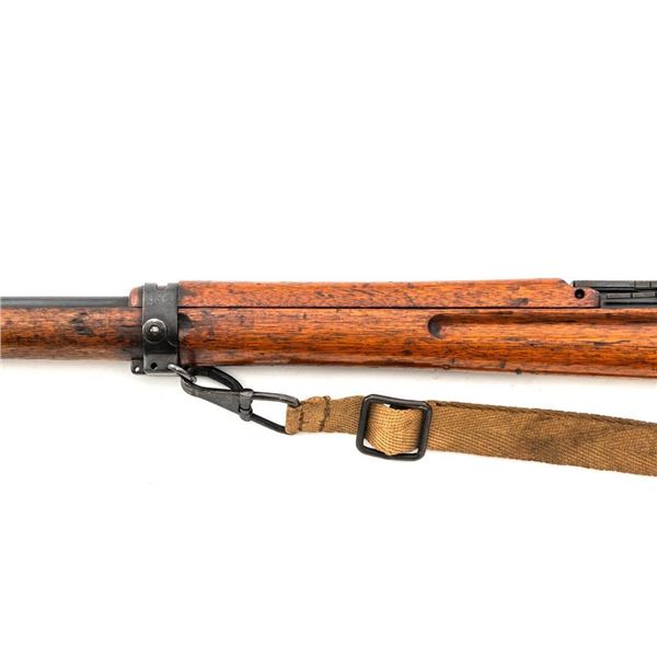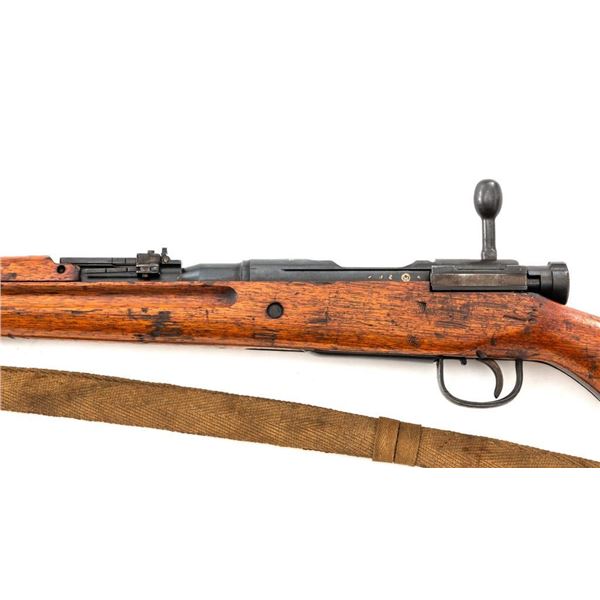 Rare Long Japanese Type 99 Arisaka Bolt Action Rifle, #292, 7.7x58mm cal., 31" barrel, blued finish, hardwood stock and handguard with two-piece buttstock, inverted-"V" front sight, and adjustable folding leaf rear sight with aperture and anti-aircraft wings, graduated to 1500 meters. Includes a steel cleaning rod and tan cotton sling, that may be from a Japanese machine gun. Sling has two sewn cotton keepers and two spring loaded steel clips, in good used condition, showing areas of staining and soiling. Top of the receiver ring is marked with intact Mum over Japanese characters for "99 Type". Left side receiver rail is marked with the symbol for the Nagoya Arsenal. Matching number on the bayonet lug. Bolt is numbered "929". No visible import marks. Condition overall is very good, retaining approx. 90% toning blue, with scratches to the trigger guard, and patina to the buttplate. Wood is good, showing general bruises, scratches, and darkening to the finish. Action operates smoothly. Bore is bright with very good rifling. Est:$700-$900. (C&R)