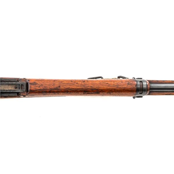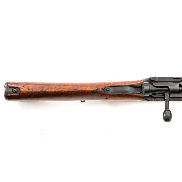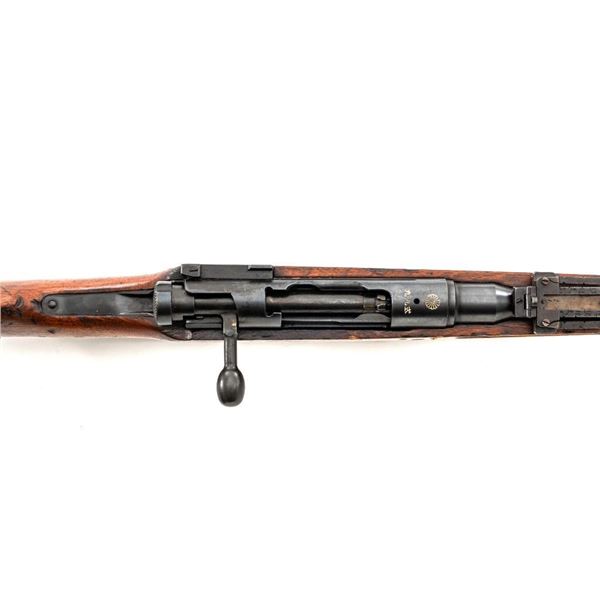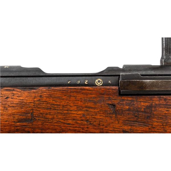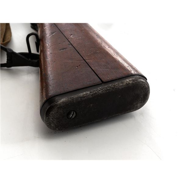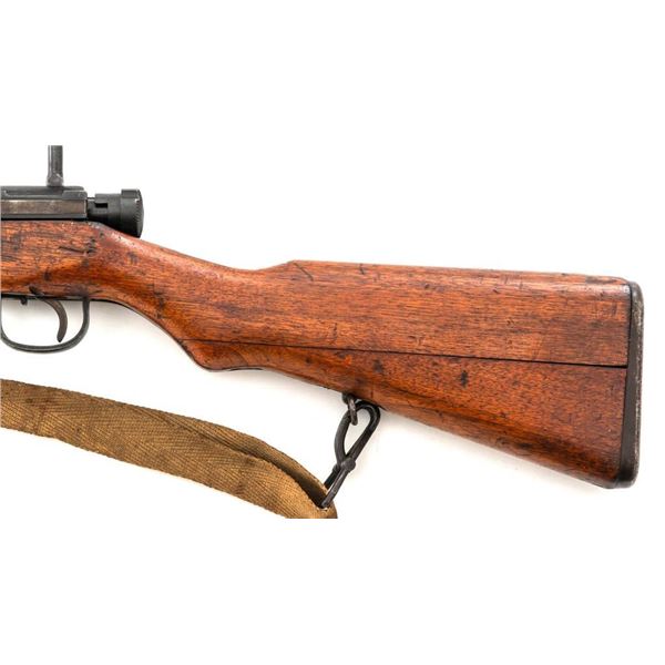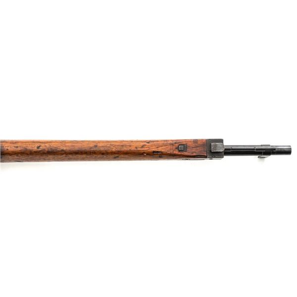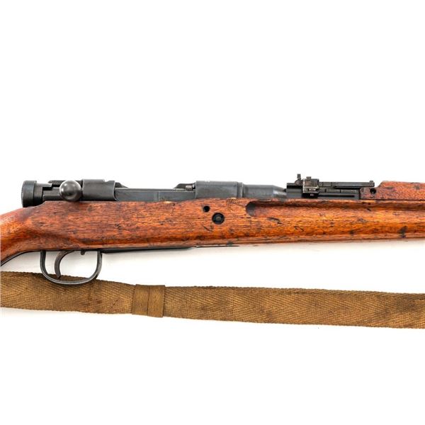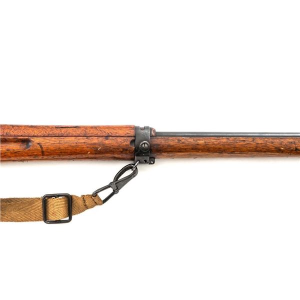 Rare Long Japanese Type 99 Arisaka Bolt Action Rifle, #292, 7.7x58mm cal., 31" barrel, blued finish, hardwood stock and handguard with two-piece buttstock, inverted-"V" front sight, and adjustable folding leaf rear sight with aperture and anti-aircraft wings, graduated to 1500 meters. Includes a steel cleaning rod and tan cotton sling, that may be from a Japanese machine gun. Sling has two sewn cotton keepers and two spring loaded steel clips, in good used condition, showing areas of staining and soiling. Top of the receiver ring is marked with intact Mum over Japanese characters for "99 Type". Left side receiver rail is marked with the symbol for the Nagoya Arsenal. Matching number on the bayonet lug. Bolt is numbered "929". No visible import marks. Condition overall is very good, retaining approx. 90% toning blue, with scratches to the trigger guard, and patina to the buttplate. Wood is good, showing general bruises, scratches, and darkening to the finish. Action operates smoothly. Bore is bright with very good rifling. Est:$700-$900. (C&R)