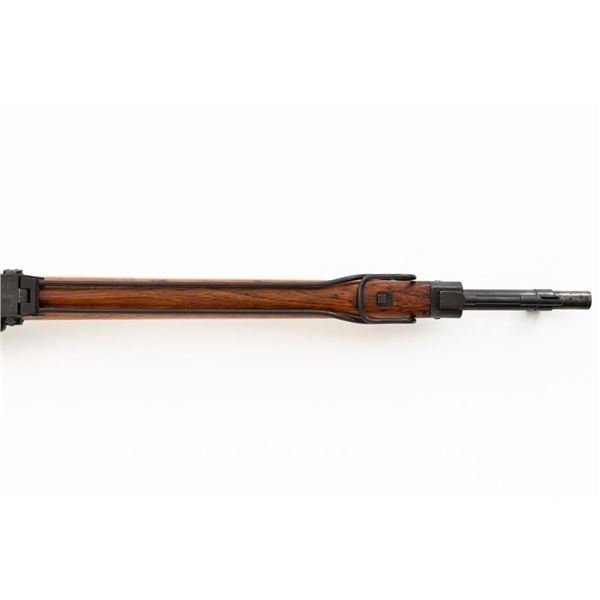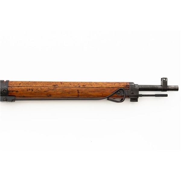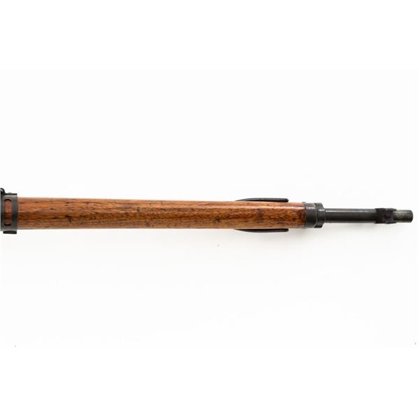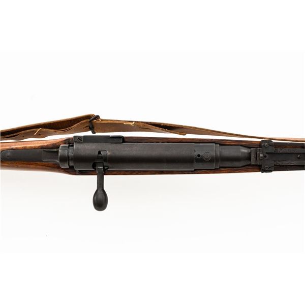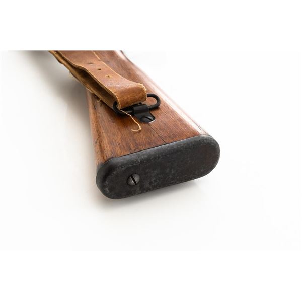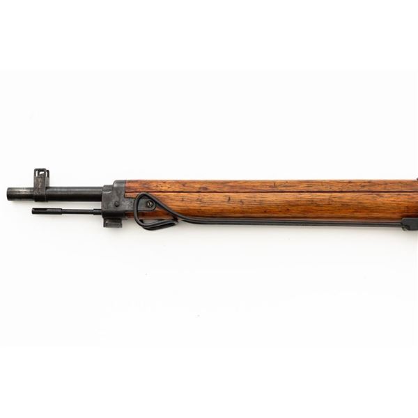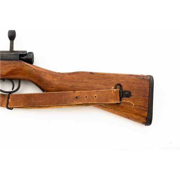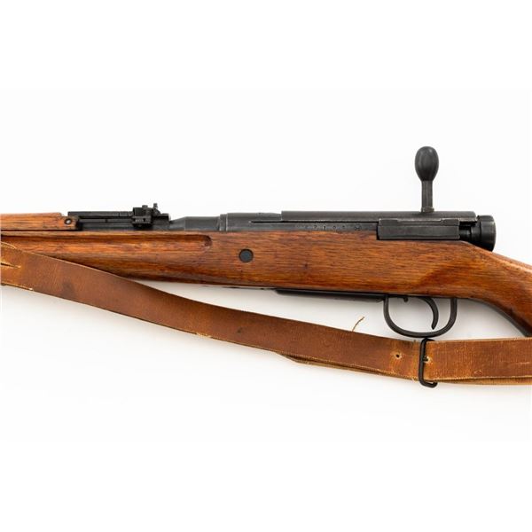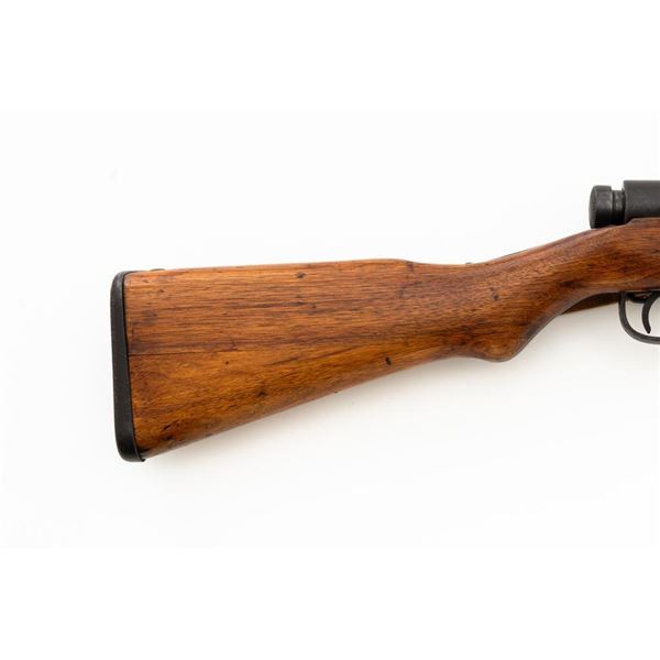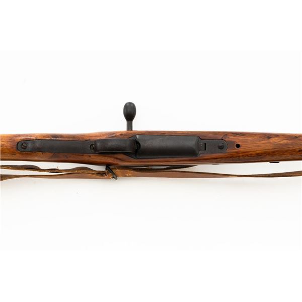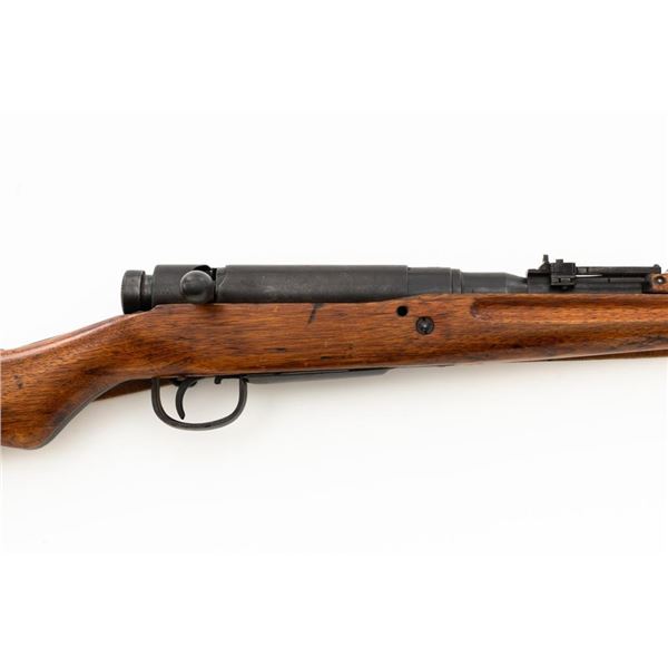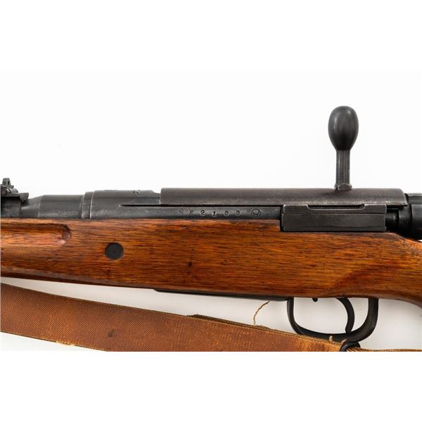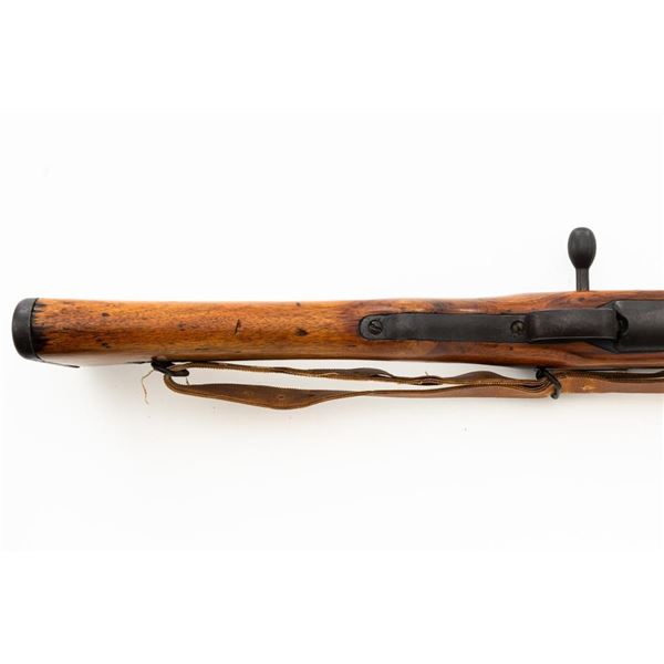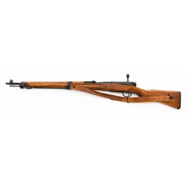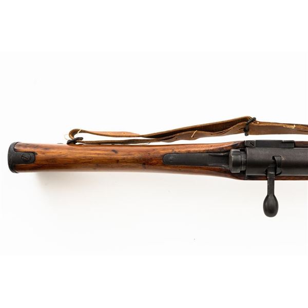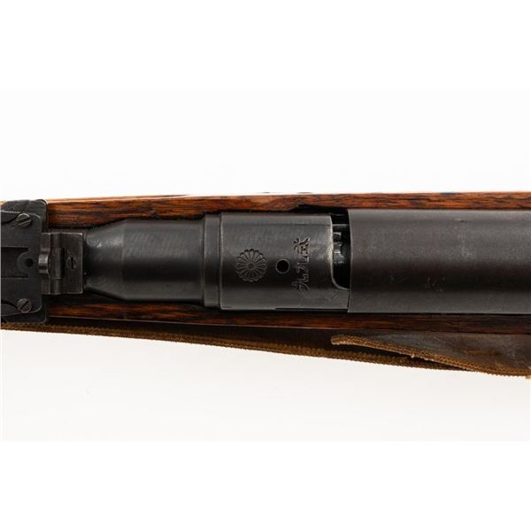 Japanese Type 99 Arisaka Bolt Action Rifle, #62100, 7.7x58mm cal., 25.5" barrel, blued finish, hardwood stock with handguard and two-piece buttstock, inverted-"V" front sight with protectors, and adjustable folding leaf rear sight with aperture, battle sight, and folding anti-aircraft wings, graduated to 1500 meters. Includes steel cleaning rod, original folding bipod, and an original brown colored rubberized sling. Sling is in good condition. Top of receiver ring with intact Imperial Mum crest over three characters for "99 type". Left side receiver rail is stamped with a first series mark and Nagoya Arsenal symbol.Matching numbers except for dust cover. No visible import marks. Condition overall is very good, retaining approx. 85%-90% blue, with toning to the trigger guard/magazine floorplate, and patina to the buttplate. Wood has been sanded and stained over old handling marks, now in very good condition with light impressions and scratches. Action operates smoothly. Bore is bright with very good, defined rifling. Est.: $500-$700. (C&R)