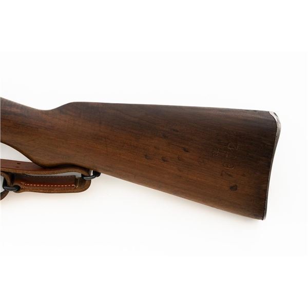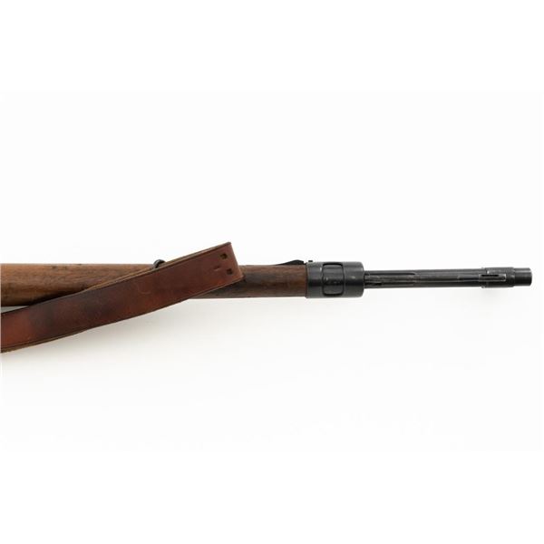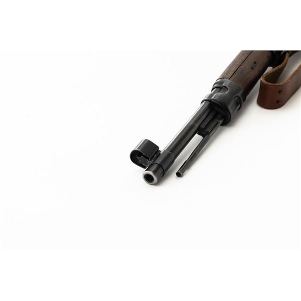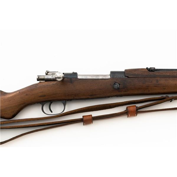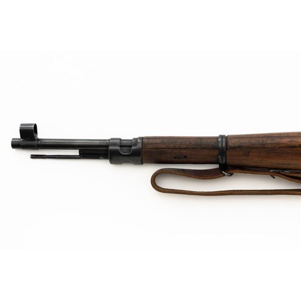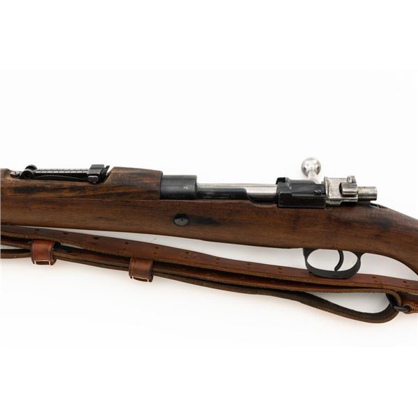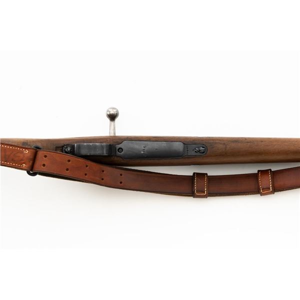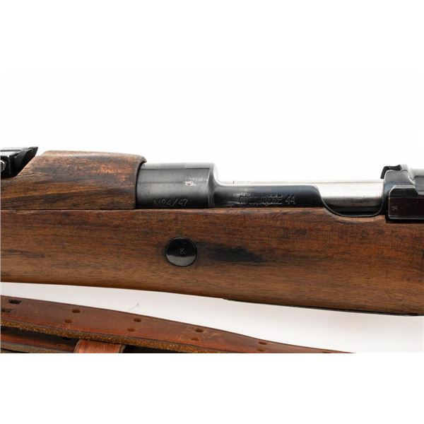Yugoslavian M24/47 Mauser Bolt Action Rifle, #7672, 8x57mm cal., 23.5" barrel, blued finish with bright bolt assembly, hardwood stock and handguard, inverted-"V" front sight with attached hood, and adjustable tangent rear sight with "V"-notched groove, graduated to 2000 meters. Includes steel cleaning rod and commercial M1907 type brown leather, in good used condition, and marked "Gary". Top of the receiver ring is marked with a partially visible Yugoslavian crest, with "M24/47" on the left side. Left side receiver rail is marked with Cyrillic "NPEAY3EKE 44". Left side of the buttstock is stamped "1.TRZ". Matching numbers, trigger guard has been renumbered to match. Import marked on right side of the barrel. Condition overall is fine as arsenal refurbished, retaining approx. 97% blue, showing handling marks to the trigger guard. Bolt assembly shows mild toning. Wood has been arsenal sanded and stained, now in very good condition, with a putty repair to the left side of the buttstock, and a bruise to the forend. Action functions well. Bright bore rates excellent, with well-defined rifling. Est.: $300-$500. (C&R)