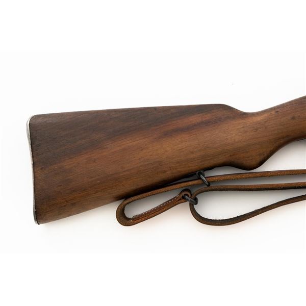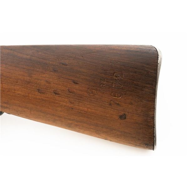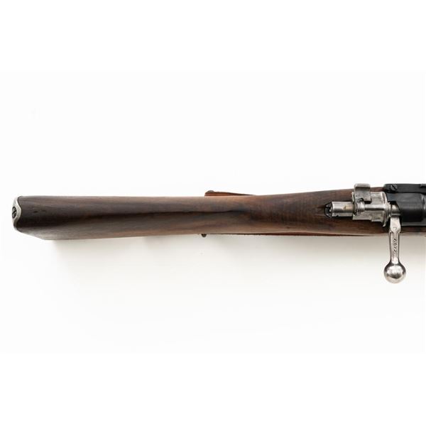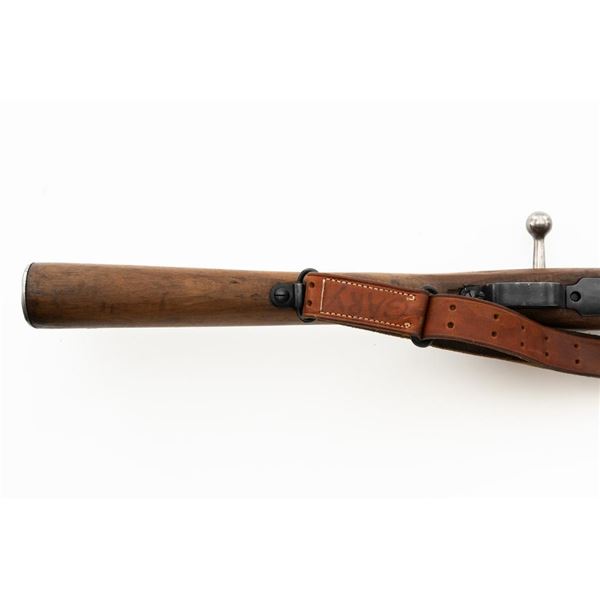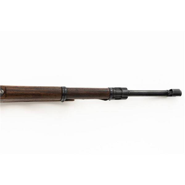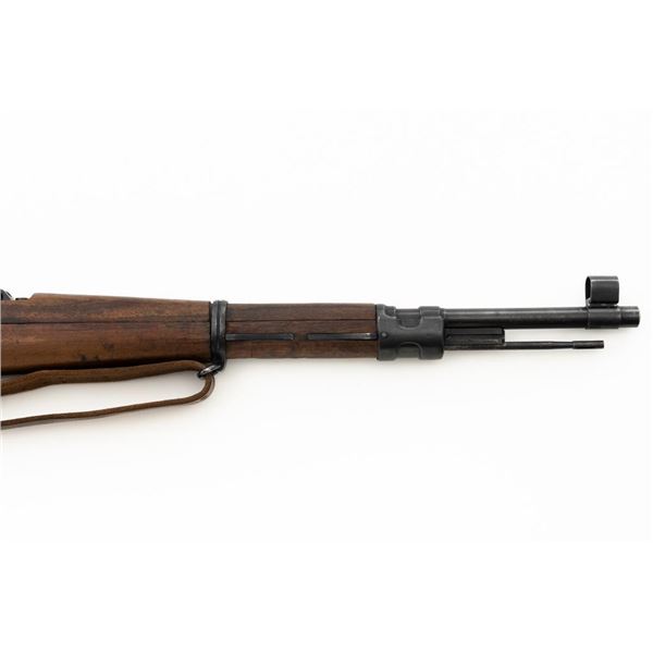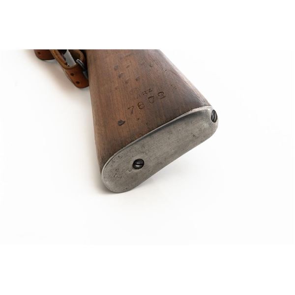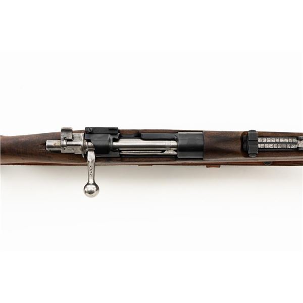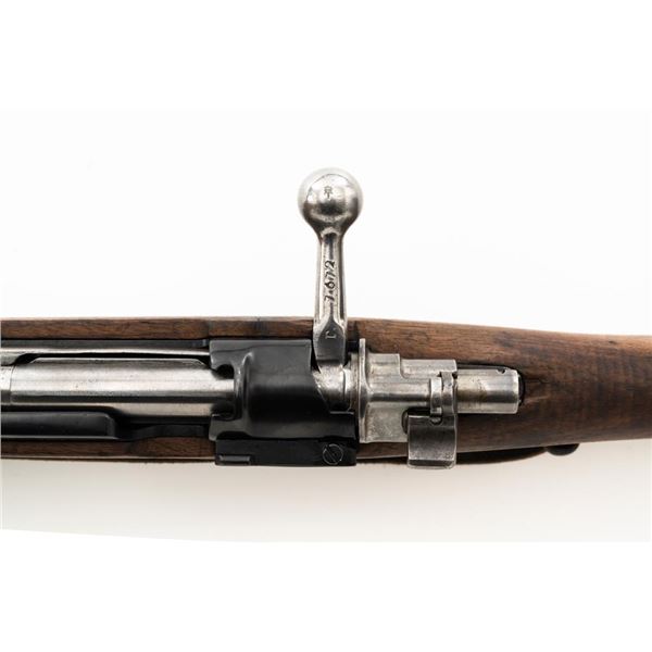Yugoslavian M24/47 Mauser Bolt Action Rifle, #7672, 8x57mm cal., 23.5" barrel, blued finish with bright bolt assembly, hardwood stock and handguard, inverted-"V" front sight with attached hood, and adjustable tangent rear sight with "V"-notched groove, graduated to 2000 meters. Includes steel cleaning rod and commercial M1907 type brown leather, in good used condition, and marked "Gary". Top of the receiver ring is marked with a partially visible Yugoslavian crest, with "M24/47" on the left side. Left side receiver rail is marked with Cyrillic "NPEAY3EKE 44". Left side of the buttstock is stamped "1.TRZ". Matching numbers, trigger guard has been renumbered to match. Import marked on right side of the barrel. Condition overall is fine as arsenal refurbished, retaining approx. 97% blue, showing handling marks to the trigger guard. Bolt assembly shows mild toning. Wood has been arsenal sanded and stained, now in very good condition, with a putty repair to the left side of the buttstock, and a bruise to the forend. Action functions well. Bright bore rates excellent, with well-defined rifling. Est.: $300-$500. (C&R)